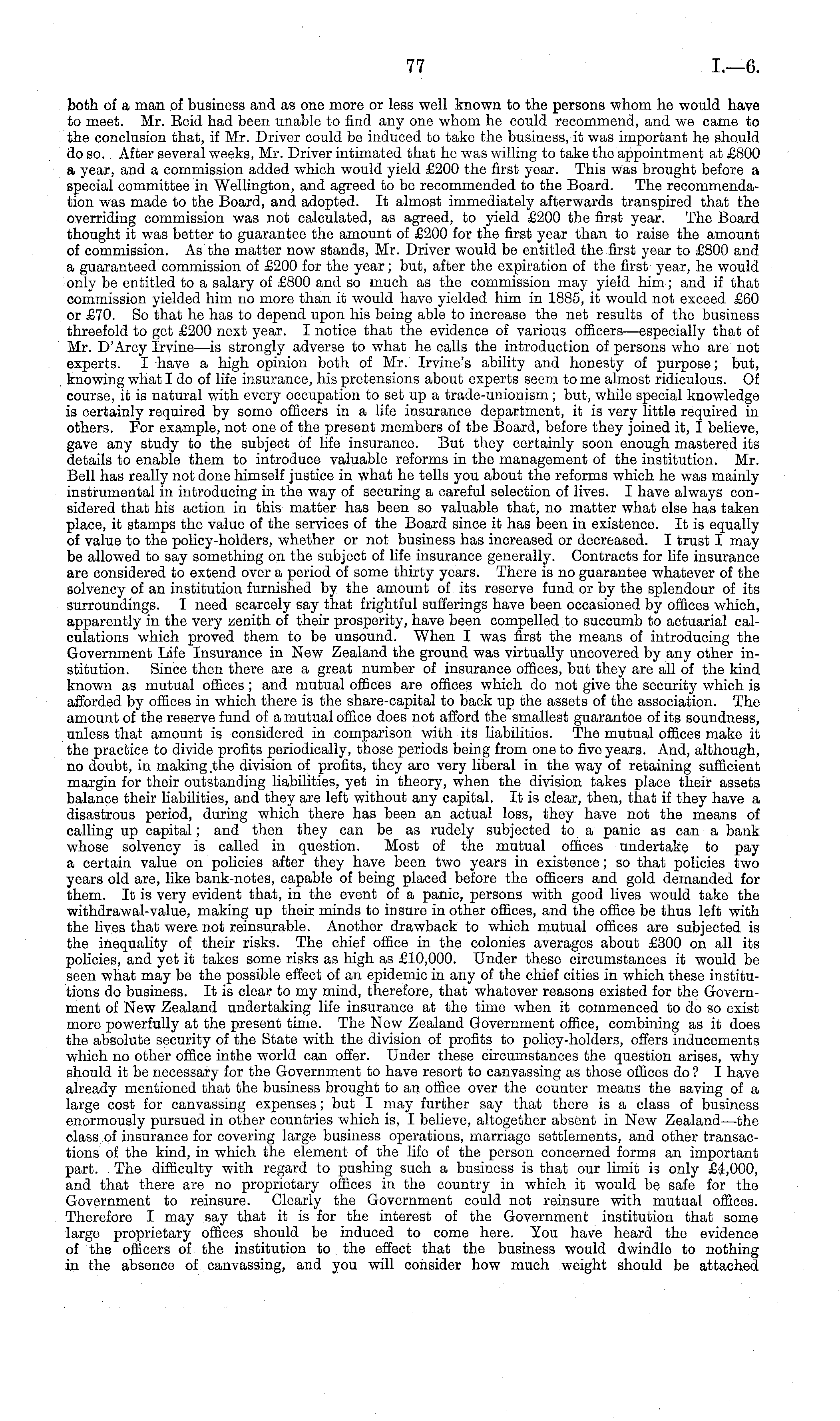 both of a man of business and as one more or less well known to the persons whom he would have to meet. Mr. Eeid had been unable to find any one whom he could recommend, and we came to the conclusion that, if Mr. Driver could be induced to take the business, it was important he should do so. After several weeks, Mr. Driver intimated that he was willing to take the appointment at £800 a year, and a commission added which would yield £200 the first year. This was brought before a special committee in Wellington, and agreed to be recommended to the Board. The recommendation was made to the Board, and adopted. It almost immediately afterwards transpired that the overriding commission was not calculated, as agreed, to yield £200 the first year. The Board thought it was better to guarantee the amount of £200 for the first year than to raise the amount of commission. As the matter now stands, Mr. Driver would be entitled the first year to £800 and a guaranteed commission of £200 for the year; but, after the expiration of the first year, he would only be entitled to a salary of £800 and so much as the commission may yield him; and if that commission yielded him no more than it would have yielded him in 1885, it would not exceed £60 or £70. So that he has to depend upon his being able to increase the net results of the business threefold to get £200 next year. I notice that the evidence of various officers —especially that of Mr. D'Arcy Irvine —is strongly adverse to what he calls the introduction of persons who are not experts. I have a high opinion both of Mr. Irvine's ability and honesty of purpose; but, knowing what Ido of life insurance, his pretensions about experts seem tome almost ridiculous. Of course, it is natural with every occupation to set up a trade-unionism; but, while special knowledge is certainly required by some officers in a life insurance department, it is very little required in others. For example, not one of the present members of the Board, before they joined it, I believe, gave any study to the subject of life insurance. But they certainly soon enough mastered its details to enable them to introduce valuable reforms in the management of the institution. Mr. Bell has really not done himself justice in what he tells you about the reforms which he was mainly instrumental in introducing in the way of securing a careful selection of lives. I have always considered that his action in this matter has been so valuable that, no matter what else has taken place, it stamps the value of the services of the Board since it has been in existence. It is equally of value to the policy-holders, whether or not business has increased or decreased. I trust I may be allowed to say something on the subject of life insurance generally. Contracts for life insurance are considered to extend over a period of some thirty years. There is no guarantee whatever of the solvency of an institution furnished by the amount of its reserve fund or by the splendour of its surroundings. I need scarcely say that frightful sufferings have been occasioned by offices which, apparently in the very zenith of their prosperity, have been compelled to succumb to actuarial calculations which proved them to be unsound. When I was first the means of introducing the Government Life Insurance in New Zealand the ground was virtually uncovered by any other institution. Since then there are a great number of insurance offices, but they are all of the kind known as mutual offices; and mutual offices are offices which do not give the security which is afforded by offices in which there is the share-capital to back up the assets of the association. The amount of the reserve fund of a mutual office does not afford the smallest guarantee of its soundness, unless that amount is considered in comparison with its liabilities. The mutual offices make it the practice to divide profits periodically, those periods being from one to five years. And, although, no doubt, in making .the division of profits, they are very liberal in the way of retaining sufficient margin for their outstanding liabilities, yet in theory, when the division takes place their assets balance their liabilities, and they are left without any capital. It is clear, then, that if they have a disastrous period, during which there has been an actual loss, they have not the means of calling up capital; and then they can be as rudely subjected to a panic as can a bank whose solvency is called in question. Most of the mutual offices undertake to pay a certain value on policies after they have been two years in existence; so that policies two years old are, like bank-notes, capable of being placed before the officers and gold demanded for them. It is very evident that, in the event of a panic, persons with good lives would take the withdrawal-value, making up their minds to insure in other offices, and the office be thus left with the lives that were not reinsurable. Another drawback to which mutual offices are subjected is the inequality of their risks. The chief office in the colonies averages about £300 on all its policies, and yet it takes some risks as high as £10,000. Under these circumstances it would be seen what may be the possible effect of an epidemic in any of the chief cities in which these institutions do business. It is clear to my mind, therefore, that whatever reasons existed for the Government of New Zealand undertaking life insurance at the time when it commenced to do so exist more powerfully at the present time. The New Zealand Government office, combining as it does the absolute security of the State with the division of profits to policy-holders, offers inducements which no other office inthe world can offer. Under these circumstances the question arises, why should it be necessary for the Government to have resort to canvassing as those offices do ? I have already mentioned that the business brought to an office over the counter means 