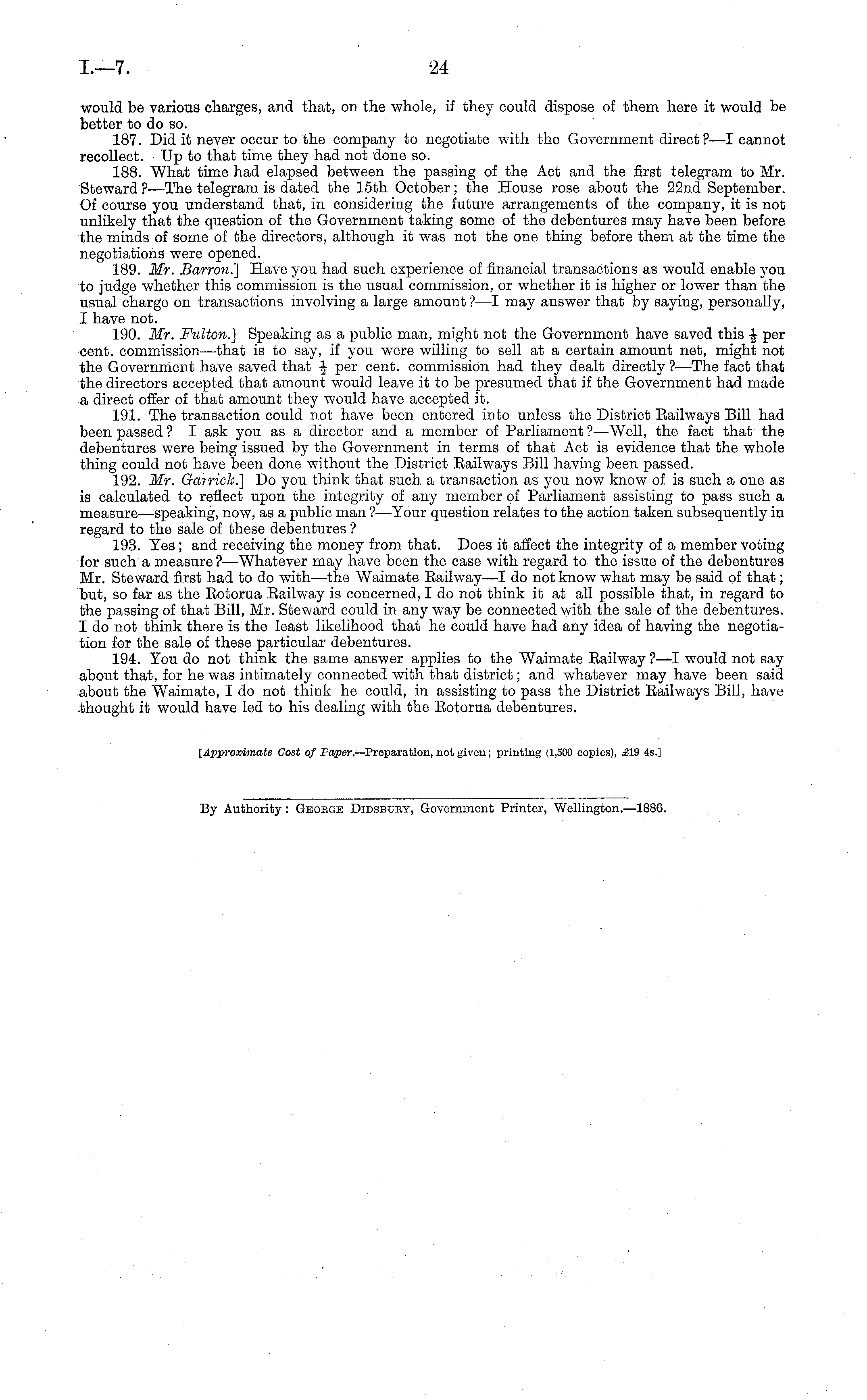 would be various charges, and that, on the whole, if they could dispose of them here it would be better to do so. 187. Did it never occur to the company to negotiate with the Government direct?- —I cannot recollect. Up to that time they had not done so. 188. What time had elapsed between the passing of the Act and the first telegram to Mr. Steward ? —The telegram is dated the 15th October; the House rose about the 22nd September. Of course you understand that, in considering the future arrangements of the company, it is not unlikely that the question of the Government taking some of the debentures may have been before the minds of some of the directors, although it was not the one thing before them at the time the negotiations were opened. 189. Mr. Barron.] Have you had such experience of financial transactions as would enable you to judge whether this commission is the usual commission, or whether it is higher or lower than the usual charge on transactions involving a large amount ? —I may answer that by saying, personally, I have not. 190. Mr. Fulton.] Speaking as a public man, might not the Government have saved this \ per cent, commission—that is to say, if you were willing to sell at a certain amount net, might not the Government have saved that \ per cent, commission had they dealt directly ?—The fact that the directors accepted that amount would leave it to be presumed that if the Government had made a direct offer of that amount they would have accepted it. 191. The transaction could not have been entered into unless the District Eailways Bill had been passed ? I ask you as a director and a member of Earliament ? —Well, the fact that the debentures were being issued by the Government in terms of that Act is evidence that the whole thing could not have been done without the District Eailways Bill having been passed. 192. Mr. Garrick.] Do you think that such a transaction as you now know of is such a one as is calculated to reflect upon the integrity of any member of Parliament assisting to pass such a measure—speaking, now, as a public man ?—Your question relates to the action taken subsequently in regard to the sale of these debentures ? 193. Yes; and receiving the money from that. Does it affect the integrity of a member voting for such a measure ? —Whatever may have been the case with regard to the issue of the debentures Mr. Steward first had to do with—the Waimate Eailway—l do not know what may be said of that; but, so far as the Eotorua Eailway is concerned, I do not think it at all possible that, in regard to the passing of that Bill, Mr. Steward could in any way be connected with the sale of the debentures. I do not think there is the least likelihood that he could have had any idea of having the negotiation for the sale of these particular debentures. 194. You do not think the same answer applies to the Waimate Eailway ? —I would not say about that, for he was intimately connected with that district; and whatever may have been said about the Waimate, I do not think he could, in assisting to pass the District Eailways Bill, have thought it would have led to his dealing with the Eotorua debentures.