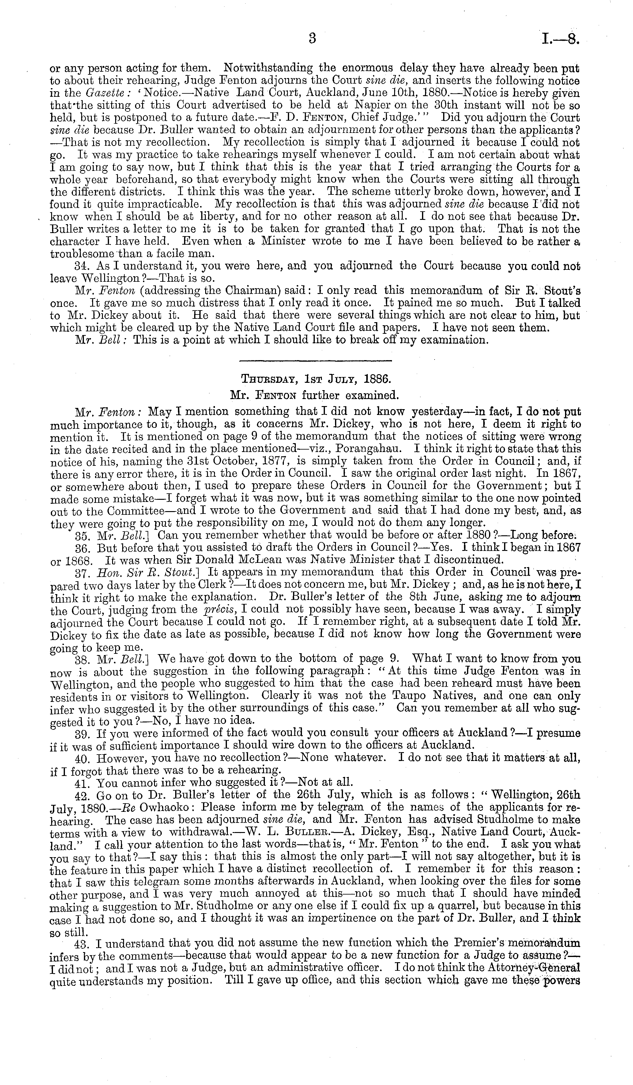 Thuesday, Ist July, 1886. Mr. Fenton further examined. Mr. Fenton: May I mention something that I did not know yesterday—in fact, Ido not put much importance to it, though, as it concerns Mr. Dickey, who is not here, I deem it right to mention it. It is mentioned on page 9of the memorandum that the notices of sitting were wrong in the date recited and in the place mentioned—viz., Porangahau. I think it right to state that this notice of his, naming the 31st October, 1877, is simply taken from the Order in Council; and, if there is any error there, it is in the Order in Council. I saw the original order last night. In 1867, or somewhere about then, I used to prepare these Orders in Council for the Government; but I made some mistake—l forget what it was now, but it was something similar to the one now pointed out to the Committee —and I wrote to the Government and said that I had done my best, and, as they were going to put the responsibility on me, I would not do them any longer. 35. Mr. Bell.] Can you remember whether that would be before or after 1880 ?—Long before. 36. But before that you assisted to draft the Orders in Council? —Yes. I think I began in 1867 or 1868. It was when Sir Donald McLean was Native Minister that I discontinued. 37. Hon. Sir R. Stout.] It appears in my memorandum that this Order in Council was prepared two days later by the Clerk ? —lt does not concern me, but Mr. Dickey ; and, as he is not here, I think it right to make the explanation. Dr. Buller's letter of the Bth June, asking me to adjourn the Court, judging from the precis, I could not possibly have seen, because I was away. I simply adjourned the Court because I could not go. If I remember right, at a subsequent date I told Mr. Dickey to fix the date as late as possible, because I did not know how long the Government were going to keep me. 38. Mr. Bell.] We have got down to the bottom of page 9. What I want to know from you now is about the suggestion in the following paragraph: "At this time Judge Fenton was in Wellington, and the people who suggested to him that the case had been reheard must have been residents in or visitors to Wellington. Clearly it was not the Taupo Natives, and one can only infer who suggested it by the other surroundings of this case." Can you remember at all who suggested it to you ? —No, I have no idea. 39. If you were informed of the fact would you consult your officers at Auckland ?—I presume if it was of sufficient importance I should wire down to the officers at Auckland. 40. However, you have no recollection? —None whatever. Ido not see that it matters at all, if I forgot that there was to be a rehearing. 41. You cannot infer who suggested it ?—Not at all. 42. Go on to Dr. Buller's letter of the 26th July, which is as follows : " Wellington, 26th July, 1880. — Re Owhaoko: Please inform me by telegram of the names of the applicants for rehearing. The case has been adjourned sine die, and Mr. Fenton has advised Studholme to make terms with a view to withdrawal. —W. L. Bullee.—A. Dickey, Esq., Native Land Court, Auckland." I call your attention to the last words—that is, " Mr. Fenton "to the end. I ask you what you say to that ? —I say this : that this is almost the only part—l will not say altogether, but it is the feature in this paper which I have a distinct recollection of. I remember it for this reason : that I saw this telegram some months afterwards in Auckland, when looking over the files for some other purpose, and I was very much annoyed at this—not so much that I should have minded making a suggestion to Mr. Studholme or any one else if I could fix up a quarrel, but because in this case I had not done so, and I thought it was an impertinence on the part of Dr. Buller, and I think so still. 43. I understand that you did not assume the new function which the Premier's memorandum infers by the comments —because that would appear to be a new function for a Judge to assume ?— I didnot; and I was not a Judge, but an administrative officer. Ido not think the Attorney-General quite understands my position. Till I gave up office, and this section which gave me these powers