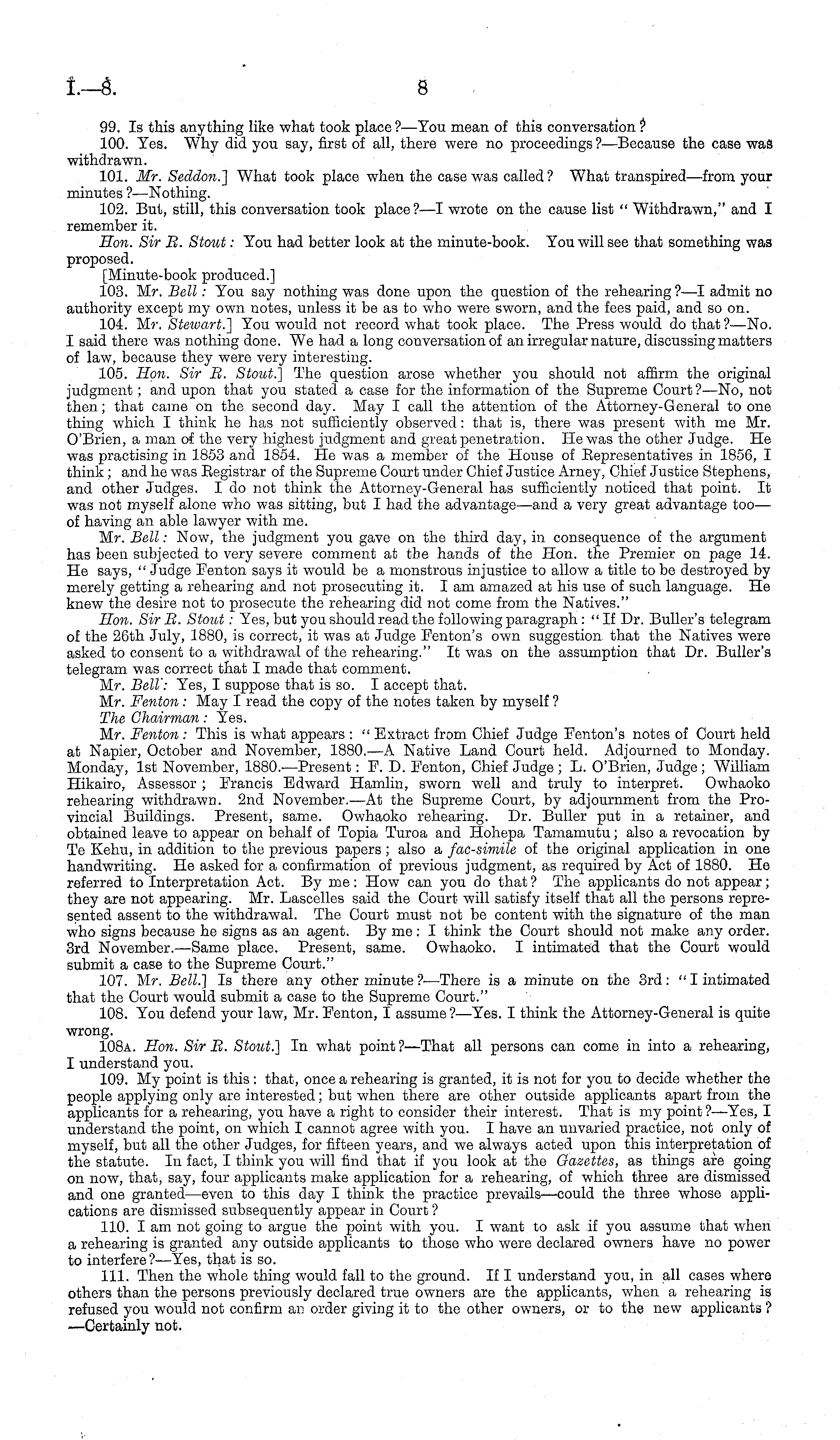 99. Is this anything like what took place ?—You mean of this conversation ? 100. Yes. Why did you say, first of all, there were no proceedings ?—Because the case was withdrawn. 101. Mr. Seddon.] What took place when the case was called? What transpired—from your minutes ?—Nothing. 102. But, still, this conversation took place? —I wrote on the cause list " Withdrawn," and I remember it. Hon. Sir R. Stout: You had better look at the minute-book. You will see that something was proposed. [Minute-book produced.] 103. Mr. Bell: You say nothing was done upon the question of the rehearing ?—I admit no authority except my own notes, unless it be as to who were sworn, and the fees paid, and so on. 104. Mr. Stewart.] You would not record what took place. The Press would do that?— No. I said there was nothing done. We had a long conversation of an irregular nature, discussing matters of law, because they were very interesting. 105. Hon. Sir R. Stout.] The question arose whether you should not affirm the original judgment; and upon that you stated a case for the information of the Supreme Court ?—No, not then; that came on the second day. May I call the attention of the Attorney-General to one thing which I think he has not sufficiently observed: that is, there was present with me Mr. O'Brien, a man of the very highest judgment and great penetration. He was the other Judge. He was practising in 1853 and 1854. fie was a member of the House of Bepresentatives in 1856, I think; and he was Begistrar of the Supreme Court under Chief Justice Arney, Chief Justice Stephens, and other Judges. Ido not think the Attorney-General has sufficiently noticed that point. It was not myself alone who was sitting, but I had the advantage—and a very great advantage too— of having an able lawyer with me. Mr. Bell: Now, the judgment you gave on the third day, in consequence of the argument has been subjected to very severe comment at the hands of the Hon. the Premier on page 14. He says, " Judge Fenton says it would be a monstrous injustice to allow a title to be destroyed by merely getting a rehearing and not prosecuting it. lam amazed at his use of such language. He knew the desire not to prosecute the rehearing did not come from the Natives." Hon. Sir R. Stout: Yes, but you should read the following paragraph: "If Dr. Buller's telegram of the 26th July, 1880, is correct, it was at Judge Fenton's own suggestion that the Natives were asked to consent to a withdrawal of the rehearing." It was on the assumption that Dr. Buller's telegram was correct that I made that comment. Mr. Bell': Yes, I suppose that is so. I accept that. Mr. Fenton : May I read the copy of the notes taken by myself ? The Chairman: Yes. Mr. Fenton : This is what appears : " Extract from Chief Judge Fenton's notes of Court held at Napier, October and November, 1880.—A Native Land Court held. Adjourned to Monday. Monday, Ist November, 1880.—Present: F. D. Fenton, Chief Judge ; L. O'Brien, Judge ; William Hikairo, Assessor ; Francis Edward Hamlin, sworn well and truly to interpret. Owhaoko rehearing withdrawn. 2nd November.—At the Supreme Court, by adjournment from the Provincial Buildings. Present, same. Owhaoko rehearing. Dr. Buller put in a retainer, and obtained leave to appear on behalf of Topia Turoa and Hohepa Tamamutu; also a revocation by Te Kehu, in addition to the previous papers; also a facsimile of the original application in one handwriting. He asked for a confirmation of previous judgment, as required by Act of 1880. He referred to Interpretation Act. By me : How can you do that ? The applicants do not appear; they are not appearing. Mr. Lascelles said the Court will satisfy itself that all the persons represented assent to the withdrawal. The Court must not be content with the signature of the man who signs because he signs as an agent. By me: I think the Court should not make any order. 3rd November. —Same place. Present, same. Owhaoko. I intimated that the Court would submit a case to the Supreme Court." 107. Mr. Bell.] Is there any other minute? —There is a minute on the 3rd: "I intimated that the Court would submit a case to the Supreme Court." 108. You defend your law, Mr. Fenton, I assume?— Yes. I think the Attorney-General is quite wrong. 108 a. Hon. Sir R. Stout.] In what point ?—That all persons can come in into a rehearing, I understand you. 109. My point is this : that, once a rehearing is granted, it is not for you to decide whether the people applying only are interested; but when there are other outside applicants apart from the applicants for a rehearing, you have a right to consider their interest. That is my point ?—Yes, I understand the point, on which I cannot agree with you. I have an unvaried practice, not only of myself, but all the other Judges, for fifteen years, and we always acted upon this interpretation of the statute. In fact, I think you will find that if you look at the Gazettes, as things are going on now, that, say, four applicants make application for a rehearing, of which three are dismissed and one granted—even to this day I think the practice prevails—could the three whose applications are dismissed subsequently appear in Court ? 110. lam not going to argue the point with you. I want to ask if you assume that when a rehearing is granted any outside applicants to those who were declared owners have no power to interfere ?—Yes, that is so. 111. Then the whole thing would fall to the ground. If I understand you, in all cases where others than the persons previously declared true owners are the applicants, when a rehearing is refused you would not confirm an order giving it to the other owners, or to the new applicants ? —Certainly not.