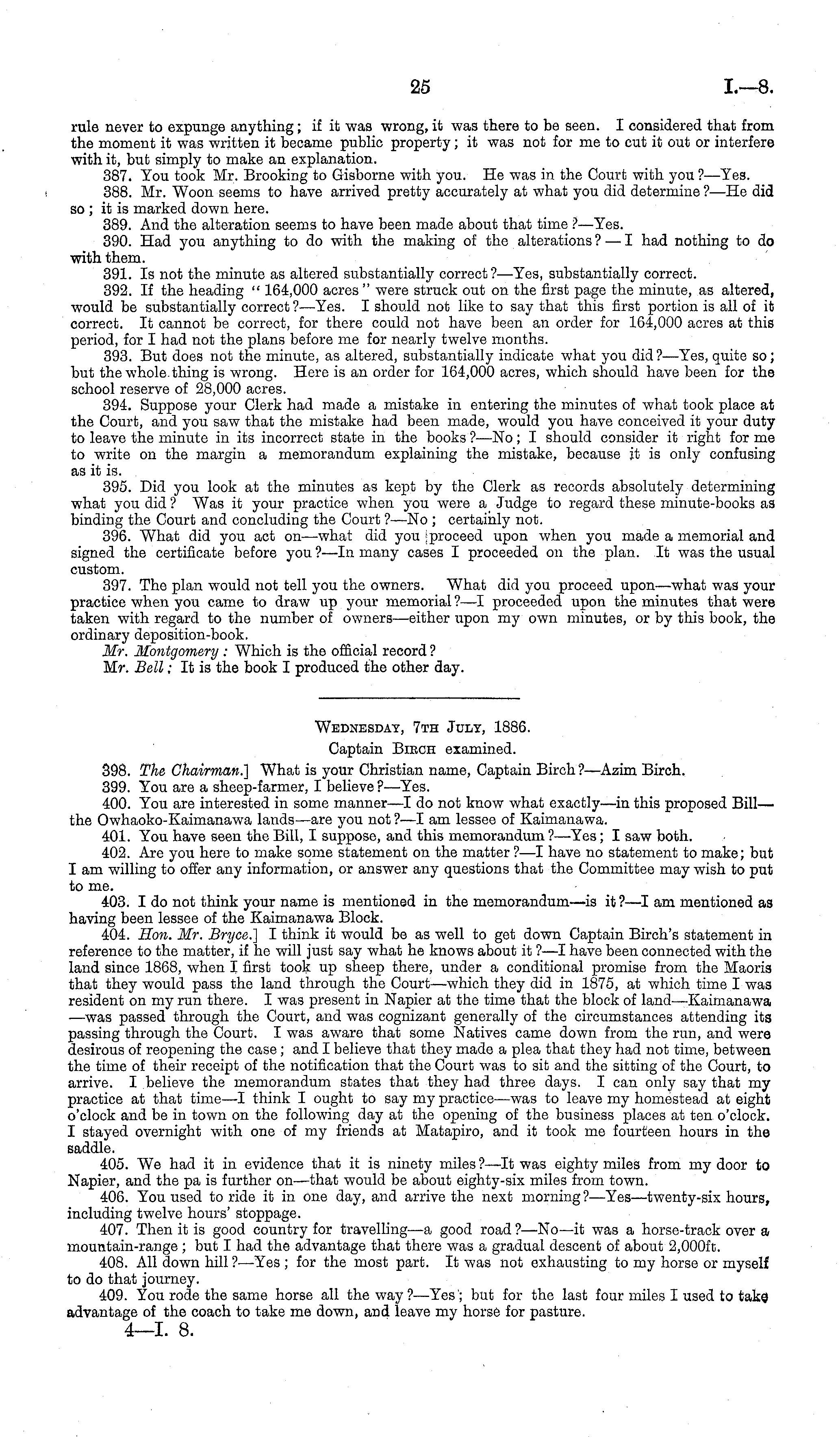 Wednesday, 7th July, 1886. Captain Biech examined. 398. The Chairman.] What is your Christian name, Captain Birch?—Azim Birch. 399. You are a sheep-farmer, I believe ? —Yes. 400. You are interested in some manner—l do not know what exactly—in this proposed Bill— the Owhaoko-Kaimanawa lands—are you not ?—I am lessee of Kaimanawa. 401. You have seen the Bill, I suppose, and this memorandum ? —Yes; I saw both. 402. Are you here to make some statement on the matter ?—I have no statement to make; but I am willing to offer any information, or answer any questions that the Committee may wish to put to me. 403. Ido not think your name is mentioned in the memorandum—is it ?—I am mentioned as having been lessee of the Kaimanawa Block. 404. Hon. Mr. Bryce.] I think it would be as well to get down Captain Birch's statement in reference to the matter, if he will just say what he knows about it ?—I have been connected with the land since 1868, when I first took up sheep there, under a conditional promise from the Maoris that they would pass the land through the Court—which they did in 1875, at which time I was resident on my run there. I was present in Napier at the time that the block of land —Kaimanawa —was passed through the Court, and was cognizant generally of the circumstances attending its passing through the Court. I was aware that some Natives came down from the run, and were desirous of reopening the case; and I believe that they made a plea that they had not time, between the time of their receipt of the notification that the Court was to sit and the sitting of the Court, to arrive. I believe the memorandum states that they had three days. I can only say that my practice at that time—l think I ought to say my practice —was to leave my homestead at eight o'clock and be in town on the following day at the opening of the business places at ten o'clock. I stayed overnight with one of my friends at Matapiro, and it took me fourteen hours in the saddle. 405. We had it in evidence that it is ninety miles?—lt was eighty miles from my door to Napier, and the pa is further on—that would be about eighty-six miles from town. 406. You used to ride it in one day, and arrive the next morning ? —Yes—twenty-six hours, including twelve hours' stoppage. 407. Then it is good country for travelling—a good road?— No—it was a horse-track over a mountain-range; but I had the advantage that there was a gradual descent of about 2,000 ft. 408. All down hill ?—Yes ; for the most part. It was not exhausting to my horse or myself to do that journey. 409. You rode the same horse all the way ?—Yes ; but for the last four miles I used to take advantage of the coach to take me down, and leave my horse for pasture. 4—l. 8.