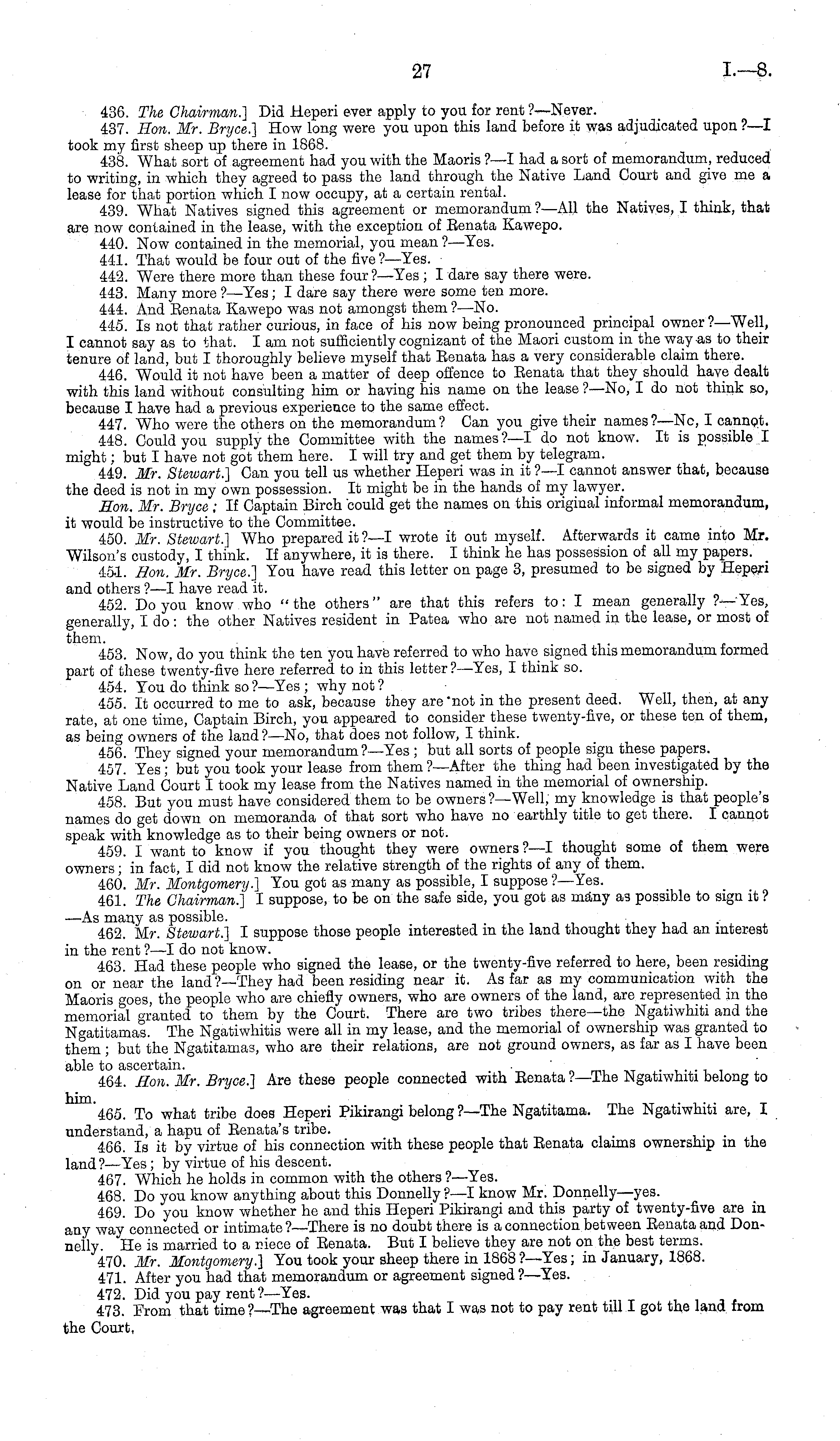 436. The Chairman.] Did Heperi ever apply to you for rent ?—Never. 437. Hon. Mr. Bryce.] How long were you upon this land before it was adjudicated upon ?—I took my first sheep up there in 1868. 438. What sort of agreement had you with the Maoris ?—I had a sort of memorandum, reduced to writing, in which they agreed to pass the land through the Native Land Court and give me a lease for that portion which I now occupy, at a certain rental. 439. What Natives signed this agreement or memorandum ?—All the Natives, I think, that are now contained in the lease, with the exception of Eenata Kawepo. 440. Now contained in the memorial, you mean ?—Yes. 441. That would be four out of the five? —Yes. 442. Were there more than these four ?—Yes ; I dare say there were. 443. Many more ? —Yes; I dare say there were some ten more. 444. And Eenata Kawepo was not amongst them ?—No. 445. Is not that rather curious, in face of his now being pronounced principal owner ?—Well, I cannot say as to that. lam not sufficiently cognizant of the Maori custom in the way as to their tenure of land, but I thoroughly believe myself that Eenata has a very considerable claim there. 446. Would it not have been a matter of deep offence to Eenata that they should have dealt with this land without consulting him or having his name on the lease ?—No, Ido not think so, because I have had a previous experience to the same effect. 447. Who were the others on the memorandum? Can you give their names? —Nc, I cannot. 448. Could you supply the Committee with the names?—l do not know. It is possible I might; but I have not got them here. I will try and get them by telegram. 449. Mr. Stewart.] Can you tell us whether Heperi was in it ?—I cannot answer that, because the deed is not in my own possession. It might be in the hands of my lawyer. Hon. Mr. Bryce ; If Captain Birch could get the names on this original informal memorandum, it would be instructive to the Committee. 450. Mr. Stewart.] Who prepared it ?—I wrote it out myself. Afterwards it came into Mr. Wilson's custody, I think. If anywhere, it is there. I think he has possession of all my papers. 45-1. Hon. Mr. Bryce.] You have read this letter on page 3, presumed to be signed by Heperi and others ? —I have read it. 452. Do you know who "the others" are that this refers to: I mean generally ?—Yes, generally, I do : the other Natives resident in Patea who are not named in the lease, or most of them. 453. Now, do you think the ten you have referred to who have signed this memorandum formed part of these twenty-five here referred to in this letter?— Yes, I think so. 454. You do think so? —Yes; why not? 455. It occurred to me to ask, because they are mot in the present deed. Well, then, at any rate, at one time, Captain Birch, you appeared to consider these twenty-five, or these ten of them, as being owners of the land?—No, that does not follow, I think. 456. They signed your memorandum ?—Yes ; but all sorts of people sign these papers. 457. Yes; but you took your lease from them ?—After the thing had been investigated by the Native Land Court I took my lease from the Natives named in the memorial of ownership. 458. But you must have considered them to be owners ?—Well, my knowledge is that people's names do get down on memoranda of that sort who have no earthly title to get there. I cannot speak with knowledge as to their being owners or not. 459. I want to know if you thought they were owners? —I thought some of them were owners; in fact, I did not know the relative strength of the rights of any of them. 460. Mr. Montgomery.] You got as many as possible, I suppose ? —Yes. 461. The Chairman.] I suppose, to be on the safe side, you got as many a3 possible to sign it ? —As many as possible. 462. Mr. Stewart.] I suppose those people interested in the land thought they had an interest in the rent ?—I do not know. 463. Had these people who signed the lease, or the twenty-five referred to here, been residing on or near the land ?—They had been residing near it. As far as my communication with the Maoris goes, the people who are chiefly owners, who are owners of the land, are represented in the memorial granted to them by the Court. There are two tribes there—the Ngatiwhiti and the Ngatitamas. The Ngatiwhitis were all in my lease, and the memorial of ownership was granted to them ; but the Ngatitamas, who are their relations, are not ground owners, as far as I have been able to ascertain. . . . 464. Hon. Mr. Bryce.] Are these people connected with Benata ?—The Ngatiwhiti belong to 465. To what tribe does Heperi Pikirangi belong ?—The Ngatitama. The Ngatiwhiti are, I understand, a hapu of Eenata's tribe. 466. Is it by virtue of his connection with these people that Eenata claims ownership m the land?— Yes; by virtue of his descent. 467. Which he holds in common with the others ?—Yes. 468. Do you know anything about this Donnelly?—l know Mr. Donnelly—yes. 469. Do you know whether he and this Heperi Pikirangi and this party of twenty-five are in any way connected or intimate ?—There is no doubt there is a connection between Eenata and Donnelly. He is married to a niece of Eenata. But I believe they are not on the best terms. 470. Mr. Montgomery.] You took your sheep there in 1868 ?—Yes; in January, 1868. 471. After you had that memorandum or agreement signed? —Yes. 472. Did you pay rent? —Yes. 473. From that time?— The agreement was that I was not to pay rent till I got the land from the Court,