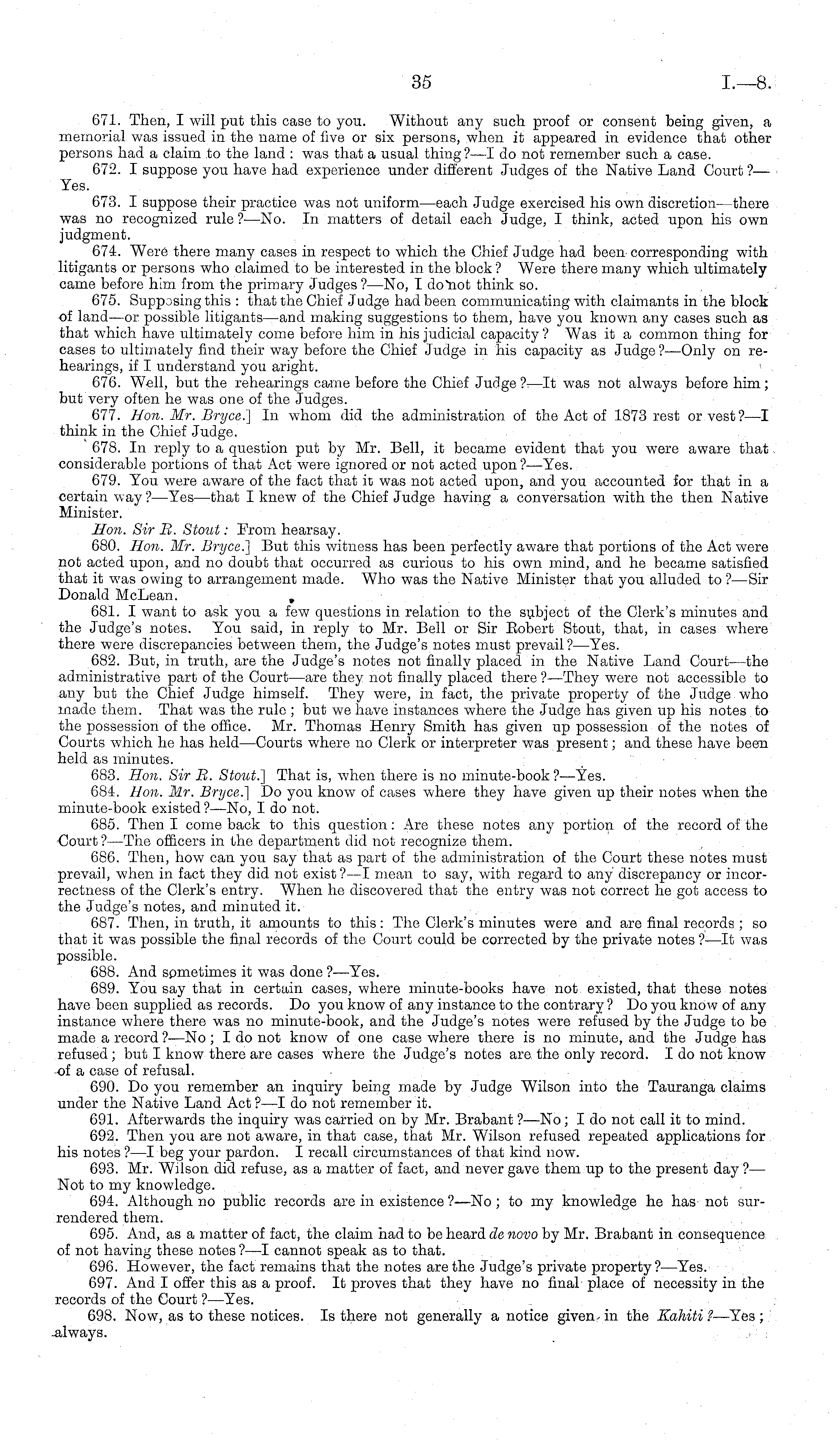 671. Then, I will put this case to you. Without any such proof or consent being given, a memorial was issued in the name of five or six persons, when it appeared in evidence that other persons had a claim to the land : was that a usual thing?—l do not remember such a case. 672. I suppose you have had experience under different Judges of the Native Land Court ?— Yes. 673. I suppose their practice was not uniform —each Judge exercised his own discretion —there was no recognized rule ? —No. In matters of detail each Judge, I think, acted upon his own judgment. 674. Were there many cases in respect to which the Chief Judge had been corresponding with litigants or persons who claimed to be interested in the block ? Were there many which ultimately came before him from the primary Judges?—No, I doYiot think so. 675. Suppasing this : that the Chief Judge had been communicating with claimants in the block of land—or possible litigants—and making suggestions to them, have you known any cases such as that which have ultimately come before him in his judicial capacity ? Was it a common thing for cases to ultimately find their way before the Chief Judge in his capacity as Judge?— Only on rehearings, if I understand you aright. 676. Well, but the rehearings came before the Chief Judge ? —lt was not always before him; but very often he was one of the Judges. 677. Hon. Mr. Bryce.] In whom did the administration of the Act of 1873 rest or vest?—l think in the Chief Judge. 678. In reply to a question put by Mr. Bell, it became evident that you were aware that considerable portions of that Act were ignored or not acted upon ?—Yes. 679. You were aware of the fact that it was not acted upon, and you accounted for that in a certain way ?—Yes —that I knew of the Chief Judge having a conversation with the then Native Minister. Hon. Sir R. Stout: From hearsay. 680. Hon. Mr. Bryce.] But this witness has been perfectly aware that portions of the Act were not acted upon, and no doubt that occurred as curious to his own mind, and he became satisfied that it was owing to arrangement made. Who was the Native Minister that you alluded to ? —Sir Donald McLean. . 681. I want to ask you a few questions in relation to the subject of the Clerk's minutes and the Judge's notes. You said, in reply to Mr. Bell or Sir Eobert Stout, that, in cases where there were discrepancies between them, the Judge's notes must prevail?— Yes. 682. But, in truth, are the Judge's notes not finally placed in the Native Land Court—the administrative part of the Court —are they not finally placed there ? —They were not accessible to any but the Chief Judge himself. They were, in fact, the private property of the Judge who made them. That was the rule ; but we have instances where the Judge has given up his notes, to the possession of the office. Mr. Thomas Henry Smith has given up possession of the notes of Courts which he has held —Courts where no Clerk or interpreter was present; and these have been held as minutes. 683. Hon. Sir R. Stout.] That is, when there is no minute-book ? —Yes. 684. Hon. Mr. Bryce.] Do you know of cases where they have given up their notes when the minute-book existed?—No, I do not. 685. Then I come back to this question : Are these notes any 7 portion of the record of the Court ?—The officers in the department did not recognize them. 686. Then, how can you say that as part of the administration of the Court these notes must prevail, when in fact they did not exist? —I mean to say, with regard to any discrepancy or incorrectness of the Clerk's entry. When he discovered that the entry was not correct he got access to the Judge's notes, and minuted it. 687. Then, in truth, it amounts to this: The Clerk's minutes were and are final records ; so that it was possible the final records of the Court could be corrected by the private notes ? —lt was possible. 688. And sometimes it was done ? —Yes. 689. You say that in certain cases, where minute-books have not existed, that these notes have been supplied as records. Do you know of any instance to the contrary ? Do you know of any instance where there was no minute-book, and the Judge's notes were refused by the Judge to be made a record ?—No ; I do not know of one case where there is no minute, and the Judge has refused; but I know there are cases where the Judge's notes are the only record. Ido not know -of a case of refusal. 690. Do you remember an inquiry being made by Judge Wilson into the Tauranga claims under the Native Land Act ? —I do not remember it. 691. Afterwards the inquiry was carried on by Mr. Brabant ?—No ; I do not call it to mind. 692. Then you are not aware, in that case, that Mr. Wilson refused repeated applications for his notes ? —I beg your pardon. I recall circumstances of that kind now. 693. Mr. Wilson did refuse, as a matter of fact, and never gave them up to the present day ? — Not to my knowledge. 694. Although no public records are in existence ?—No ; to my knowledge he has not surrendered them. 695. And, as a matter of fact, the claim had to be heard de novo by Mr. Brabant in consequence of not having these notes ?—I cannot speak as to that. 696. However, the fact remains that the notes are the Judge's private property?— Yes. 697. And I offer this as a proof. It proves that they have no final place of necessity in the records of the Court ?—Yes. 698. Now, as to these notices. Is there not generally a notice given in the Kahiti ? —Yes; ..always.