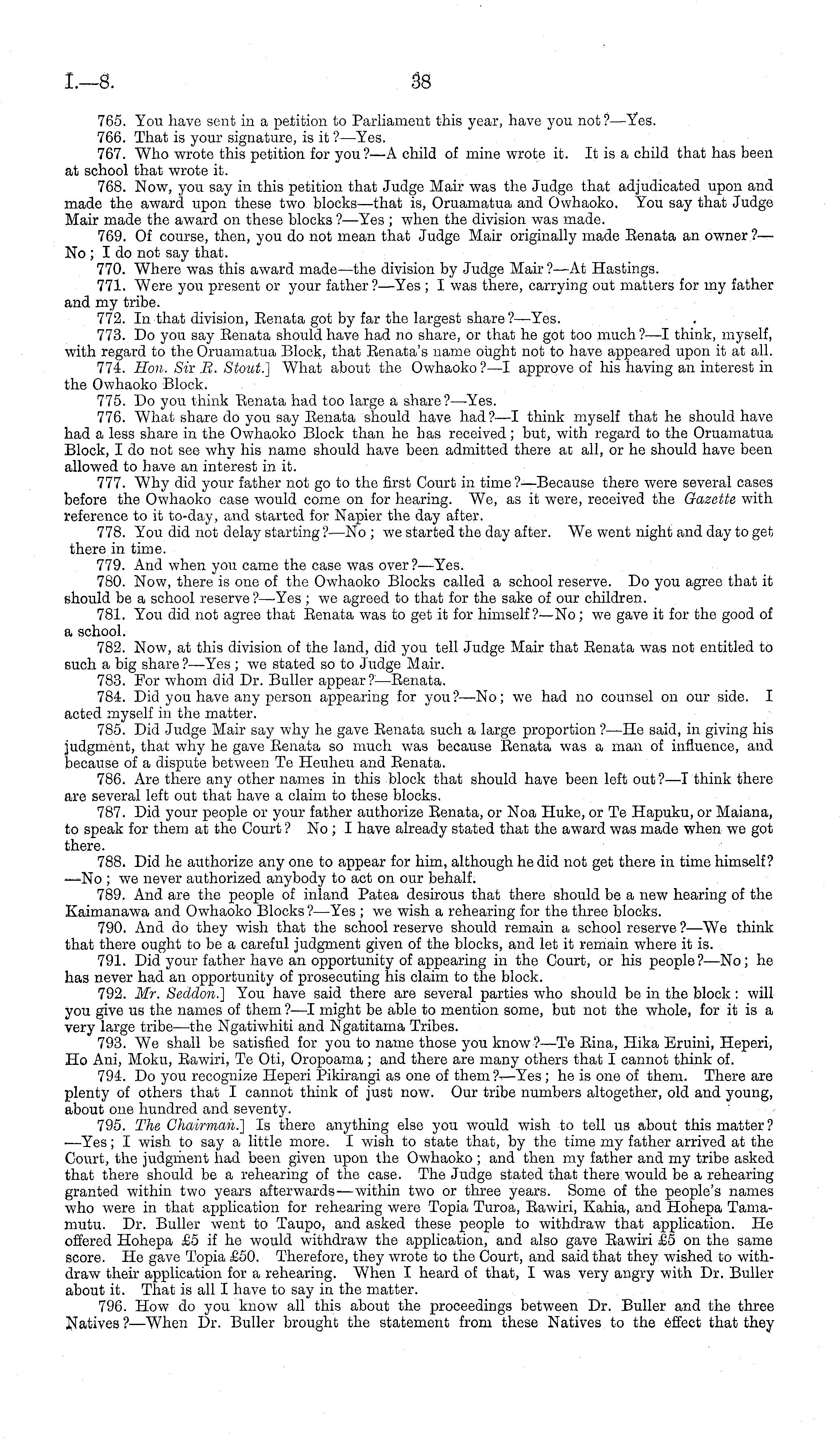 765. You have sent in a petition to Parliament this year, have you not?— Yes. 766. That is your signature, is it ?—Yes. 767. Who wrote this petition for you?—A child of mine wrote it. It is a child that has been at school that wrote it. 768. Now, you say in this petition that Judge Mair was the Judge that adjudicated upon and made the award upon these two blocks—that is, Oruamatua and Owhaoko. You say that Judge Mair made the award on these blocks ?—Yes ; when the division was made. 769. Of course, then, you do not mean that Judge Mair originally made Benata an owner ?— No ; I do not say that. 770. Where was this award made—the division by Judge Mair ?—At Hastings. 771. Were you present or your father ?—Yes ; I was there, carrying out matters for my father and my tribe. 772. In that division, Benata got by far the largest share ?—Yes. 773. Do you say Benata should have had no share, or that he got too much?—l think, myself, with regard to the Oruamatua Block, that Eenata's name ought not to have appeared upon it at all. 774. Hon. Sir R. Stout.] What about the Owhaoko ?—I approve of his having an interest in the Owhaoko Block. 775. Do you think Eenata had too large a share ?—Yes. 776. What share do you say Benata should have had?—l think myself that he should have had a less share in the Owhaoko Block than he has received; but, with regard to the Oruamatua Block, I do not see why his name should have been admitted there at all, or he should have been allowed to have an interest in it. 777. Why did your father not go to the first Court in time ?—Because there were several cases before the Owhaoko case would come on for hearing. We, as it were, received the Gazette with reference to it to-day, and started for Napier the day after. 778. You did not delay starting ?—No; we started the day after. We went night and day to get there in time. 779. And when you came the case was over?— Yes. 780. Now, there is one of the Owhaoko Blocks called a school reserve. Do you agree that it should be a school reserve ?—Yes ; we agreed to that for the sake of our children. 781. You did not agree that Benata was to get it for himself ?—No; we gave it for the good of a school. 782. Now, at this division of the land, did you tell Judge Mair that Benata was not entitled to such a big share ?—Yes ; we stated so to Judge Mair. 783. For whom did Dr. Buller appear? —Benata. 784. Did you have any person appearing for you? —No; we had no counsel on our side. I acted myself in the matter. 785. Did Judge Mair say why he gave Benata such a large proportion ?—He said, in giving his judgment, that why he gave Benata so much was because Benata was a man of influence, and because of a dispute between Te Heuheu and Eenata. 786. Are there any other names in this block that should have been left out? —I think there are several left out that have a claim to these blocks. 787. Did your people or your father authorize Eenata, or Noa Huke, or Te Hapuku, or Maiana, to speak for them at the Court ? No ; I have already stated that the award was made when we got there. 788. Did he authorize any one to appear for him, although he did not get there in time himself? ■ —No ; we never authorized anybody to act on our behalf. 789. And are the people of inland Patea desirous that there should be a new hearing of the Kaimanawa and Owhaoko Blocks?— Yes ; we wish a rehearing for the three blocks. 790. And do they wish that the school reserve should remain a school reserve ?—We think that there ought to be a careful judgment given of the blocks, and let it remain where it is. 791. Did your father have an opportunity of appearing in the Court, or his people?—No; he has never had an opportunity of prosecuting his claim to the block. 792. Mr. Seddon.] You have said there are several parties who should be in the block : will you give us the names of them ?—I might be able to mention some, but not the whole, for it is a very large tribe —the Ngatiwhiti and Ngatitama Tribes. 793. We shall be satisfied for you to name those you know?—Te Bina, Hika Eruini, Heperi, Ho Ani, Moku, Bawiri, Te Oti, Oropoama; and there are many others that I cannot think of. 794. Do you recognize Heperi Pikirangi as one of them ; he is one of them. There are plenty of others that I cannot think of just now. Our tribe numbers altogether, old and young, about one hundred and seventy. 795. The Chairman.] Is there anything else you would wish to tell us about this matter? —Yes; I wish to say a little more. I wish to state that, by the time my father arrived at the Court, the judgment had been given upon the Owhaoko ; and then my father and my tribe asked that there should be a rehearing of the case. The Judge stated that there would be a rehearing granted within two years afterwards —within two or three years. Some of the people's names who were in that application for rehearing were Topia Turoa, Bawiri, Kahia, and Hohepa Tamamutu. Dr. Buller went to Taupo, and asked these people to withdraw that application. He offered Hohepa £5 if he would withdraw the application, and also gave Bawiri £5 on the same score. He gave Topia £50. Therefore, they wrote to the Court, and said that they wished to withdraw their application for a rehearing. When I heard of that, I was very angry with Dr. Buller about it. Tnat is all I have to say in the matter. 796. How do you know all this about the proceedings between Dr. Buller and the three Natives ? —When Dr. Buller brought the statement from these Natives to the effect that they