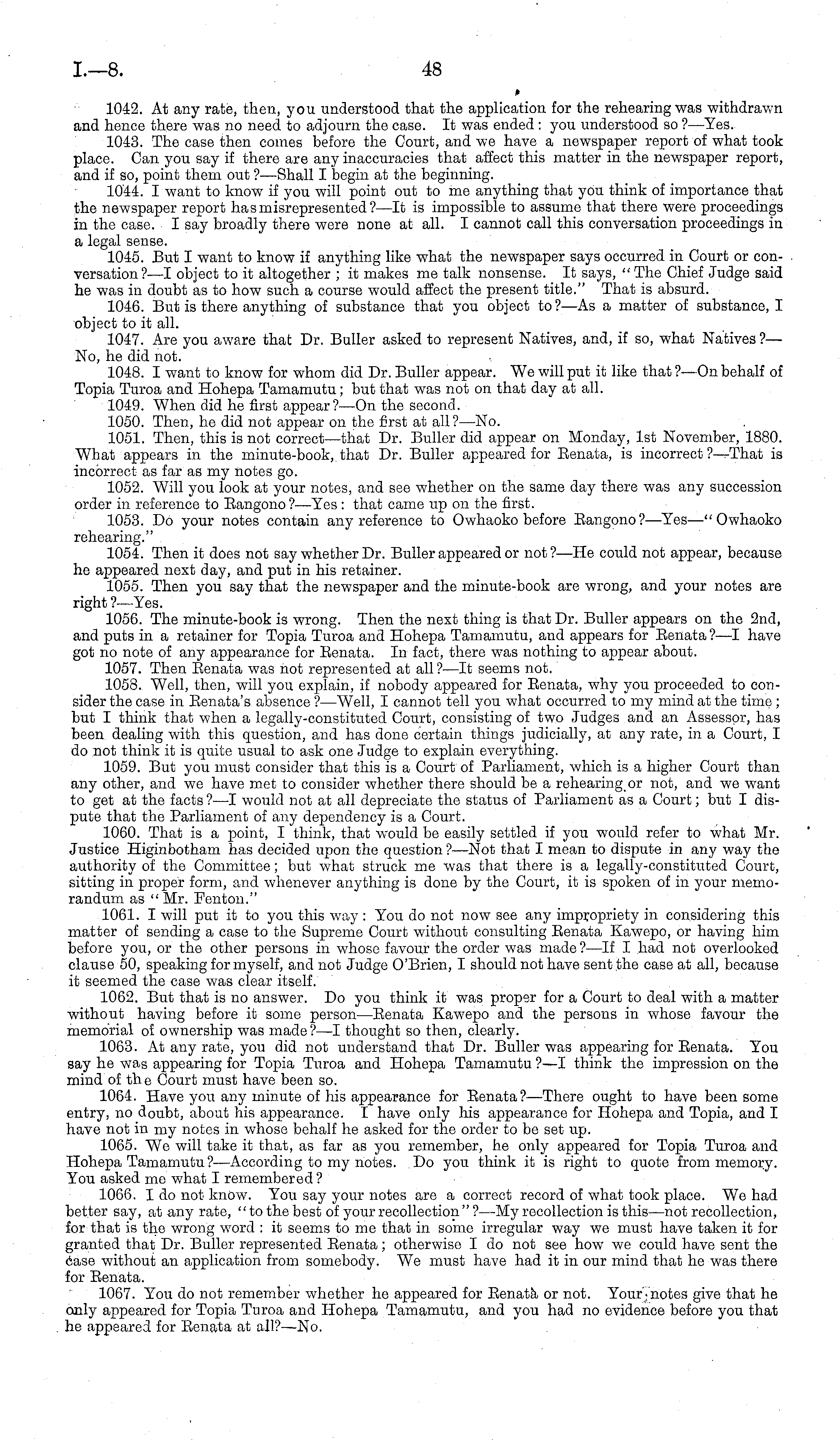 1042. At any rate, then, you understood that the application for the rehearing was withdrawn and hence there was no need to adjourn the case. It was ended : you understood so ? —Yes. 1043. The case then comes before the Court, and we have a newspaper report of what took place. Can you say if there are any inaccuracies that affect this matter in the newspaper report, and if so, point them out ? —Shall I begin at the beginning. 1044. I want to know if you will point out to me anything that you think of importance that the newspaper report has misrepresented?—lt is impossible to assume that there were proceedings in the case. I say broadly there were none at all. I cannot call this conversation proceedings in a legal sense. 1045. But I want to know if anything like what the newspaper says occurred in Court or conversation?—l object to it altogether ;it makes me talk nonsense. It says, "The Chief Judge said he was in doubt as to how such a course would affect the present title." That is absurd. 1046. But is there anything of substance that you object to?—As a matter of substance, I object to it all. 1047. Are you aware that Dr. Buller asked to represent Natives, and, if so, what Natives ?— No, he did not. 1048. I want to know for whom did Dr. Buller appear. We will put it like that ?—On behalf of Topia Turoa and Hohepa Tamamutu; but that was not on that day at all. 1049. When did he first appear?—On the second. 1050. Then, he did not appear on the first at all? —No. 1051. Then, this is not correct—that Dr. Buller did appear on Monday, Ist November, 1880. What appears in the minute-book,, that Dr. Buller appeared for Benata, is incorrect ?—r-That is incorrect as far as my notes go. 1052. Will you look at your notes, and see whether on the same day there was any succession order in reference to Bangono?—Yes : that came up on the first. 1053. Do your notes contain any reference to Owhaoko before Bangono?—Yes—"Owhaoko rehearing." 1054. Then it does not say whether Dr. Buller appeared or not ?—He could not appear, because he appeared next day, and put in his retainer. 1055. Then you say that the newspaper and the minute-book are wrong, and your notes are right ?—Yes. 1056. The minute-book is wrong. Then the next thing is that Dr. Buller appears on the 2nd, and puts in a retainer for Topia Turoa and Hohepa Tamamutu, and appears for Benata?—l have got no note of any appearance for Eenata. In fact, there was nothing to appear about. 1057. Then Eenata was not represented at all ? —lt seems not. 1058. Well, then, will you explain, if nobody appeared for Eenata, why you proceeded to consider the case in Eenata's absence ?—Well, I cannot tell you what occurred to my mind at the time; but I think that when a legally-constituted Court, consisting of two Judges and an Assessor, has been dealing with this question, and has done certain things judicially, at any rate, in a Court, I do not think it is quite usual to ask one Judge to explain everything. 1059. But you must consider that this is a Court of Parliament, which is a higher Court than any other, and we have met to consider whether there should be a rehearing or not, and we want to get at the facts ?—I would not at all depreciate the status of Parliament as a Court; but I dispute that the Parliament of any dependency is a Court. 1060. That is a point, I think, that would be easily settled if you would refer to what Mr. Justice Higinbotham has decided upon the question? —Not that I mean to dispute in any way the authority of the Committee; but what struck me was that there is a legally-constituted Court, sitting in proper form, and whenever anything is done by the Court, it is spoken of in your memorandum as " Mr. Fenton." 1061. I will put it to you this way : You do not now see any impropriety in considering this matter of sending a case to the Supreme Court without consulting Benata Kawepo, or having him before you, or the other persons in whoso favour the order was made ?—lf I had not overlooked clause 50, speaking for myself, and not Judge O'Brien, I should not have sent the case at all, because it seemed the case was clear itself. 1062. But that is no answer. Do you think it was proper for a Court to deal with a matter without having before it some person—Benata Kawepo and the persons in whose favour the memorial of ownership was made?—l thought so then, clearly. 1063. At any rate, you did not understand that Dr. Buller was appearing for Benata. You say he was appearing for Topia Turoa and Hohepa Tamamutu?—l think the impression on the mind of th c Court must have been so. 1064. Have you any minute of his appearance for Benata?—There ought to have been some entry, no doubt, about his appearance. I have only his appearance for Hohepa and Topia, and I have not in my notes in whose behalf he asked for the order to be set up. 1065. We will take it that, as far as you remember, he only appeared for Topia Turoa and Hohepa Tamamutu ?—According to my notes. Do you think it is right to quote from memory. You asked me what I remembered ? 1066. Ido not know. You say your notes are a correct record of what took place. We had better say, at any rate, "to the best of your recollection"? —My recollection is this—not recollection, for that is the wrong word : it seems to me that in some irregular way we must have taken it for granted that Dr. Buller represented Benata; otherwise I do not see how we could have sent the Case without an application from somebody. We must have had it in our mind that he was there for Benata. 1067. You do not remember whether he appeared for Eenata or not. Your-notes give that he only appeared for Topia Turoa and Hohepa Tamamutu, and you had no evidence before you that he appeared for Eenata at all?—No,