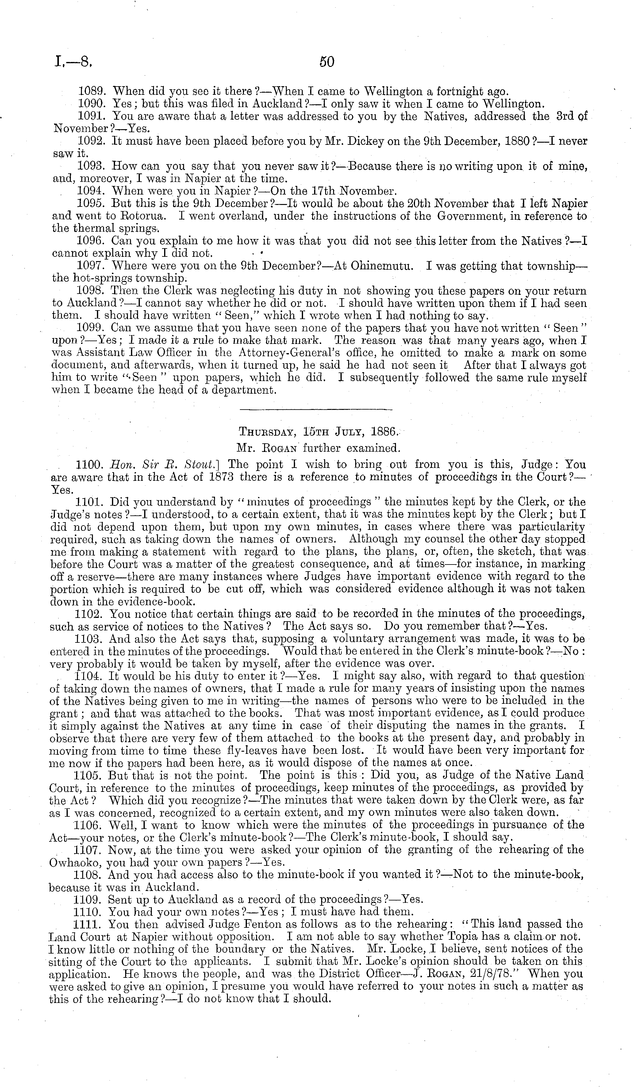 Thursday, 15th July, 1886. Mr. Eogan further examined. 1100. Hon. Sir R. Stout] The point I wish to bring out from you is this, Judge: You are aware that in the Act of 1873 there is a reference to minutes of proceedings in the Court ?— Yes. 1101. Did you understand by "minutes of proceedings " the minutes kept by the Clerk, or the Judge's notes ?—I understood, to a certain extent, that it was the minutes kept by the Clerk; but I did not depend upon them, but upon my own minutes, in cases where there was particularity required, such as taking down the names of owners. Although my counsel the other day stopped me from making a statement with regard to the plans, the plans, or, often, the sketch, that was before the Court was a matter of the greatest consequence, and at times —for instance, in marking off a reserve—there are many instances where Judges have important evidence with regard to the portion which is required to be cut off, which was considered evidence although it was not taken down in the evidence-book. 1102. You notice that certain things are said to be recorded in the minutes of the proceedings, such as service of notices to the Natives ? The Act says so. Do you remember that?— Yes. 1103. And also the Act says that, supposing a voluntary arrangement was made, it was to be entered in the minutes of the proceedings. Would that be entered in the Clerk's minute-book ?—No : very probably it would be taken by myself, after the evidence was over. 1104. It would be his duty to enter it ? —Yes. I might say also, with regard to that question of taking down the names of owners, that I made a rule for many years of insisting upon the names of the Natives being given to me in writing—the names of persons who were to be included in the grant; and that w T as attached to the books. That was most important evidence, as I could produce it simply against the Natives at any time in case of their disputing the names in the grants. I observe that there are very few of them attached to the books at the present day, and probably in moving from time to time these fly-leaves have been lost. It would have been very important for me now if the papers had been here, as it would dispose of the names at once. 1105. But that is not the point. The point is this : Did you, as Judge of the Native Land Court, in reference to the minutes of proceedings, keep minutes of the proceedings, as provided by the Act ? Which did you recognize ?—The minutes that were taken down by the Clerk were, as far as I was concerned, recognized to a certain extent, and my own minutes were also taken down. 1106. Well, I want to know which were the minutes of the proceedings in pursuance of the Act—your notes, or the Clerk's minute-book?— The Clerk's minute book, I should say. 1107. Now, at the time you were asked your opinion of the granting of the rehearing of the Owhaoko, you had your own papers ?—Yes. 1108. And you had access also to the minute-book if you wanted it ?—Not to the minute-book, because it was in Auckland. 1109. Sent up to Auckland as a record of the proceedings ?—Yes. 1110. You had your own notes?— Yes ; I must have had them. 1111. You then advised Judge Fenton as follows as to the rehearing: "This land passed the Land Court at Napier without opposition. lam not able to say whether Topia has a claim or not. I know little or nothing of the boundary or the Natives. Mr. Locke, I believe, sent notices of the sitting of the Court to the applicants. I submit that Mr. Locke's opinion should be taken on this application. He knows the people, and was the District Officer —J. Bogan, 21/8/78." When you were asked to give an opinion, I presume you would have referred to your notes in such a matter as this of the rehearing?—l do not know that I should.
