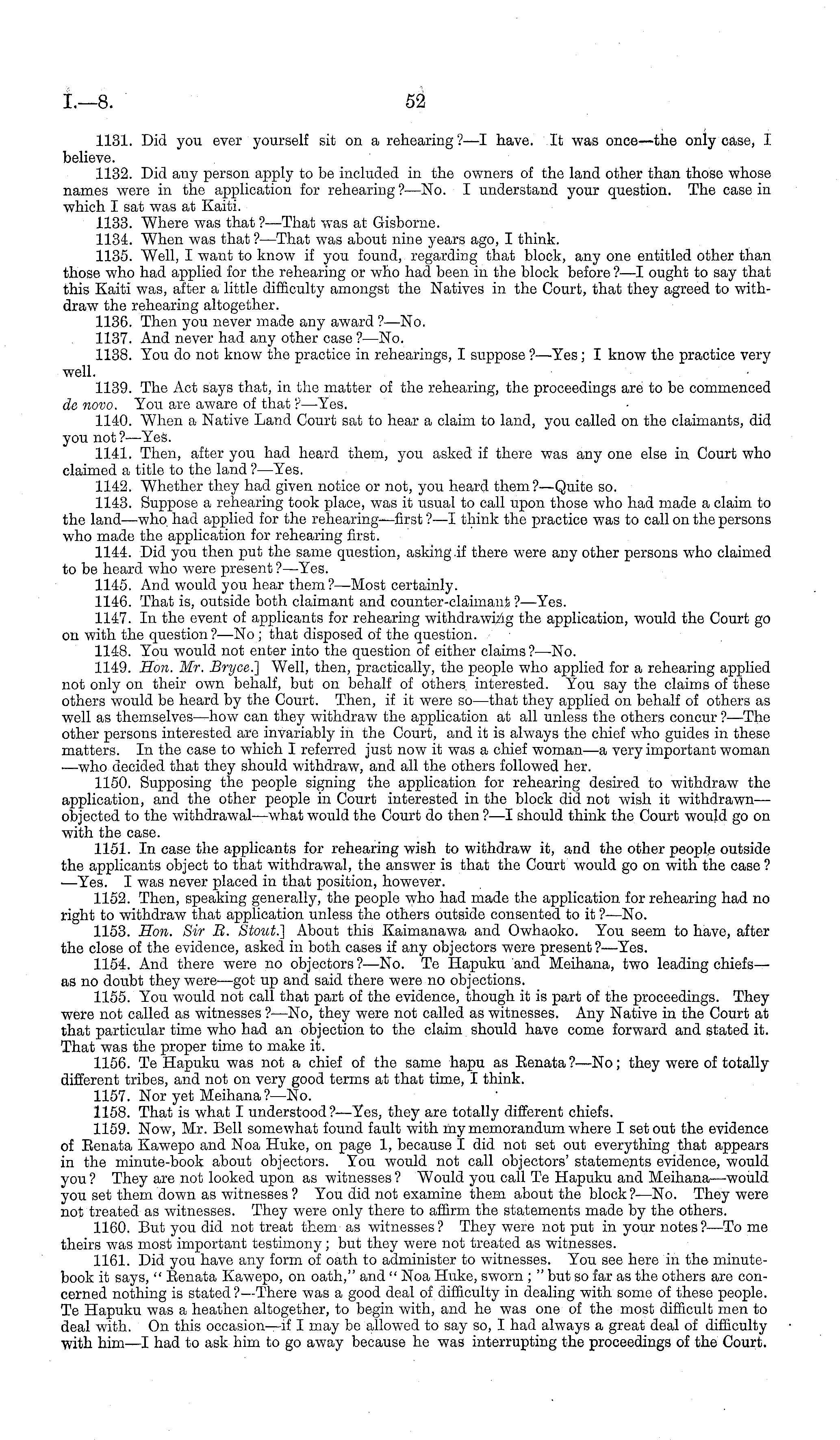 1131. Did you ever yourself sit on a rehearing ?—I have. It was once—the only case, 1 believe. 1132. Did any person apply to be included in the owners of the land other than those whose names were in the application for rehearing ?—No. I understand your question. The case in which I sat was at Kaiti. 1133. Where was that? —That was at Gisborne. 1134. When was that ?—That was about nine years ago, I think. 1135. Well, I want to know if you found, regarding that block, any one entitled other than those who had applied for the rehearing or who had been in the block before ?—I ought to say that this Kaiti was, after a little difficulty amongst the Natives in the Court, that they agreed to withdraw the rehearing altogether. 1136. Then you never made any award ?—No. 1137. And never had any other case ? —No. 1138. You do not know the practice in rehearings, I suppose ? —Yes; I know the practice very well. 1139. The Act says that, in the matter of the rehearing, the proceedings are to be commenced de novo. You are aware of that ? —Yes. 1140. When a Native Land Court sat to hear a claim to land, you called on the claimants, did you not ? —YeS. 1141. Then, after you had heard them, you asked if there was any one else in Court who claimed a title to the land ?—Yes. 1142. Whether they had given notice or not, you heard them?— Quite so. 1143. Suppose a rehearing took place, was it usual to call upon those who had made a claim to the land—who had applied for the rehearing—first ?—I think the practice was to call on the persons who made the application for rehearing first. 1144. Did you then put the same question, asking .if there were any other persons who claimed to be heard who were present?— Yes. 1145. And would you hear them?— Most certainly. 1146. That is, outside both claimant and counter-claimant ? —Yes. 1147. In the event of applicants for rehearing withdrawing the application, would the Court go on with the question?—No ; that disposed of the question. 1148. You would not enter into the question of either claims?— No. 1149. Hon. Mr. Bryce] Well, then, practically, the people who applied for a rehearing applied not only on their own behalf, but on behalf of others, interested. You say the claims of these others would be heard by the Court. Then, if it were so—that they applied on behalf of others as well as themselves —how can they withdraw the application at all unless the others concur ? —The other persons interested are invariably in the Court, and it is always the chief who guides in these matters. In the case to which I referred just now it was a chief woman—a very important woman ■ —who decided that they should withdraw, and all the others followed her. 1150. Supposing the people signing the application for rehearing desired to withdraw the application, and the other people in Court interested in the block did not wish it withdrawn— objected to the withdrawal—what would the Court do then ?—I should think the Court would go on with the case. 1151. In case the applicants for rehearing wish to withdraw it, and the other people outside the applicants object to that withdrawal, the answer is that the Court would go on with the case ? —Yes. I was never placed in that position, however. 1152. Then, speaking generally, the people who had made the application for rehearing had no right to withdraw that application unless the others outside consented to it ? —No. 1153. Hon. Sir R. Stout] About this Kaimanawa and Owhaoko. You seem to have, after the close of the evidence, asked in both cases if any objectors were present?— Yes. 1154. And there were no objectors ?—No. Te Hapuku and Meihana, two leading chiefs— as no doubt they were—got up and said there were no objections. 1155. You would not call that part of the evidence, though it is part of the proceedings. They were not called as witnesses ? —No, they were not called as witnesses. Any Native in the Court at that particular time who had an objection to the claim should have come forward and stated it. That was the proper time to make it. 1156. Te Hapuku was not a chief of the same hapu as Benata?—No; they were of totally different tribes, and not on very good terms at that time, I think. 1157. Nor yet Meihana?—No. 1158. That is what I understood?— Yes, they are totally different chiefs. 1159. Now, Mr. Bell somewhat found fault with my memorandum where I set out the evidence of Benata Kawepo and Noa Huke, on page 1, because I did not set out everything that appears in the minute-book about objectors. You would not call objectors' statements evidence, would you ? They are not looked upon as witnesses ? Would you call Te Hapuku and Meihana—would you set them down as witnesses? You did not examine them about the block? —No. They were not treated as witnesses. They were only there to affirm the statements made by the others. 1160. But you did not treat them as witnesses? They were not put in your notes? —To me theirs was most important testimony; but they were not treated as witnesses. 1161. Did you have any form of oath to administer to witnesses. You see here in the minutebook it says, " Benata Kawepo, on oath," and " Noa Huke, sworn ; " but so far as the others are concerned nothing is stated? —There was a good deal of difficulty in dealing with some of these people. Te Hapuku was a heathen altogether, to begin with, and he was one of the most difficult men to deal with. On this occasion—if I may be allowed to say so, I had always a great deal of difficulty with him—l had to ask him to go away because he was interrupting the proceedings of the Court.