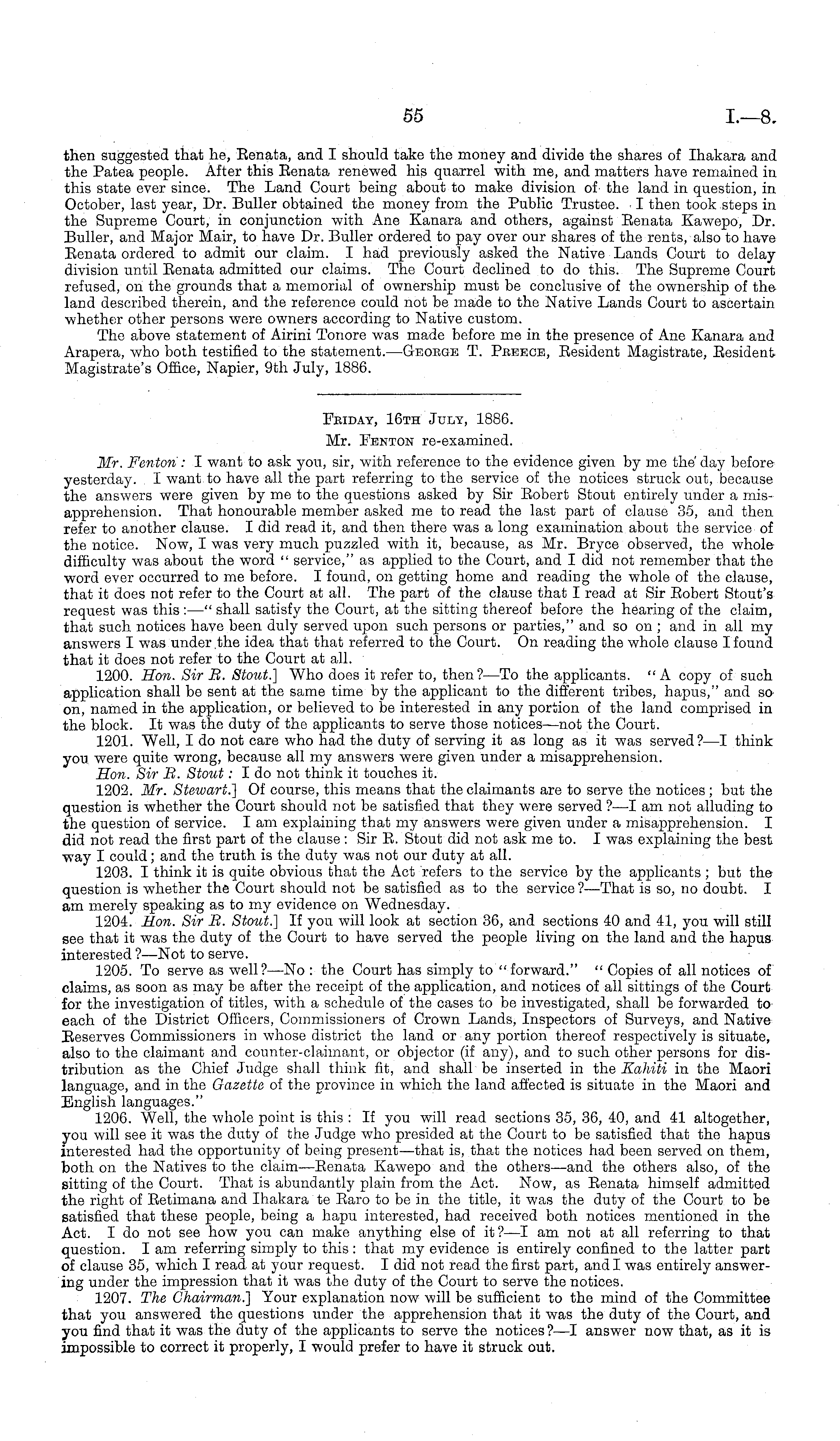 Feiday, 16th July, 1886. Mr. Fenton re-examined. Mr. Fenton : I want to ask you, sir, with reference to the evidence given by me the' day before yesterday. I want to have all the part referring to the service of the notices struck out, because the answers were given by me to the questions asked by Sir Eobert Stout entirely under a misapprehension. That honourable member asked me to read the last part of clause 35, and then, refer to another clause. I did read it, and then there was a long examination about the service of the notice. Now, I was very much puzzled with it, because, as Mr. Bryce observed, the whole difficulty was about the word " service," as applied to the Court, and I did not remember that the word ever occurred to me before. I found, on getting home and reading the whole of the clause, that it does not refer to the Court at all. The part of the clause that I read at Sir Eobert Stout's request was this : —" shall satisfy the Court, at the sitting thereof before the hearing of the claim, that such notices have been duly served upon such persons or parties," and so on ; and in all my answers I was under the idea that that referred to the Court. On reading the whole clause I found that it does not refer to the Court at all. 1200. Hon. Sir R. Stout] Who does it refer to, then?—To the applicants. "A copy of such application shall be sent at the same time by the applicant to the different tribes, hapus," and so on, named in the application, or believed to be interested in any portion of the land comprised in the block. It was the duty of the applicants to serve those notices—not the Court. 1201. Well, I do not care who had the duty of serving it as long as it was served? —I think you were quite wrong, because all my answers were given under a misapprehension. Hon. Sir R. Stout: Ido not think it touches it. 1202. Mr. Steivart] Of course, this means that the claimants are to serve the notices; but the question is whether the Court should not be satisfied that they were served ?—I am not alluding to the question of service. lam explaining that my answers were given under a misapprehension. I did not read the first part of the clause: Sir E. Stout did not ask me to. I was explaining the best way I could; and the truth is the duty was not our duty at all. 1203. I think it is quite obvious that the Act refers to the service by the applicants ; but the question is whether the Court should not be satisfied as to the service?— That is so, no doubt. I am merely speaking as to my evidence on Wednesday. 1204. Hon. Sir R. Stout] If you will look at section 36, and sections 40 and 41, you will still see that it was the duty of the Court to have served the people living on the land and the hapus interested ?—Not to serve. 1205. To serve as well?—No : the Court has simply to "forward." " Copies of all notices of claims, as soon as may be after the receipt of the application, and notices of all sittings of the Court for the investigation of titles, with a schedule of the cases to be investigated, shall be forwarded to each of the District Officers, Commissioners of Crown Lands, Inspectors of Surveys, and Native Beserves Commissioners in whose district the land or any portion thereof respectively is situate, also to the claimant and counter-claimant, or objector (if any), and to such other persons for distribution as the Chief Judge shall think fit, and shall be inserted in the Kahiti in the Maori language, and in the Gazette of the province in which the land affected is situate in the Maori and English languages." 1206. Well, the whole point is this : If you will read sections 35, 36, 40, and 41 altogether, you will see it was the duty of the Judge who presided at the Court to be satisfied that the hapus interested had the opportunity of being present—that is, that the notices had been served on them, both on the Natives to the claim —Eenata Kawepo and the others—and the others also, of the sitting of the Court. That is abundantly plain from the Act. Now, as Eenata himself admitted the right of Betimana and Ihakara te Baro to be in the title, it was the duty of the Court to be satisfied that these people, being a hapu interested, had received both notices mentioned in the Act. I do not see how you can make anything else of it? —I am not at all referring to that question. lam referring simply to this : that my evidence is entirely confined to the latter part of clause 35, which I read at your request. I did not read the first part, and I was entirely answering under the impression that it was the duty of the Court to serve the notices. 1207. The Chairman] Your explanation now will be sufficient to the mind of the Committee that you answered the questions under the apprehension that it was the duty of the Court, and you find that it was the duty of the applicants to serve the notices ? —I answer now that, as it is impossible to correct it properly, I would prefer to have it struck out.