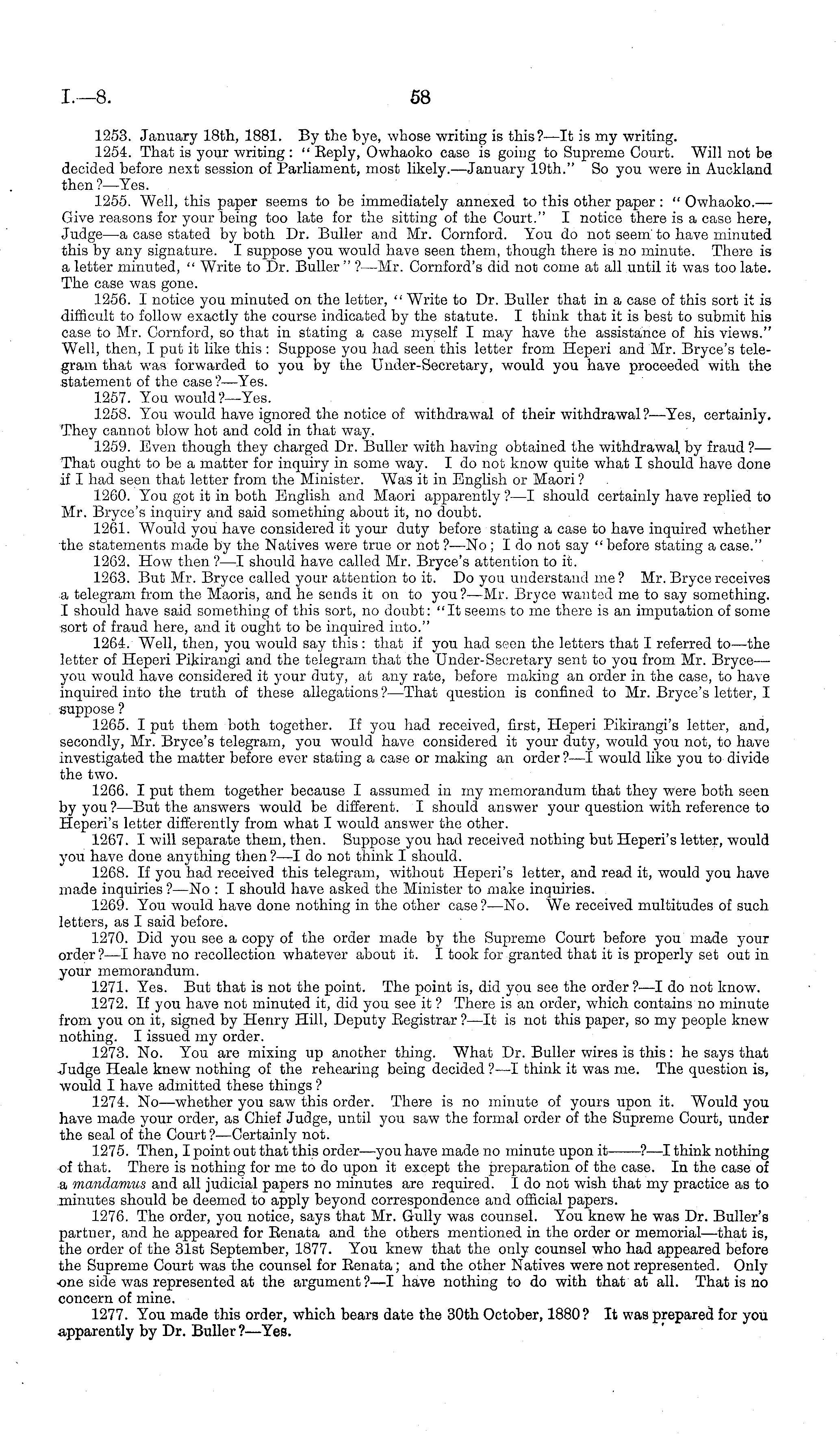 1253. January 18th, 1881. By the bye, whose writing is this?—lt is my writing. 1254. That is your writing : " Beply, Owhaoko case is going to Supreme Court. Will not be decided before next session of Parliament, most likely.—January 19th." So you were in Auckland then?— Yes. 1255. Well, this paper seems to be immediately annexed to this other paper : " Owhaoko.— Give reasons for your being too late for the sitting of the Court." I notice there is a case here, Judge—a case stated by both Dr. Buller and Mr. Cornford. You do not seem' to have minuted this by any signature. I suppose you would have seen them, though there is no minute. There is a letter minuted, " Write to Dr. Buller " ?—Mr. Cornford's did not come at all until it was too late. The case was gone. 1256. I notice you minuted on the letter, " Write to Dr. Buller that in a case of this sort it is difficult to follow exactly the course indicated by the statute. I think that it is best to submit his case to Mr. Cornford, so that in stating a case myself I may have the assistance of his views." Well, then, I put it like this : Suppose you had seen this letter from Heperi and Mr. Bryce's telegram that was forwarded to you by the Under-Secretary, would you have proceeded with the statement of the case ?—Yes. 1257. You would?— Yes. 1258. You would have ignored the notice of withdrawal of their withdrawal ? —Yes, certainly. They cannot blow hot and cold in that way. 1259. Even though they charged Dr. Buller with having obtained the withdrawal, by fraud ?— That ought to be a matter for inquiry in some way. I do not know quite what I should have done if I had seen that letter from the Minister. Was it in English or Maori ? 1260. You got it in both English and Maori apparently ?—I should certainly have replied to Mr. Bryce's inquiry and said something about it, no doubt. 1261. Would you have considered it your duty before stating a case to have inquired whether the statements made by the Natives were true or not ?—No ; I do not say "before stating a case." 1262. How then ?—I should have called Mr. Bryce's attention to it. 1263. But Mr. Bryce called your attention to it. Do you understand me ? Mr. Bryce receives a telegram from the Maoris, and he sends it on to you? —Mr. Bryce wanted me to say something. I should have said something of this sort, no doubt: "It seems to me there is an imputation of some sort of fraud here, and it ought to be inquired into." 1264. Well, then, you would say this: that if you had seen the letters that I referred to —the letter of Heperi Pikirangi and the telegram that the Under-Secretary sent to you from Mr. Bryce— you would have considered it your duty, at any rate, before making an order in the case, to have inquired into the truth of these allegations? —That question is confined to Mr. Bryce's letter, I suppose ? 1265. I put them both together. If you had received, first, Heperi Pikirangi's letter, and, secondly, Mr. Bryce's telegram, you would have considered it your duty, would you not, to have investigated the matter before ever stating a case or making an order ?—I would like you to divide the two. 1266. I put them together because I assumed in my memorandum that they were both seen by you? —But the answers would be different. I should answer your question with reference to Heperi's letter differently from what I would answer the other. 1267. I will separate them, then. Suppose you had received nothing but Heperi's letter, would you have done anything then?—l do not think I should. 1268. If you had received this telegram, without Heperi's letter, and read it, would you have made inquiries ?—No : I should have asked the Minister to make inquiries. 1269. You would have done nothing in the other case ? —No. We received multitudes of such letters, as I said before. 1270. Did you see a copy of the order made by the Supreme Court before you made your order?—l have no recollection whatever about it. I took for granted that it is properly set out in your memorandum. 1271. Yes. But that is not the point. The point is, did you see the order?—l do not know. 1272. If you have not minuted it, did you see it ? There is an order, which contains no minute from you on it, signed by Henry Hill, Deputy Begistrar ?—lt is not this paper, so my people knew nothing. I issued my order. 1273. No. You are mixing up another thing. What Dr. Buller wires is this: he says that Judge Heale knew nothing of the rehearing being decided ?—I think it was me. The question is, would I have admitted these things ? 1274. No—whether you saw this order. There is no minute of yours upon it. Would you have made your order, as Chief Judge, until you saw the formal order of the Supreme Court, under the seal of the Court ?—Certainly not. 1275. Then, I point out that this order —you have made no minute upon it ?—I think nothing of that. There is nothing for me to do upon it except the preparation of the case. In the case of a mandamus and all judicial papers no minutes are required. Ido not wish that my practice as to minutes should be deemed to apply beyond correspondence and official papers. 1276. The order, you notice, says that Mr. Gully was counsel. You knew he was Dr. Buller's partner, and he appeared for Benata and the others mentioned in the order or memorial—that is, the order of the 31st September, 1877. You knew that the only counsel who had appeared before the Supreme Court was the counsel for Benata; and the other Natives were not represented. Only one side was represented at the argument ?—I have nothing to do with that at all. That is no concern of mine. 1277. You made this order, which bears date the 30th October, 1880 ? It was prepared for you apparently by Dr. Buller ?— Yes.
