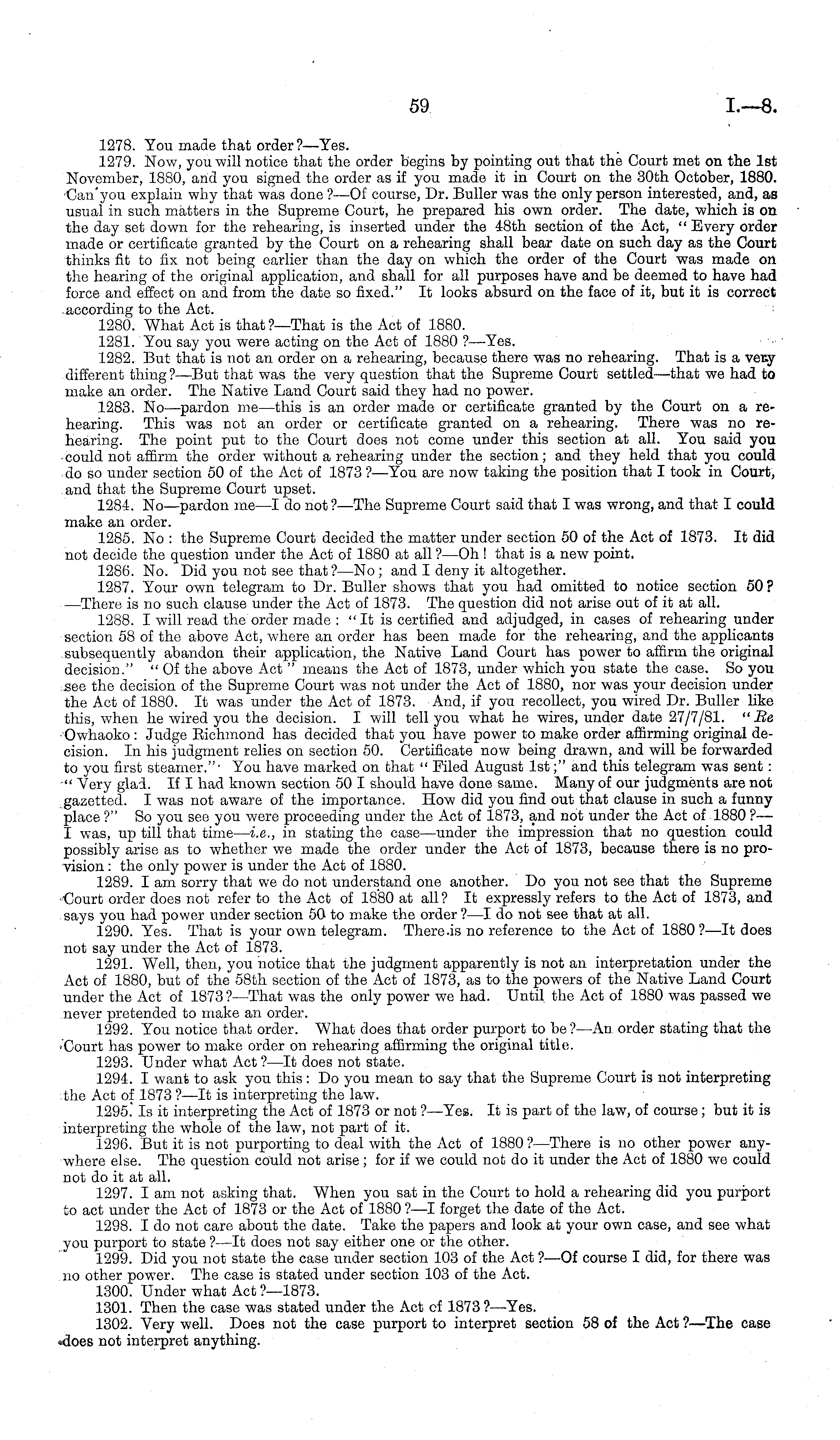 1278. You made that order?— Yes. 1279. Now, you will notice that the order begins by pointing out that the Court met on the Ist November, 1880, arid you signed the order as if you made it in Court on the 30th October, 1880. Can'you explain why that was done ? —Of course, Dr. Buller was the only person interested, and, as usual in such matters in the Supreme Court, he prepared his own order. The date, which is on the day set down for the rehearing, is inserted under the 48th section of the Act, " Every order made or certificate granted by the Court on a rehearing shall bear date on such day as the Court thinks fit to fix not being earlier than the day on which the order of the Court was made on the hearing of the original application, and shall for all purposes have and be deemed to have had force and effect on and from the date so fixed." It looks absurd on the face of it, but it is correct according to the Act. 1280. What Act is that ?—That is the Act of 1880. 1281. You say you were acting on the Act of 1880 ?—Yes. 1282. But that is not an order on a rehearing, because there was no rehearing. That is a very different thing ?—But that was the very question that the Supreme Court settled —that we had to make an order. The Native Land Court said they had no power. 1283. No—pardon me —this is an order made or certificate granted by the Court on a rehearing. This was not an order or certificate granted on a rehearing. There was no rehearing. The point put to the Court does not come under this section at all. You said you could not affirm the order without a rehearing under the section; and they held that you could do so under section 50 of the Act of 1873 ? —You are now taking the position that I took in Court, and that the Supreme Court upset. 1284. No—pardon me—l do not ?—The Supreme Court said that I was wrong, and that I could make an order. 1285. No : the Supreme Court decided the matter under section 50 of the Act of 1873. It did not decide the question under the Act of 1880 at all ?—Oh! that is a new point. 1286. No. Did you not see that?—No ; and I deny it altogether. 1287. Your own telegram to Dr. Buller shows that you had omitted to notice section 50? —There is no such clause under the Act of 1873. The question did not arise out of it at all. 1288. I will read the order made : "It is certified and adjudged, in cases of rehearing under section 58 of the above Act, where an order has been made for the rehearing, and the applicants subsequently abandon their application, the Native Land Court has power to affirm the original decision." "Of the above Act " means the Act of 1873, under which you state the case. So you see the decision of the Supreme Court was not under the Act of 1880, nor was your decision under the Act of 1880. It was under the Act of 1873. And, if you recollect, you wired Dr. Buller like this, when he wired you the decision. I will tell you what he wires, under date 27/7/81. "Re Owhaoko : Judge Bichmond has decided that you have power to make order affirming original decision. In his judgment relies on section 50. Certificate now being drawn, and will be forwarded to you first steamer."- You have marked on that " Filed August 1st;" and this telegram was sent: " Very glad. If I had known section 50 I should have done same. Many of our judgments are not gazetted. I was not aware of the importance. How did you find out that clause in such a funny place ?" So you see you were proceeding under the Act of 1873, and not under the Act of 1880 ?— I was, up till that time — i.e., in stating the case —under the impression that no question could possibly arise as to whether we made the order under the Act of 1873, because there is no provision : the only power is under the Act of 1880. 1289. lam sorry that we do not understand one another. Do you not see that the Supreme Uourt order does not refer to the Act of 1880 at all? It expressly refers to the Act of 1873, and says you had power under section 50 to make the order ?—I do not see that at all. 1290. Yes. That is your own telegram. There-is no reference to the Act of 1880? —It does not say under the Act of 1873. 1291. Well, then, you notice that the judgment apparently is not an interpretation under the Act of 1880, but of the 58th section of the Act of 1873, as to the powers of the Native Land Court under the Act of 1873? —That was the only power we had. Until, the Act of 1880 was passed we never pretended to make an order. 1292. You notice that order. What does that order purport to be? —An order stating that the ■Court has power to make order on rehearing affirming the original title. 1293. Under what Act ?—lt does not state. 1294. I want to ask you this : Do you mean to say that the Supreme Court is not interpreting the Act of 1873 ?—lt is interpreting the law. 1295." Is it interpreting the Act of 1873 or not ?—Yes. It is part of the law, of course; but it is interpreting the whole of the law, not part of it. 1296. But it is not purporting to deal with the Act of 1880 ?—There is no other power anywhere else. The question could not arise ; for if we could not do it under the Act of 1880 we could not do it at all. 1297. lam not asking that. When you sat in the Court to hold a rehearing did you purport to act under the Act of 1873 or the Act of 1880 ?—I forget the date of the Act. 1298. Ido not care about the date. Take the papers and look at your own case, and see what you purport to state ?—lt does not say either one or the other. 1299. Did you not state the case under section 103 of the Act ? —Of course I did, for there was no other power. The case is stated under section 103 of the Act. 1300. Under what Act ?—1873. 1301. Then the case was stated under the Act of 1873 ?—Yes. 1302. Very well. Does not the case purport to interpret section 58 of the Act ?—The case «does not interpret anything.