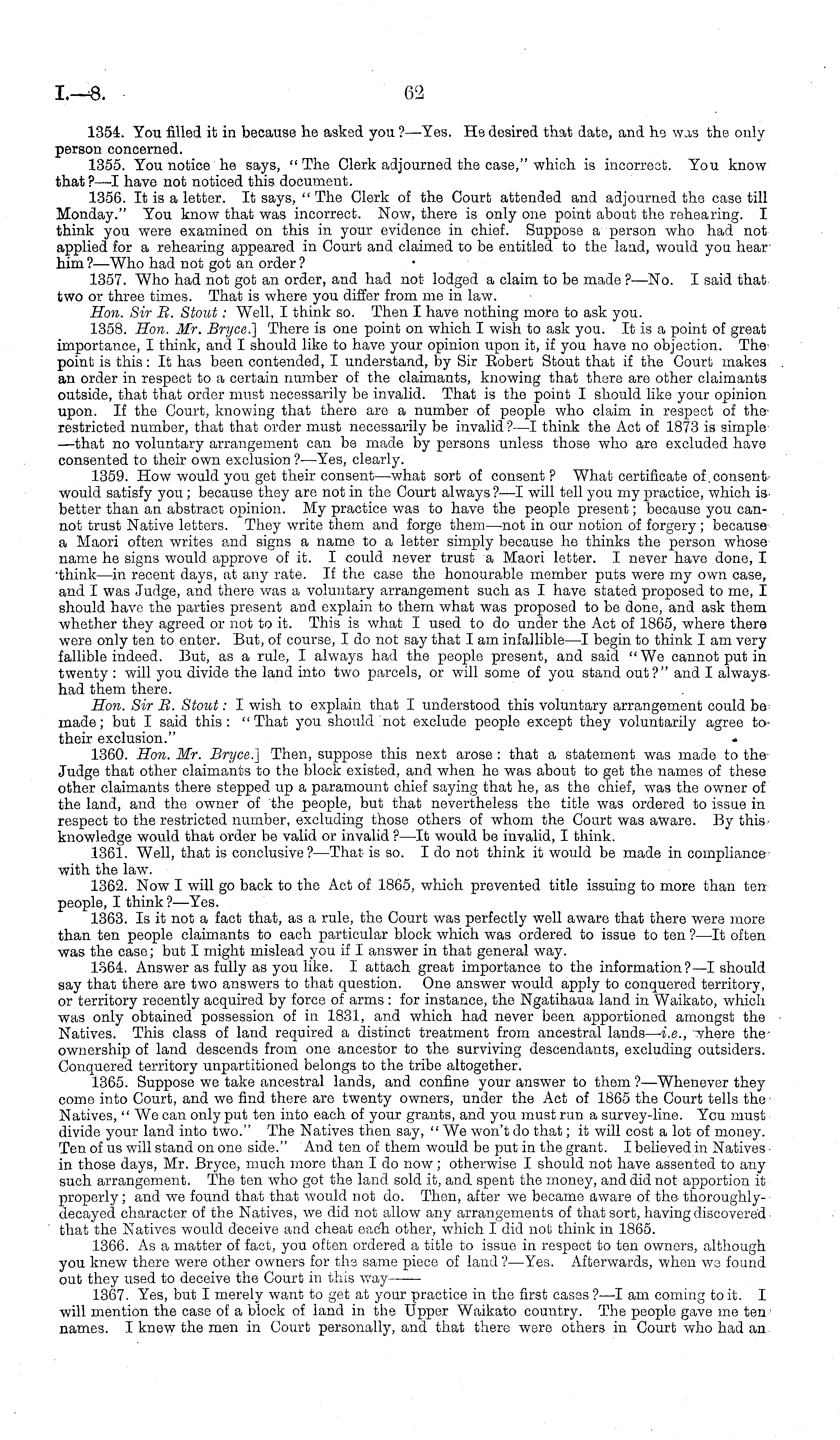 1354. You filled it in because he asked you ? —Yes. He desired that date, and lis was the only person concerned. 1355. You notice he says, "The Clerk adjourned the case," which is incorrect. You know that ?—I have not noticed this document. 1356. It is a letter. It says, " The Clerk of the Court attended and adjourned the case till Monday." You know that was incorrect. Now, there is only one point about the rehearing. I think you were examined on this in your evidence in chief. Suppose a person who had not applied for a rehearing appeared in Court and claimed to be entitled to the land, would you hear him ?—Who had not got an order ? 1357. Who had not got an order, and had not lodged a claim to be made ? —No. I said that two or three times. That is where you differ from me in law. Hon. Sir R. Stout: Well, I think so. Then I have nothing more to ask you. 1358. Hon. Mr. Bryce] There is one point on which I wish to ask you. It is a point of great importance, I think, and I should like to have your opinion upon it, if you have no objection. The point is this: It has been contended, I understand, by Sir Eobert Stout that if the Court makes an order in respect to a certain number of the claimants, knowing that there are other claimants outside, that that order must necessarily be invalid. That is the point I should like your opinion upon. If the Court, knowing that there are a number of people who claim in respect of therestricted number, that that order must necessarily be invalid ?—I think the Act of 1873 is simple —that no voluntary arrangement can be made by persons unless those who are excluded have consented to their own exclusion ? —Yes, clearly. 1359. How would you get their consent—what sort of consent? What certificate of. consent would satisfy you; because they are not in the Court always?—l will tell you my practice, which isbetter than an abstract opinion. My practice was to have the people present; because you cannot trust Native letters. They write them and forge them—not in our notion of forgery; because a Maori often writes and signs a name to a letter simply because he thinks the person whose name he signs would approve of it. I could never trust a Maori letter. I never have done, I 'think —in recent days, at any rate. If the case the honourable member puts were my own case, and I was Judge, and there was a voluntary arrangement such as I have stated proposed to me, I should have the parties present and explain to them what was proposed to be done, and ask them whether they agreed or not to it. This is what I used to do under the Act of 1865, where there were only ten to enter. But, of course, Ido not say that lam infallible—l begin to think lam very fallible indeed. But, as a rule, I always had the people present, and said "We cannot put in twenty : will you divide the land into two parcels, or will some of you stand out?" and I always had them there. Hon. Sir R. Stout: I wish to explain that I understood this voluntary arrangement could bemade; but I said this: "That you should not exclude people except they voluntarily agree to* their exclusion." 1360. Hon. Mr. Bryce] Then, suppose this next arose : that a statement was made to the Judge that other claimants to the block existed, and when he was about to get the names of these other claimants there stepped up a paramount chief saying that he, as tho chief, was the owner of the land, and the owner of the people, but that nevertheless the title was ordered to issue in respect to the restricted number, excluding those others of whom the Court was aware. By thisknowledge would that order be valid or invalid ? —lt would be invalid, I think. 1361. Well, that is conclusive ?—That is so. Ido not think it would be made in compliance with the law. 1362. Now I will go back to the Act of 1865, which prevented title issuing to more than tenpeople, I think ? —Yes. 1363. Is it not a fact that, as a rule, the Court was perfectly well aware that there were more than ten people claimants to each particular block which was ordered to issue to ten ?—lt often was the case; but I might mislead you if I answer in that general way. 1364. Answer as fully as you like. I attach great importance to the information?—l should say that there are two answers to that question. One answer would apply to conquered territory, or territory recently acquired by force of arms : for instance, the Ngatihaua land in Waikato, which was only obtained possession of in 1831, and which had never been apportioned amongst the Natives. This class of land required a distinct treatment from ancestral lands — i.e., where theownership of land descends from one ancestor to the surviving descendants, excluding outsiders. Conquered territory unpartitioned belongs to the tribe altogether. 1365. Suppose we take ancestral lands, and confine your answer to them ?—Whenever they come into Court, and we find there are twenty owners, under the Act of 1865 the Court tells the Natives, "We can only put ten into each of your grants, and you must run a survey-line. Ycu must divide your land into two." The Natives then say, "We won't do that; it will cost a lot of money. Ten of us will stand on one side." And ten of them would be put in the grant. I believed in Natives in those days, Mr. Bryce, much more than Ido now; otherwise I should not have assented to any such arrangement. The ten who got the land sold it, and spent the money, and did not apportion it properly ; and we found that that would not do. Then, after we became aware of the thoroughlydecayed character of the Natives, we did not allow any arrangements of that sort, having discovered that the Natives would deceive and cheat each other, which I did not think in 1865. 1366. As a matter of fact, you often ordered a title to issue in respect to ten owners, although you knew there were other owners for the same piece of land ?—Yes. Afterwards, when we found out they used to deceive the Court in