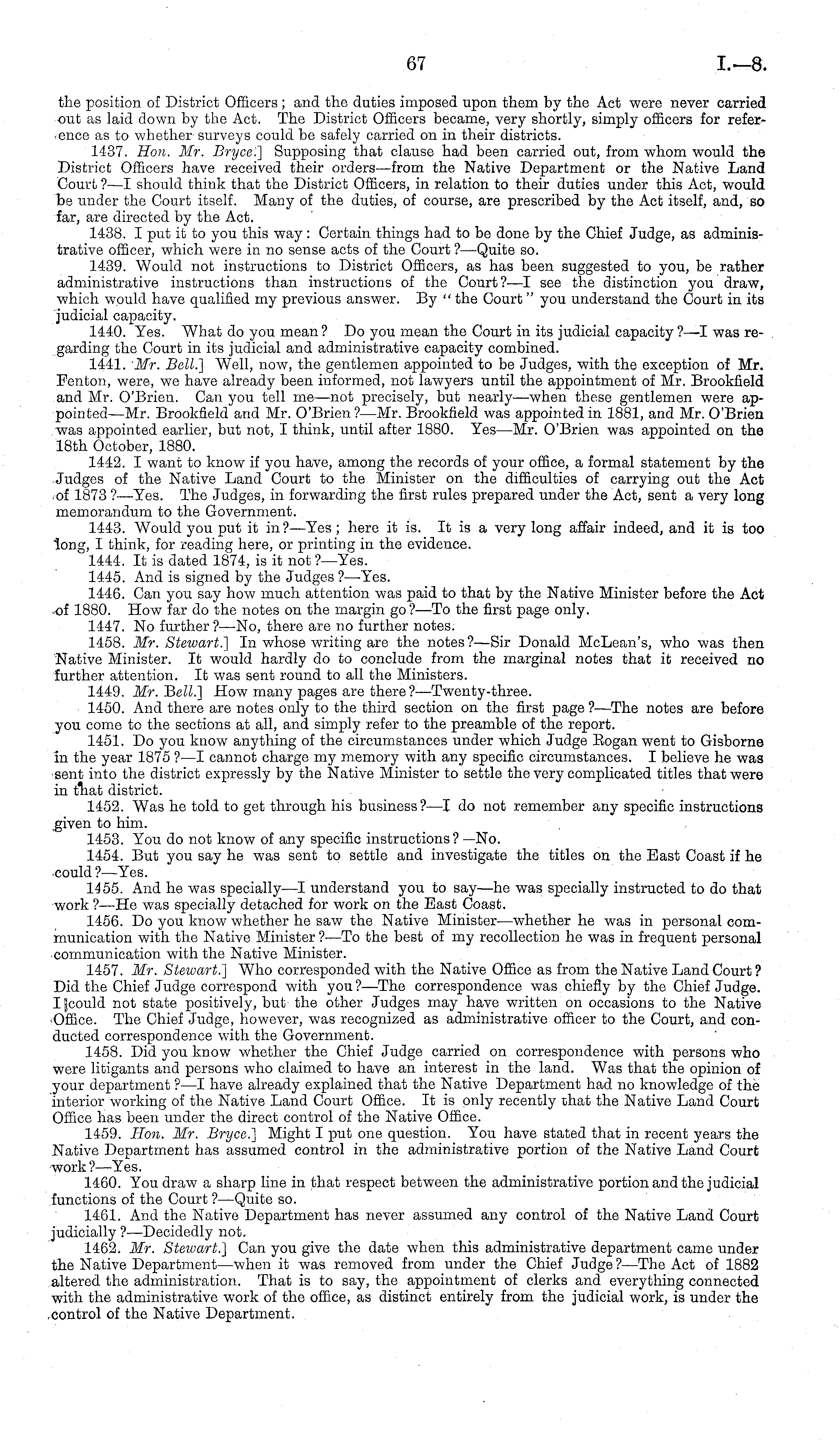 the position of District Officers ; and the duties imposed upon them by the Act were never carried out as laid down by the Act. The District Officers became, very shortly, simply officers for reference as to whether surveys could be safely carried on in their districts. 1437. Hon. Mr. Bryce] Supposing that clause had been carried out, from whom would the District Officers have received their orders—from the Native Department or the Native Land Court ?—I should think that the District Officers, in relation to their duties under this Act, would be under the Court itself. Many of the duties, of course, are prescribed by the Act itself, and, so far, are directed by the Act. 1438. I put it to you this way : Certain things had to be done by the Chief Judge, as administrative officer, which were in no sense acts of the Court ?—Quite so. 1439. Would not instructions to District Officers, as has been suggested to you, be rather administrative instructions than instructions of the Court ?—I see the distinction you draw, which would have qualified my previous answer. By " the Court " you understand the Court in its judicial capacity. 1440. Yes. What do you mean? Do you mean the Court in its judicial capacity ?—I was regarding the Court in its judicial and administrative capacity combined. 1441. Mr. Bell] Well, now, the gentlemen appointed to be Judges, with the exception of Mr. Fenton, were, we have already been informed, not lawyers until the appointment of Mr. Brookfield and Mr. O'Brien. Can you tell me —not precisely, but nearly —when these gentlemen were appointed—Mr. Brookfield and Mr. O'Brien ?—Mr. Brookfield was appointed in 1881, and Mr. O'Brien was appointed earlier, but not, I think, until after 1880. Yes—Mr. O'Brien was appointed on the 18th October, 1880. 1442. I want to know if you have, among the records of your office, a formal statement by the Judges of the Native Land Court to the Minister on the difficulties of carrying out the Act .of 1873 ?—Yes. The Judges, in forwarding the first rules prepared under the Act, sent a very long memorandum to the Government. 1443. Would you put it in? —Yes; here it is. It is a very long affair indeed, and it is too long, I think, for reading here, or printing in the evidence. 1444. It is dated 1874, is it not ?—Yes. 1445. And is signed by the Judges ? —Yes. 1446. Can you say how much attention was paid to that by the Native Minister before the Act of 1880. How far do the notes on the margin go ? —To the first page only. 1447. No further ?—No, there are no further notes. 1458. Mr. Stewart] In whose writing are the notes?— Sir Donald McLean's, who was then Native Minister. It would hardly do to conclude from the marginal notes that it received no further attention. It was sent round to all the Ministers. 1449. Mr. Hell] How many pages are there ? —Twenty-three. ■ 1450. And there are notes only to the third section on the first page ?—The notes are before you come to the sections at all, and simply refer to the preamble of the report. 1451. Do you know anything of the circumstances under which Judge Bogan went to Gisborne in the year 1875 ? —I cannot charge my memory with any specific circumstances. I believe he was sent into the district expressly by the Native Minister to settle the very complicated titles that were in that district. 1452. Was he told to get through his business? —I do not remember any specific instructions given to him. 1453. You do not know of any specific instructions? —No. 1454. But you say he was sent to settle and investigate the titles on the East Coast if he could?— Yes. 1455. And he was specially —I understand you to say—he was specially instructed to do that work ?—He was specially detached for work on the East Coast. 1456. Do you know whether he saw the Native Minister—whether he was in personal communication with the Native Minister ?—To the best of my recollection he was in frequent personal communication with the Native Minister. 1457. Mr. Stewart] Who corresponded with the Native Office as from the Native Land Court ? Did the Chief Judge correspond with you ?—The correspondence was chiefly by the Chief Judge. I |could not state positively, but the other Judges may have written on occasions to the Native Office. The Chief Judge, however, was recognized as administrative officer to the Court, and conducted correspondence with the Government. 1458. Did you know whether the Chief Judge carried on correspondence with persons who were litigants and persons who claimed to have an interest in the land. Was that the opinion of your department ? —I have already explained that the Native Department had no knowledge of the interior working of the Native Land Court Office. It is only recently that the Native Land Court Office has been under the direct control of the Native Office. 1459. Hon. Mr. Bryce] Might I put one question. You have stated that in recent years the Native Department has assumed control in the administrative portion of the Native Land Court work ? —Yes. 1460. You draw a sharp line in that respect between the administrative portion and the judicial functions of the Court ?—Quite so. 1461. And the Native Department has never assumed any control of the Native Land Court judicially ? —Decidedly not. 1462. Mr. Stewart] Can you give the date when this administrative department came under the Native Department—when it was removed from under the Chief Judge ? —The Act of 1882 altered the administration. That is to say, the appointment of clerks and everything connected with the administrative work of the office, as distinct entirely from the judicial work, is under the control of the Native Department.