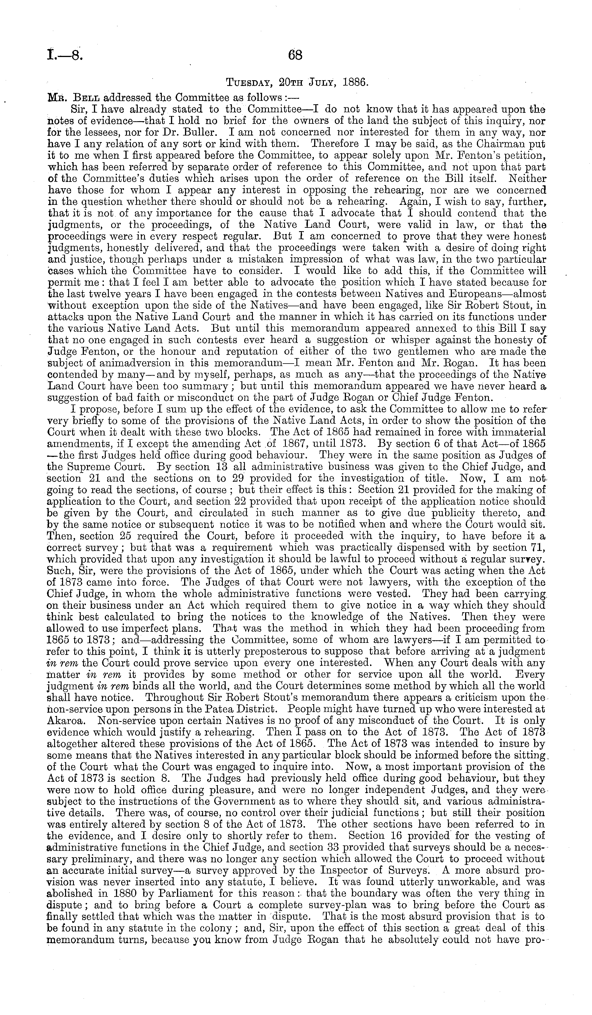 Tuesday, 20th July, 1886. Mb. Bell addressed the Committee as follows :— Sir, I have already stated to the Committee—l do not know that it has appeared upon the notes of evidence—that I hold no brief for the owners of the land the subject of this inquiry, nor for the lessees, nor for Dr. Buller. lam not concerned nor interested for them in any way, nor have I any relation of any sort or kind with them. Therefore I may be said, as the Chairman put it to me when I first appeared before the Committee, to appear solely upon Mr. Fenton's petition, which has been referred by separate order of reference to this Committee, and not upon that part of the Committee's duties which arises upon the order of reference on the Bill itself. Neither have those for whom I appear any interest in opposing the rehearing, nor are we concerned in the question whether there should or should not be a rehearing. Again, I wish to say, further, that it is not of any importance for the cause that I advocate that I should contend that the judgments, or the proceedings, of the Native Land Court, were valid in law, or that the proceedings were in every respect regular. But I am concerned to prove that they were honest judgments, honestly delivered, and that the proceedings were taken with a desire of doing right and justice, though perhaps under a mistaken impression of what was law, in the two particular cases which the Committee have to consider. I would like to add this, if the Committee will permit me : that I feel I am better able to advocate the position which I have stated because for the last twelve years I have been engaged in the contests between Natives and Europeans —almost without exception upon the side of the Natives —and have been engaged, like Sir Eobert Stout, in attacks upon the Native Land Court and the manner in which it has carried on its functions under the various Native Land Acts. But until this memorandum appeared annexed to this Bill I say that no one engaged in such contests ever heard a suggestion or whisper against the honesty of Judge Fenton, or the honour and reputation of either of the two gentlemen who are made the subject of animadversion in this memorandum —I mean Mr. Fenton and Mr. Bogan. It has been contended by many—and by myself, perhaps, as much as any—that the proceedings of the Native Land Court have been too summary ; but until this memorandum appeared we have never heard a suggestion of bad faith or misconduct on the part of Judge Bogan or Chief Judge Fenton. I propose, before I sum up the effect of the evidence, to ask the Committee to allow me to refer very briefly to some of the provisions of the Native Land Acts, in order to show the position of the Court when it dealt with these two blocks. The Act of 1865 had remained in force with immaterial amendments, if I except the amending Act of 1867, until 1873. By section 6of that Act —of 1865 —the first Judges held office during good behaviour. They were in the same position, as Judges of the Supreme Court. By section 13 all administrative business was given to the Chief Judge, and section 21 and the sections on to 29 provided for the investigation of title. Now, I am not going to read the sections, of course ; but their effect is this: Section 21 provided for the making of application to the Court, and section 22 provided that upon receipt of the application notice should be given by the Court, and circulated in such manner as to give due publicity thereto, and by the same notice or subsequent notice it was to be notified when and where the Court would sit. Then, section 25 required the Court, before it proceeded with the inquiry, to have before it a correct survey ; but that was a requirement which was practically dispensed with by section 71, which provided that upon any investigation it should be lawful to proceed without a regular survey. Such, Sir, were the provisions of the Act of 1865, under which the Court was acting when the Act of 1873 came into force. The Judges of that Court were not lawyers, with the exception of the Chief Judge, in whom the whole administrative functions were vested. They had been carrying on their business under an Act which required them to give notice in a way which they should think best calculated to bring the notices to the knowledge of the Natives. Then they were allowed to use imperfect plans. That was the method in which they had been proceeding from 1865 to 1873; and—addressing the Committee, some of whom are lawyers—if lam permitted to refer to this point, I think it is utterly preposterous to suppose that before arriving at a judgment in rem the Court could prove service upon every one interested. When any Court deals with any matter in rem it provides by some method or other for service upon all the world. Every judgment in rem binds all the world, and the Court determines some method by which all the world shall have notice. Throughout Sir Eobert Stout's memorandum there appears a criticism upon the non-service upon persons in the Patea District. People might have turned up who were interested at Akaroa. Non-service upon certain Natives is no proof of any misconduct of the Court. It is only evidence which would justify a rehearing. Then I pass on to the Act of 1873. The Act of 1873 altogether altered these provisions of the Act of 1865. The Act of 1873 was intended to insure by some means that the Natives interested in any particular block should be informed before the sitting of the Court what the Court was engaged to inquire into. Now, a most important provision of the Act of 1873 is section 8. The Judges had previously held office during good behaviour, but they were now to hold office during pleasure, and were no longer independent Judges, and they were subject to the instructions of the Government as to where they should sit, and various administrative details. There was, of course, no control over their judicial functions ; but still their position was 