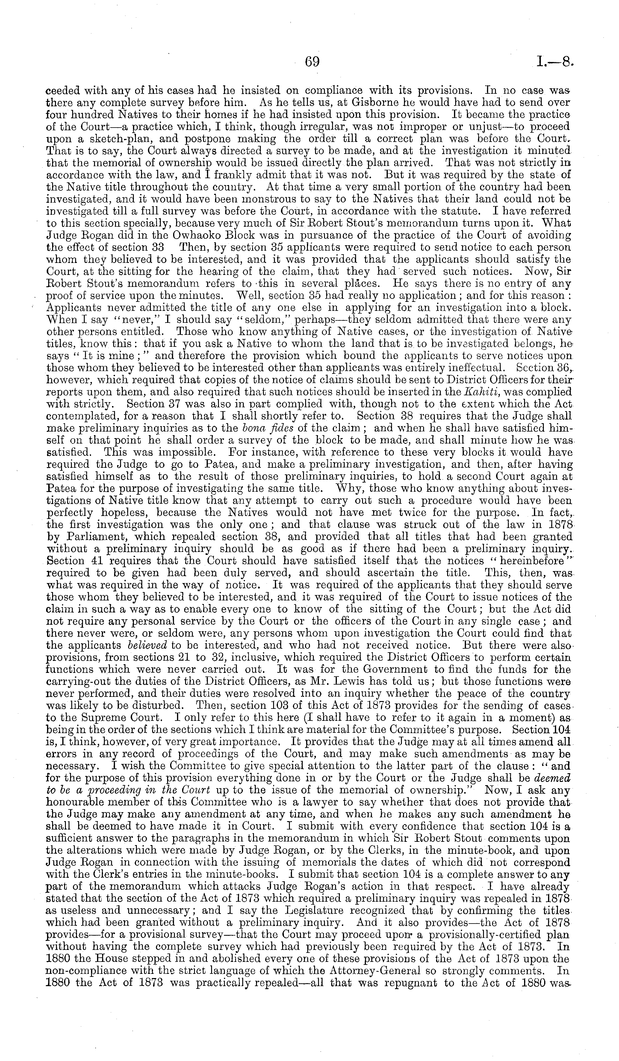 ceeded with any of his cases had he insisted on compliance with its provisions. In no case was there any complete survey before him. As he tells us, at Gisborne he would have had to send over four hundred Natives to their homes if he had insisted upon this provision. It became the practice of the Court —a practice which, I think, though irregular, was not improper or unjust—to proceed upon a sketch-plan, and postpone making the order till a correct plan was before the Court, That is to say, the Court always directed a survey to be made, and at the investigation it minuted, that the memorial of ownership would be issued directly the plan arrived. That was not strictly in accordance with the law, and I frankly admit that it was not. But it was required by the state of the Native title throughout the country. At that time a very small portion of the country had been investigated, and it would have been monstrous to say to the Natives that their land could not be investigated till a full survey was before the Court, in accordance with the statute. I have referred to this section specially, because very much of Sir Eobert Stout's memorandum turns upon it. What Judge Eogan did in the Owhaoko Block was in pursuance of the practice of the Court of avoiding the effect of section 33 Then, by section 35 applicants were required to send notice to each person whom they believed to be interested, and it was provided that the applicants should satisfy the Court, at the sitting for the hearing of the claim, that they had served such notices. Now, Sir Bobert Stout's memorandum refers to this in several places. Ho says there is no entry of any proof of service upon the minutes. Well, section 35 had really no application ; and for this reason : Applicants never admitted the title of any one else in applying for an investigation into a block. When I say "never," I should say "seldom," perhaps—they seldom admitted that there were any other persons entitled. Those who know anything of Native cases, or the investigation of Nativetitles, know this : that if you ask a Native to whom the land that is, to be investigated belongs, he says " It is mine ; " and therefore the provision which bound the applicants to serve notices upon those whom they believed to be interested other than applicants was entirely ineffectual. Section 36, however, which required that copies of the notice of claims should be sent to District Officers for their reports upon them, and also required that such notices should be inserted in the Kahiti, was complied with strictly. Section 37 was also in part complied with, though not to the extent which the Act contemplated, for a reason that I shall shortly refer to. Section 38 requires that the Judge shall make preliminary inquiries as to the bona fides of the claim; and when he shall have satisfied himself on that point he shall order a survey of the block to be made, and shall minute how he was satisfied. This was impossible. For instance, with reference to these very blocks it would have required the Judge to go to Patea, and make a preliminary investigation, and then, after having satisfied himself as to the result of those preliminary inquiries, to hold a second Court again at Patea for the purpose of investigating the same title. Why, those who know anything about investigations of Native title know that any attempt to carry out such a procedure would have been perfectly hopeless, because the Natives would not have met twice for the purpose. In fact, the first investigation was the only one ; and that clause was struck out of the law in 1878 by Parliament, which repealed section 38, and provided that all titles that had been granted without a preliminary inquiry should be as good as if there had been a preliminary inquiry. Section 41 requires that the Court should have satisfied itself that the notices "hereinbefore" required to be given had been duly served, and should ascertain the title. This, then, was what was required in the way of notice. It was required of the applicants that they should serve those whom they believed to be interested, and it was required of the Court to issue notices of the claim in such a way as to enable every one to know of the sitting of the Court; but the Act did not require any personal service by the Court or the officers of the Court in any single case ; and there never were, or seldom were, any persons whom upon investigation the Court could find that the applicants believed to be interested, and who had not received notice. But there were also provisions, from sections 21 to 32, inclusive, which required the District Officers to perform certain functions which were never carried out. It was for the Government to find the funds for the carrying-out the duties of the District Officers, as Mr. Lewis has told us; but those functions were never performed, and their duties were resolved into an inquiry whether the peace of the country was likely to be disturbed. Then, section 103 of this Act of 1873 provides for the sending of cases to the Supreme Court. I only refer to this here (I shall have to refer to it again in a moment) as being in the order of the sections which I think are material for the Committee's purpose. Section 104 is, I think, however, of very great importance. It provides that the Judge may at all times amend all errors in any record of proceedings of the Court, and may make such amendments as may be necessary. I wish the Committee to give special attention to the latter part of the clause : " and for the purpose of this provision everything done in or by the Court or the Judge shall be deemed to be a proceeding in the Court up to the issue of the memorial of ownership." Now, I ask any honourable member of this Committee who is a lawyer to say whether that does not provide that the Judge may make any amendment at any time, and when he makes any such amendment he shall be deemed to have made it in Court. I submit with every confidence t