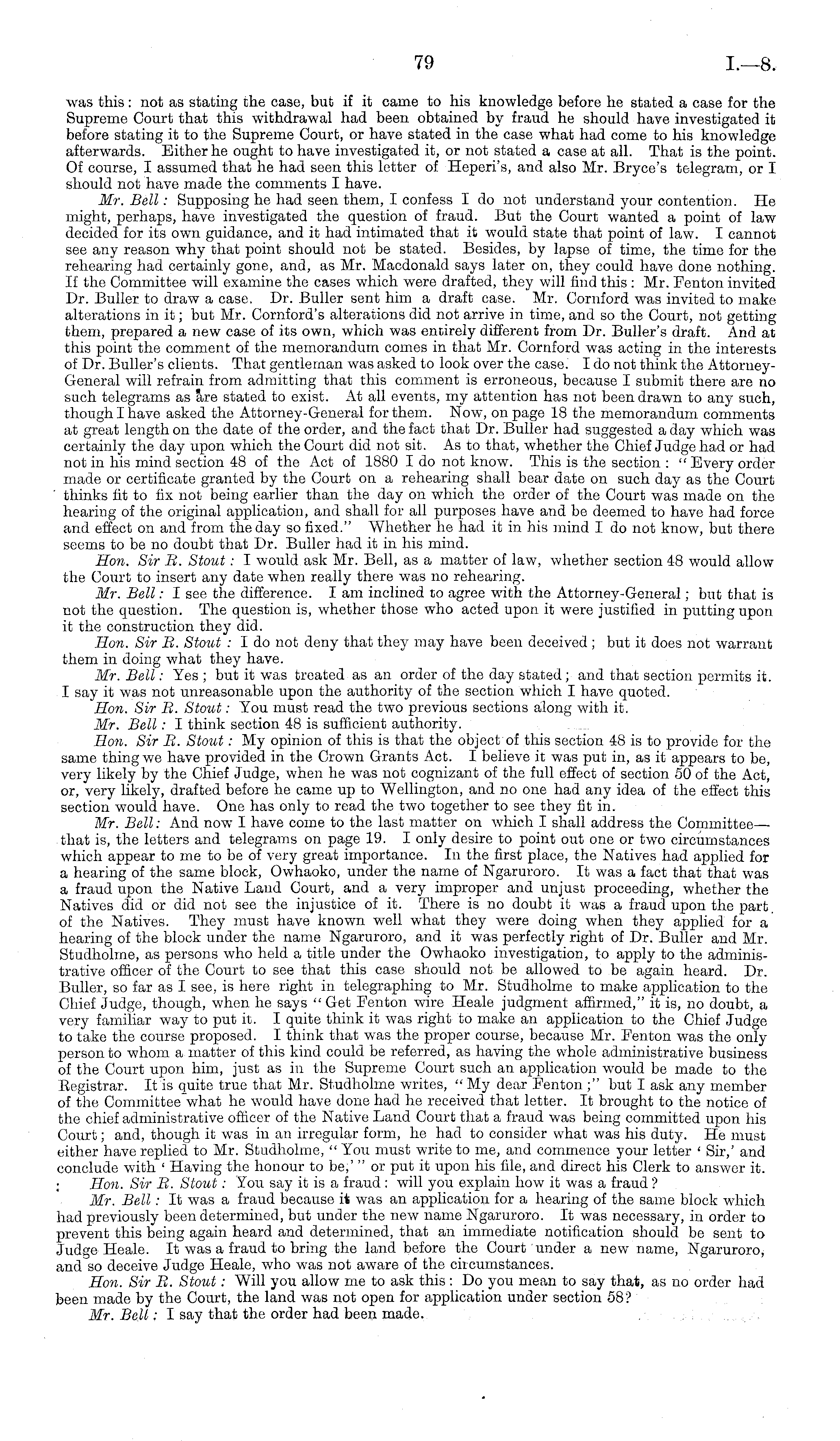 was this : not as stating the case, but if it came to his knowledge before he stated a case for the Supreme Court that this withdrawal had been obtained by fraud he should have investigated it before stating it to the Supreme Court, or have stated in the case what had come to his knowledge afterwards. Either he ought to have investigated it, or not stated a case at all. That is the point. Of course, I assumed that he had seen this letter of Heperi's, and also Mr. Bryce's telegram, or I should not have made the comments I have. Mr. Bell: Supposing he had seen them, I confess Ido not understand your contention. He might, perhaps, have investigated the question of fraud. But the Court wanted a point of law decided for its own guidance, and it had intimated that it would state that point of law. I cannot see any reason why that point should not be stated. Besides, by lapse of time, the time for the rehearing had certainly gone, and, as Mr. Macdonald says later on, they could have done nothing. If the Committee will examine the cases which were drafted, they will find this : Mr. Fenton invited Dr. Buller to draw a case. Dr. Buller sent him a draft case. Mr. Cornford was invited to make alterations in it; but Mr. Cornford's alterations did not arrive in time, and so the Court, not getting them, prepared a new case of its own, which was entirely different from Dr. Buller's draft. And at this point the comment of the memorandum comes in that Mr. Cornford was acting in the interests of Dr. Buller's clients. That gentleman was asked to look over the case. Ido not think the AttorneyGeneral will refrain from admitting that this comment is erroneous, because I submit there are no such telegrams as are stated to exist. At all events, my attention has not been drawn to any such, though I have asked the Attorney-General for them. Now, on page 18 the memorandum comments at great length on the date of the order, and the fact that Dr. Buller had suggested a day which was certainly the day upon which the Court did not sit. As to that, whether the Chief Judge had or had not in his mind section 48 of the Act of 1880 Ido not know. This is the section : " Every order made or certificate granted by the Court on a rehearing shall bear date on such day as the Court thinks fit to fix not being earlier than the day on which the order of the Court was made on the hearing of the original application, and shall for all purposes have and be deemed to have had force and effect on and from the day so fixed." Whether he had it in his mind Ido not know, but there seems to be no doubt that Dr. Buller had it in his mind. Hon. Sir R. Stout: I would ask Mr. Bell, as a matter of law, whether section 48 would allow the Court to insert any date when really there was no rehearing. Mr. Bell: I see the difference. lam inclined to agree with the Attorney-General; but that is not the question. The question is, whether those who acted upon it were justified in putting upon it the construction they did. Hon. Sir B. Stout : Ido not deny that they- may have been deceived; but it does not warrant them in doing what they have. Mr. Bell: Yes ; but it was treated as an order of the day stated; and that section permits it. I say it was not unreasonable upon the authority of the section which I have quoted. Hon. Sir R. Stout: You must read the two previous sections a,long with it. Mr. Bell: I think section 48 is sufficient authority. Hon. Sir R. Stout: My opinion of this is that the object of this section 48 is to provide for the same thing we have provided in the Crown Grants Act. I believe it was put in, as it appears to be, very likely by the Chief Judge, when he was not cognizant of the full effect of section 50 of the Act, or, very likely, drafted before he came up to Wellington, and no one had any idea of the effect this section would have. One has only to read the two together to see they fit in. Mr. Bell: And now I have come to the last matter on which I shall address the Committee— that is, the letters and telegrams on page 19. I only desire to point out one or two circumstances which appear to me to be of very great importance. In the first place, the Natives had applied for a hearing of the same block, Owhaoko, under the name of Ngaruroro. It was a fact that that was a fraud upon the Native Land Court, and a very improper and unjust proceeding, whether the Natives did or did not see the injustice of it. There is no doubt it was a fraud upon the part, of the Natives. They must have known well what they were doing when they applied for a hearing of the block under the name Ngaruroro, and it was perfectly right of Dr. Buller and Mr. Studholme, as persons who held a title under the Owhaoko investigation, to apply to the administrative officer of the Court to see that this case should not be allowed to be again heard. Dr. Buller, so far as I see, is here right in telegraphing to Mr. Studholme to make application to the Chief Judge, though, when he says " Get Fenton wire Heale judgment affirmed," it is, no doubt, a very familiar way to put it. I quite think it was right to make an application to the Chief Judge to take the course proposed. I think that was the proper course, because Mr. Fenton was the onlyperson to whom a matter of this kind could be referred, as having the whole administrative business of the Court upon him, just as in the Supreme Court such an application would be made to the Begistrar. It is quite true that Mr. Studholme writes, "My dear Fenton ;" but I ask any member of the Committee what he would have done had he received that letter. It brought to the notice of the chief administrative officer of the Native Land Court that a fraud was being committed upon his Court; and, though it was in an irregular form, he had to consider what was his duty. He must either have replied to Mr. Studholme, " You must write to me, and commence your letter ' Sir,' and conclude with ' Having the honour to be,' " or put it upon his file,