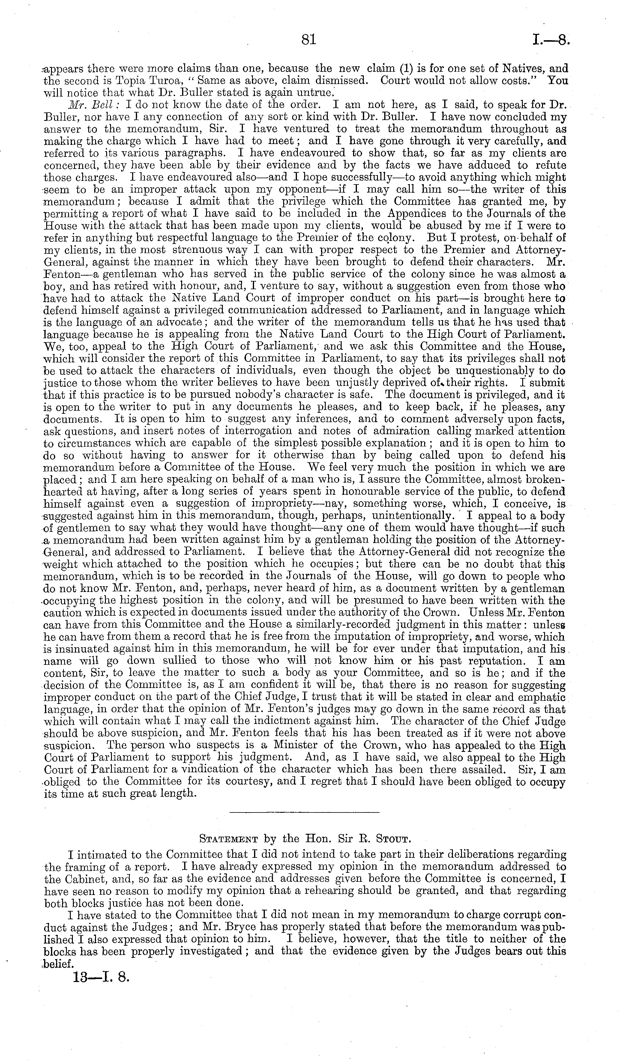 Statement by the Hon. Sir B. Stout. I intimated to the Committee that I did not intend to take part in their deliberations regarding the framing of a report. I have already expressed my opinion in the memorandum addressed to the Cabinet, and, so far as the evidence and addresses given before the Committee is concerned, I have seen no reason to modify my opinion that a rehearing should be granted, and that regarding both blocks justice has not been done. I have stated to the Committee that I did not mean in my memorandum to charge corrupt conduct against the Judges; and Mr. Bryce has properly stated that before the memorandum was published I also expressed that opinion to him. I believe, however, that the title to neither of the blocks has been properly investigated ; and that the evidence given by the Judges bears out this belief.