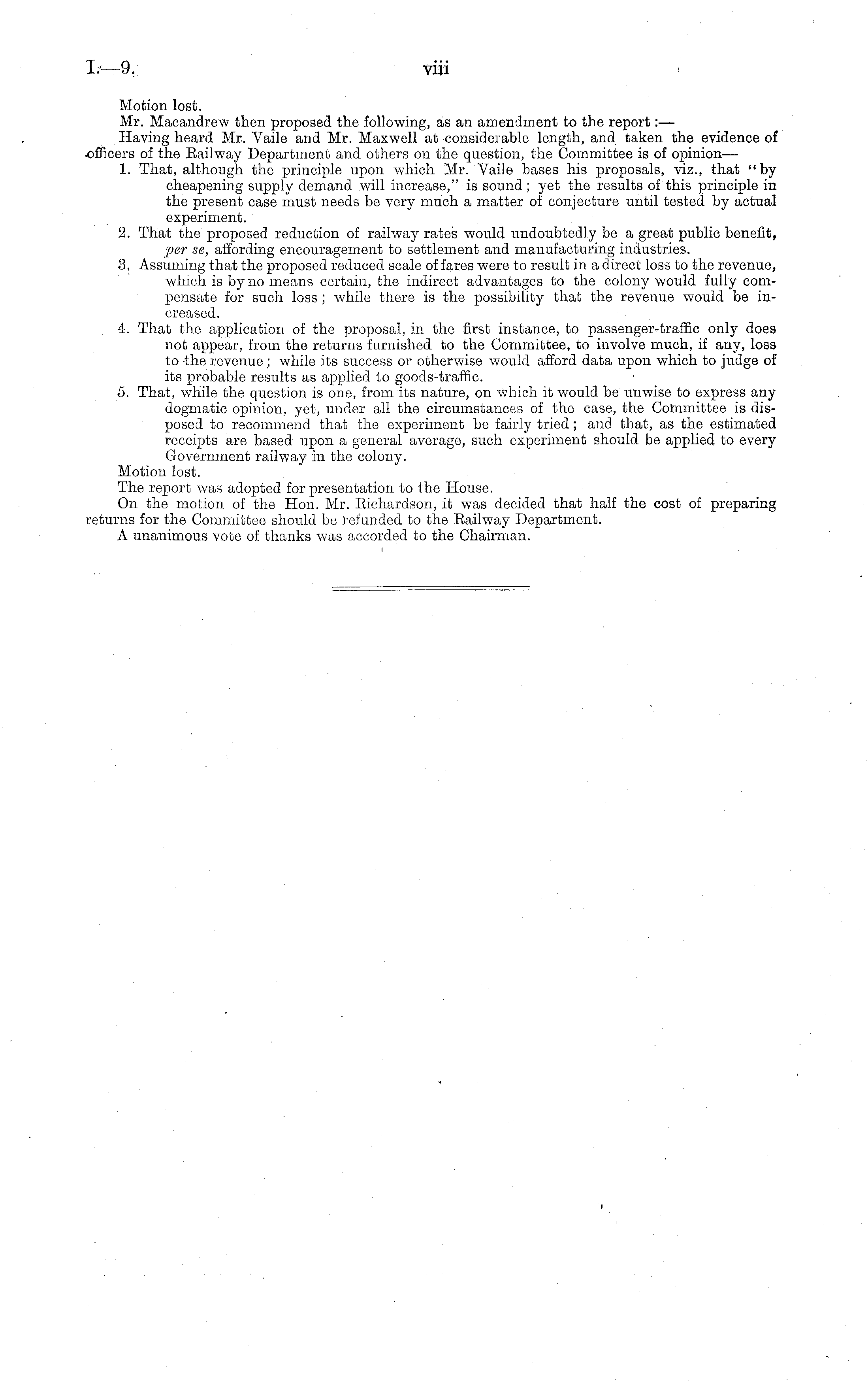 Motion lost. Mr. Macandrew then proposed the following, as an amendment to the report:— Having heard Mr. Vaile and Mr. Maxwell at considerable length, and taken the evidence of officers of the Eailway Department and others on the question, the Committee is of opinion— 1. That, although the principle upon which Mr. Vaile bases his proposals, viz., that "by cheapening supply demand will increase," is sound; yet the results of this principle in the present case must needs be very much a matter of conjecture until tested by actual experiment. 2. That the proposed reduction of railway rates would undoubtedly be a great public benefit, per se, affording encouragement to settlement and manufacturing industries. 3. Assuming that the proposed reduced scale of fares were to result in a direct loss to the revenue, which is by no means certain, the indirect advantages to the colony would fully compensate for such loss ; while there is the possibility that the revenue would be increased. 4. That the application of the proposal, in the first instance, to passenger-traffic only does not appear, from the returns furnished to the Committee, to involve much, if any, loss to the revenue ; while its success or otherwise would afford data upon which to judge of its probable results as applied to goods-traffic. 5. That, while the question is one, from its nature, on which it would be unwise to express any dogmatic opinion, yet, under all the circumstances of the case, the Committee is disposed to recommend that the experiment be fairly tried; and that, as the estimated receipts are based upon a general average, such experiment should be applied to every Government railway in the colony. Motion lost. The report was adopted for presentation to the House. On the motion of the Hon. Mr. Eichardson, it was decided that half the cost of preparing returns for the Committee should be refunded to the Eailway Department. A unanimous vote of thanks was accorded to the Chairman.