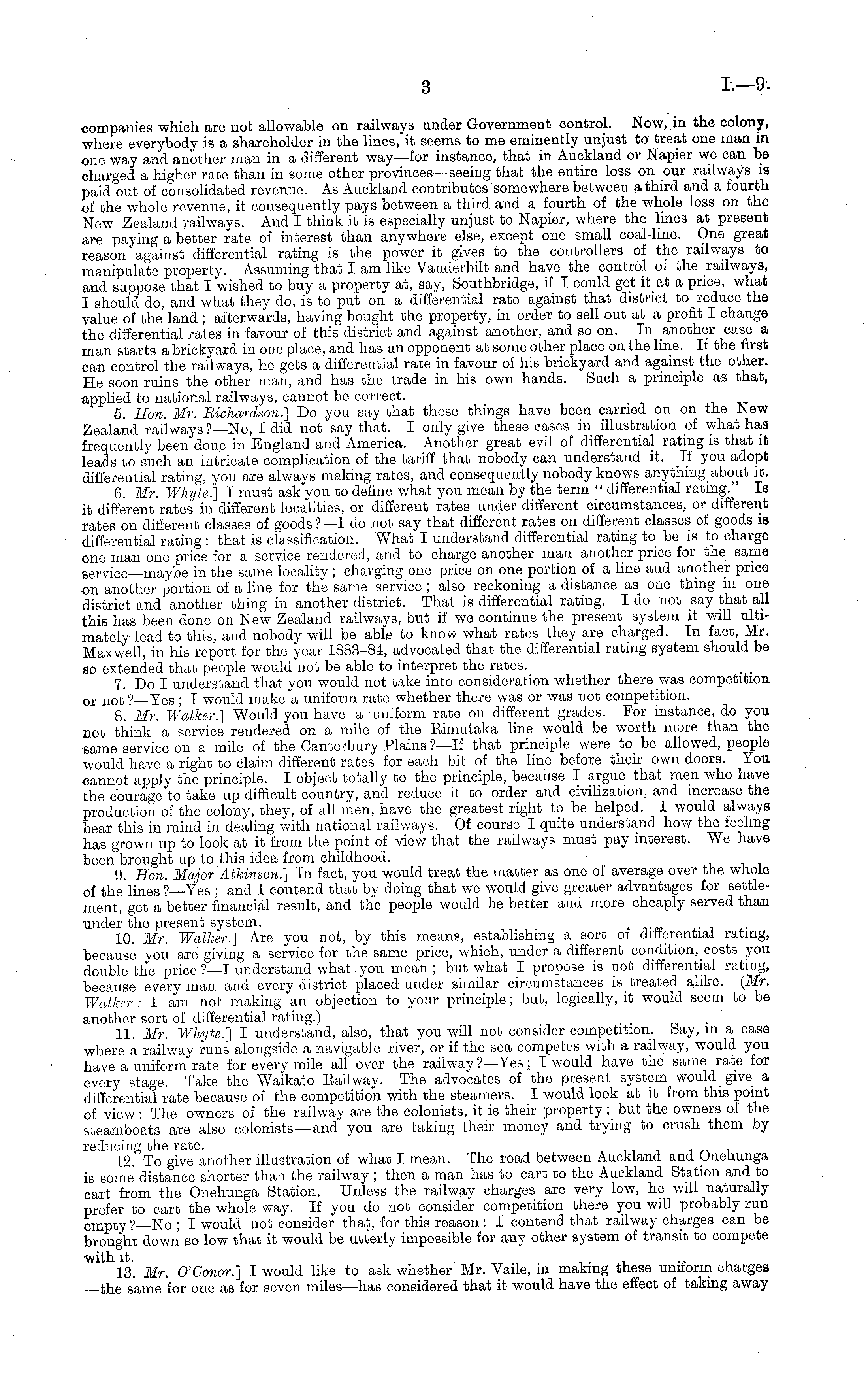 companies which are not allowable on railways under Government control. Now, in the colony, where everybody is a shareholder in the lines, it seems to me eminently unjust to treat one man in one way and another man in a different way—for instance, that in Auckland or Napier we can be charged a higher rate than in some other provinces—seeing that the entire loss on our railways is paid out of consolidated revenue. As Auckland contributes somewhere between a third and a fourth of the whole revenue, it consequently pays between a third and a fourth of the whole loss on the New Zealand railways. And I think it is especially unjust to Napier, where the lines at present are paying a better rate of interest than anywhere else, except one small coal-line. One great reason against differential rating is the power it gives to the controllers of the railways to manipulate property. Assuming that lam like Vanderbilt and have the control of the railways, and suppose that I wished to buy a property at, say, Southbridge, if I could get h at a price, what I should do, and what they do, is to put on a differential rate against that district to reduce the value of the land ; afterwards, having bought the property, in order to sell out at a profit I change the differential rates in favour of this district and against another, and so on. In another case a man starts a brickyard in one place, and has an opponent at some other place on the line. If the first can control the railways, he gets a differential rate in favour of his brickyard and against the other. He soon ruins the other man, and has the trade in his own hands. Such a principle as that, applied to national railways, cannot be correct. 5. Hon. Mr. Do you say that these things have been carried on on the New Zealand railways ?—No, I did not say that. I only give these cases in illustration of what has frequently been done in England and America. Another great evil of differential rating is that it leads to such an intricate complication of the tariff that nobody can understand it. If you adopt differential rating, you are always making rates, and consequently nobody knows anything about it. 6. Mr. Whyte.] I must ask you to define what you mean by the term " differential rating." Is it different rates in different localities, or different rates under different circumstances, or different rates on different classes of goods ?—I do not say that different rates on different classes of goods is differential rating : that is classification. What I understand differential rating to be is to charge one man one price for a service rendered, and to charge another man another price for the same service—maybe in the same locality ; charging one price on one portion of a line and another price on another portion of a line for the same service ; also reckoning a distance as one thing m one district and another thing in another district. That is differential rating. Ido not say that all this has been done on New Zealand railways, but if we continue the present system it will ultimately lead to this, and nobody will be able to know what rates they are charged. In fact, Mr. Maxwell, in his report for the year 1883-84, advocated that the differential rating system should be so extended that people would not be able to interpret the rates. 7. Do I understand that you would not take into consideration whether there was competition or not ?—Yes; I would make a uniform rate whether there was or was not competition. 8. Mr. Walker.] Would you have a uniform rate on different grades. For instance, do you not think a service rendered on a mile of the Eimutaka line would be worth more than the same service on a mile of the Canterbury Plains ?—lf that principle were to be allowed, people would have a right to claim different rates for each bit of the line before their own doors. You cannot apply the principle. I object totally to the principle, because I argue that men who have the courage to take up difficult country, and reduce it to order and civilization, and increase the production of the colony, they, of all men, have the greatest right to be helped. I would always bear this in mind in dealing with national railways. Of course I quite understand how the feeling has grown up to look at it from the point of view that the railways must pay interest. We have been brought up to this idea from childhood. 9. Hon. Major Atkinson.] In fact, you would treat the matter as one of average over the whole of the lines ?—Yes ; and I contend that by doing that we would give greater advantages for settlement, get a better financial result, and the people would be better and more cheaply served than under the present system. 10. Mr. Walker.] Are you not, by this means, establishing a sort of differential rating, because you are giving a service for the same price, which, under a different condition, costs you double the price ?—I understand what you mean ; but what I propose is not differential rating, because every man and every district placed under similar circumstances is treated alike. (Mr. Walker: I am not making an objection to your principle; but, logically.it would seem to be another sort of differential rating.) _ _ 11. Mr. Whyte.] I understand, also, that you will not consider competition, bay, in a case where a railway runs alongside a navigable river, or if the sea competes with a railway, would you have a uniform rate for every mile all over the railway ?—Yes; I would have the same rate for every stage. Take the Waikato Bailway. The advocates of the present system would give a differential rate because of the competition with the steamers. I would look at it from this point of view: The owners of the railway are the colonists, it is their property; but the owners of the steamboats are also colonists—and you are taking their money and trying to crush them by reducing the rate. 12. To give another illustration of what I mean. The road between Auckland and