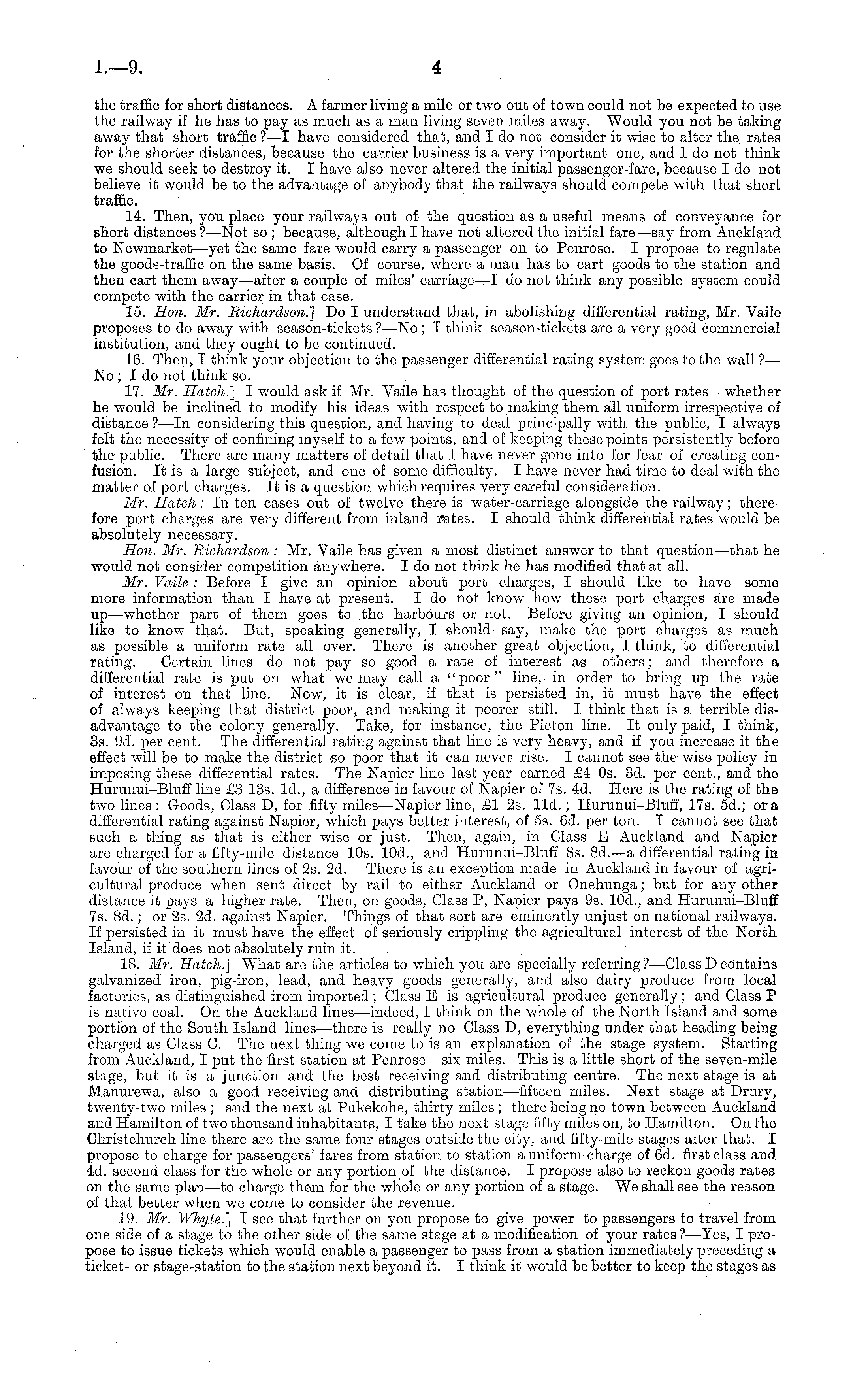 the traffic for short distances. A farmer living a mile or two out of town could not be expected to use the railway if he has to pay as much as a man living seven miles away. Would you not be taking away that short traffic ? —I have considered that, and I do not consider it wise to alter the rates for the shorter distances, because the carrier business is a very important one, and I do not think we should seek to destroy it. I have also never altered the initial passenger-fare, because Ido not believe it would be to the advantage of anybody that the railways should compete with that short traffic. 14. Then, you place your railways out of the question as a useful means of conveyance for short distances ?—Not so ; because, although I have not altered the initial fare—say from Auckland to Newmarket—yet the same fare would carry a passenger on to Penrose. I propose to regulate the goods-traffic on the same basis. Of course, where a man has to cart goods to the station and then cart them away —after a couple of miles' carriage—l do not think any possible system could compete with the carrier in that case. 15. Hon. Mr. Richardson.} Do I understand that, in abolishing differential rating, Mr. Vaile proposes to do away with season-tickets ? —No; I think season-tickets are a very good commercial institution, and they ought to be continued. 16. Then, I think your objection to the passenger differential rating system goes to the wall ?— No ; I do not think so. 17. Mr. Hatch.} I would ask if Mr. Vaile has thought of the question of port rates—whether he would be inclined to modify his ideas with respect to making them all uniform irrespective of distance ? —ln considering this question, and having to deal principally with the public, I always felt the necessity of confining myself to a few points, and of keeping these points persistently before the public. There are many matters of detail that I have never gone into for fear of creating confusion. It is a large subject, and one of some difficulty. I have never had time to deal with the matter of port charges. It is a question which requires very careful consideration. Mr. Hatch: In ten cases out of twelve there is water-carriage alongside the railway; therefore port charges are very different from inland Bates. I should think differential rates would be absolutely necessary. Hon. Mr. Richardson : Mr. Vaile has given a most distinct answer to that question—that he would not consider competition anywhere. Ido not think he has modified that at all. Mr. Vaile : Before I give an opinion about port charges, I should like to have some more information than I have at present. Ido not know how these port charges are made up—whether part of them goes to the harbours or not. Before giving an opinion, I should like to know that. But, speaking generally, I should say, make the port charges as much as possible a uniform rate all over. There is another great objection, I think, to differential rating. Certain lines do not pay so good a rate of interest as others; and therefore a differential rate is put on what we may call a "poor" line, in order to bring up the rate of interest on that line. Now, it is clear, if that is persisted in, it must have the effect of always keeping that district poor, and making it poorer still. I think that is a terrible disadvantage to the colony generally. Take, for instance, the Picton line. It only paid, I think, 3s. 9d. per cent. The differential rating against that line is very heavy, and if you increase it the effect will be to make the district so poor that it can never rise. I cannot see the wise policy in imposing these differential rates. The Napier line last year earned £4 Os. 3d. per cent., and the Hurunui-Bluff line £3 13s. Id., a difference in favour of Napier of 7s. 4d. Here is the rating of the two lines: Goods, Class D, for fifty miles —Napier line, £1 2s. lid.; Hurunui-Bluff, 17s. 5d.; or a differential rating against Napier, which pays better interest, of ss. 6d. per ton. I cannot see that such a thing as that is either wise or just. Then, again, in Class E Auckland and Napier are charged for a fifty-mile distance 10s. 10d., and Hurunui-Bluff Bs. Bd.—a differential rating in favour of the southern lines of 2s. 2d. There is an exception made in Auckland in favour of agricultural produce when sent direct by rail to either Auckland or Onehunga; but for any other distance it pays a higher rate. Then, on goods, Class P, Napier pays 9s. 10d., and Hurunui-Bluff 7s. Bd.; or 2s. 2d. against Napier. Things of that sort are eminently unjust on national railways. If persisted in it must have the effect of seriously crippling the agricultural interest of the North Island, if it does not absolutely ruin it. 18. Mr. Hatch.} What are the articles to which you are specially referring? —Class D contains galvanized iron, pig-iron, lead, and heavy goods generally, and also dairy produce from local factories, as distinguished from imported ; Class E is agricultural produce generally; and Class P is native coal. On the Auckland lines—indeed, I think on the whole of the North Island and some portion of the South Island lines—there is really no Class D, everything under that heading being charged as Class C. The next thing we come to is an explanation of the stage system. Starting from Auckland, I put the first station at Penrose —six miles. This is a little short of the seven-mile stage, but it is a junction and the best receiving and distributing centre. The next stage is at Manurewa, also a good receiving and distributing station —fifteen miles. Next stage at Drury, twenty-two miles ; and the next at Pukekohe, thirty miles ; there being no town between Auckland and Hamilton of two thousand inhabitants, I take the next stage fifty miles on, to Hamilton. On the Christchurch line there are the same four stages outside the city, and fifty-mile stages after that. I propose to charge for passengers' fa