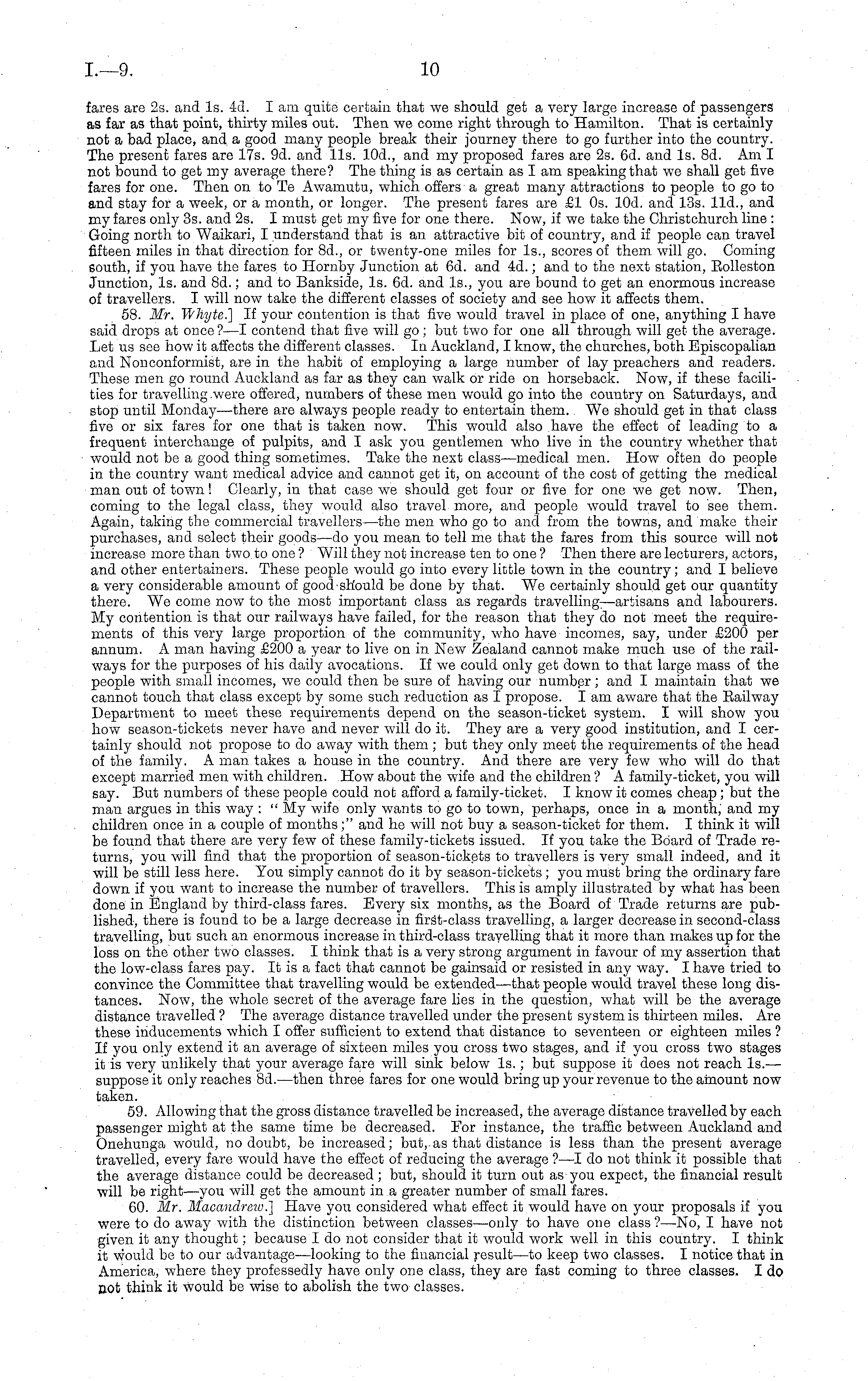 fares are 2s. and Is. 4d. lam quite certain that we should get a very large increase of passengers as far as that point, thirty miles out. Then we come right through to Hamilton. That is certainly not a bad place, and a good many people break their journey there to go further into the country. The present fares are 17s. 9d. and lis. 10d., and my proposed fares are 2s. 6d. and Is. Bd. Am I not bound to get my average there? The thing is as certain as lam speaking that we shall get five fares for one. Then on to Te Awamutu, which offers a great many attractions to people to go to and stay for a week, or a month, or longer. The present fares are £1 Os. lOd. and 13s. lid., and my fares only 3s. and 2s. I must get my five for one there. Now, if we take the Christchurch line : Going north to Waikari, I understand that is an attractive bit of country, and if people can travel fifteen miles in that direction for Bd., or twenty-one miles for Is., scores of them will go. Coming south, if you have the fares to Hornby Junction at 6d. and 4d.; and to the next station, Eolleston Junction, Is. and Bd.; and to Bankside, Is. 6d. and Is., you are bound to get an enormous increase of travellers. I will now take the different classes of society and see how it affects them. 58. Mr. Whyte.} If your contention is that five would travel in place of one, anything I have said drops at once?—l contend that five will go; but two for one all through will get the average. Let us see how it affects the different classes. In Auckland, I know, the churches, both Episcopalian and Nonconformist, are in the habit of employing a large number of lay preachers and readers. These men go round Auckland as far as they can walk or ride on horseback. Now, if these facilities for travelling .were offered, numbers of these men would go into the country on Saturdays, and stop until Monday—there are always people ready to entertain them. We should get in that class five or six fares for one that is taken now. This would also have the effect of leading to a frequent interchange of pulpits, and I ask you gentlemen who live in the country whether that would not be a good thing sometimes. Take the next class—medical men. How often do people in the country want medical advice and cannot get it, on account of the cost of getting the medical man out of town! Clearly, in that case we should get four or five for one we get now. Then, coming to the legal class, they would also travel more, and people would travel to see them. Again, taking the commercial travellers —the men who go to and from the towns, and make their purchases, and select their goods—do you mean to tell me that the fares from this source will not increase more than two. to one ? Will they not increase ten to one ? Then there are lecturers, actors, and other entertainers. These people would go into every little town in the country; and I believe a very considerable amount of good should be done by that. We certainly should get our quantity there. We come now to the most important class as regards travellings—artisans and labourers. My contention is that our railways have failed, for the reason that they do not meet the requirements of this very large proportion of the community, who have incomes, say, under £200 per annum. A man having £200 a year to live on in New Zealand cannot make much use of the railways for the purposes of his daily avocations. If we could only get down to that large mass of the people with small incomes, we could then be sure of having our number; and I maintain that we cannot touch that class except by some such reduction as I propose. lam aware that the Eailway Department to meet these requirements depend on the season-ticket system. I will show you how season-tickets never have and never will do it. They are a very good institution, and I certainly should not propose to do away with them ; but they only meet the requirements of the head of the family. A man takes a house in the country. And there are very few who will do that except married men with children. How about the wife and the children ? A family-ticket, you will say. But numbers of these people could not afford a family-ticket. I know it comes cheap; but the man argues in this way : " My wife only wants to go to town, perhaps, once in a month, and my children once in a couple of months;" and he will not buy a season-ticket for them. I think it will be found that there are very few of these family-tickets issued. If you take the Board of Trade returns, you will find that the proportion of season-tickets to travellers is very small indeed, and it will be still less here. You simply cannot do it by season-tickets ; you must bring the ordinary fare down if you want to increase the number of travellers. This is amply illustrated by what has been done in England by third-class fares. Every six months, as the Board of Trade returns are published, there is found to be a large decrease in firSt-class travelling, a larger decrease in second-class travelling, but such an enormous increase in third-class travelling that it more than makes up for the loss on the other two classes. I think that is a very strong argument in favour of my assertion that the low-class fares pay. It is a fact that cannot be gainsaid or resisted in any way. I have tried to convince the Committee that travelling would be extended—that people would travel these long distances. Now, the whole secret of the average fare lies in the question, what will be the average distance travelled ? The average distance travelled under the present system is thirteen miles. Are these inducements which I offer sufficient to extend that distance to seventeen or eighteen miles ? If you only extend it an average of sixteen miles you cross two stages, and if you cross two stages it is very unlikely that your average fare will sink below Is.; but suppose it does not reach Is.— suppose it only reaches Bel.—then three fares for one 