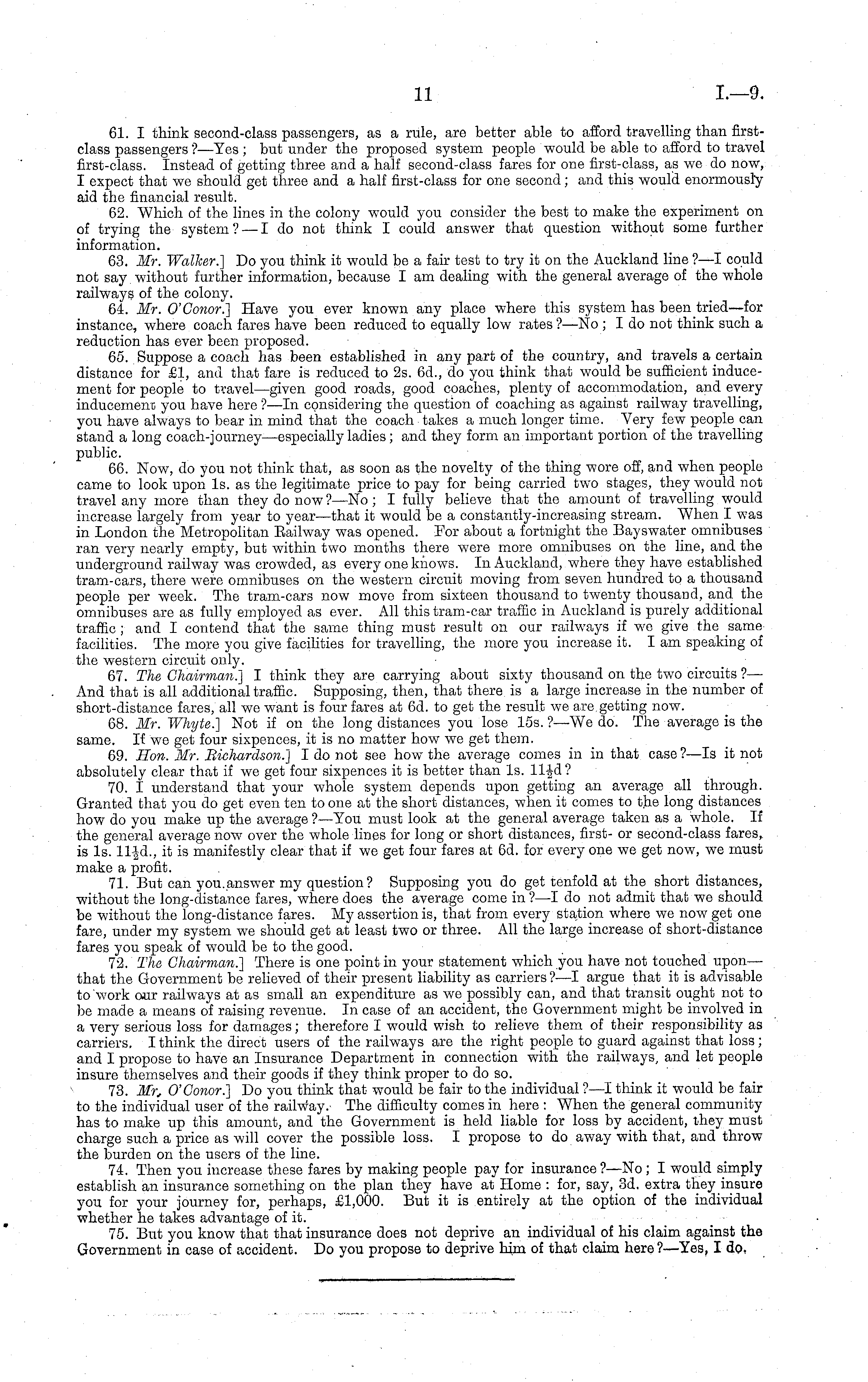 61. I think second-class passengers, as a rule, are better able to afford travelling than firstclass passengers ? —Yes ; but under the proposed system people would be able to afford to travel first-class. Instead of getting three and a half second-class fares for one first-class, as we do now, I expect that we should get three and a half first-class for one second; and this would enormously aid the financial result. 62. Which of the lines in the colony would you consider the best to make the experiment on of trying the system ?— I do not think I could answer that question without some further information. 63. Mr. Walker.} Do you think it would be a fair test to try it on the Auckland line ? —I could not say without further information, because I am dealing with the general average of the whole railways of the colony. 64. Mr. O'Conor.} Have you ever known any place where this system has been tried—for instance, where coach fares have been reduced to equally low rates ?—No ; I do not think such a reduction has ever been proposed. 65. Suppose a coach has been established in any part of the country, and travels a certain distance for £1, and that fare is reduced to 2s. 6d., do you think that would be sufficient inducement for people to travel—given good roads, good coaches, plenty of accommodation, and every inducement you have here ? —ln considering the question of coaching as against railway travelling, you have always to bear in mind that the coach takes a much longer time. Very few people can stand a long coach-journey—especially ladies; and they form an important portion of the travelling public. 66. Now, do you not think that, as soon as the novelty of the thing wore off, and when people came to look upon Is. as the legitimate price to pay for being carried two stages, they would not travel any more than they do now ? —No ; I fully believe that the amount of travelling would increase largely from year to year —that it would be a constantly-increasing stream. When I was in London the Metropolitan Eailway was opened. For about a fortnight the Bayswater omnibuses ran very nearly empty, but within two months there were more omnibuses on the line, and the underground railway was crowded, as every one knows. In Auckland, where they have established tram-cars, there were omnibuses on the western circuit moving from seven hundred to a thousand people per week. The tram-cars now movo from sixteen thousand to twenty thousand, and the omnibuses are as fully employed as ever. All this tram-car traffic in Auckland is purely additional traffic ; and I contend that the same thing must result on our railways if we give the same facilities. The more you give facilities for travelling, the more you increase it. lam speaking of the western circuit only. 67. The Chairman.} I think they are carrying about sixty thousand on the two circuits ? — And that is all additional traffic. Supposing, then, that there is a large increase in the number of short-distance fares, all we want is four fares at 6d. to get the result we are getting now. 68. Mr. Whyte.} Not if on the long distances you lose 15s. ?—We do. The average is the same. If we get four sixpences, it is no matter how we get them. 69. Hon. Mr. Richardson.} Ido not see how the average comes in in that, case ?—ls it not absolutely clear that if we get four sixpences it is better than Is. 11-Jd ? 70. I understand that your whole system depends upon getting an average all through. Granted that you do get even ten to one at the short distances, when it comes to the long distances how do you make up the average ?—You must look at the general average taken as a whole. If the general average now over the whole lines for long or short distances, first- or second-class fares, is Is. 11-|d., it is manifestly clear that if we get four fares at 6d. for every one we get now, we must make a profit. 71. But can you.answer my question? Supposing you do get tenfold at the short distances, without the long-distance fares, where does the average come in ?—I do not admit that we should be without the long-distance fares. My assertion is, that from every station where we now get one fare, under my system we should get at least two or three. All the large increase of short-distance fares you speak of would be to the good. 72. The Chairman.} There is one point in your statement which you have not touched upon— that the Government be relieved of their present liability as carriers ? —I argue that it is advisable to'work our railways at as small an expenditure as we possibly can, and that transit ought not to be made a means of raising revenue. In case of an accident, the Government might be involved in a very serious loss for damages; therefore I would wish to relieve them of their responsibility as carriers, I think the direct users of the railways are the right people to guard against that loss; and I propose to have an Insurance Department in connection with the railways, and let people insure themselves and their goods if they think proper to do so. 73. Mr. O'Conor.} Do you think that would be fair to the individual ?—I think it would be fair to the individual user of the railway. The difficulty comes in here : When the general community has to make up this amount, and the Government is held liable for loss by accident, they must charge such a price as will cover the possible loss. I propose to do away with that, and throw the burden on the users of the line. 74. Then you increase these fares by making people pay for insurance ?—No; I would simply establish an insurance something on the plan they have at Home : for, say, 3d. extra they insure you for your journey for, perhaps, £1,000. But it is entirely at the option of the individual whether he takes advantage of it. 75. But you know that that insurance does not deprive an individual of his claim against the Government in case of accident. Do you propose to deprive him of that claim h