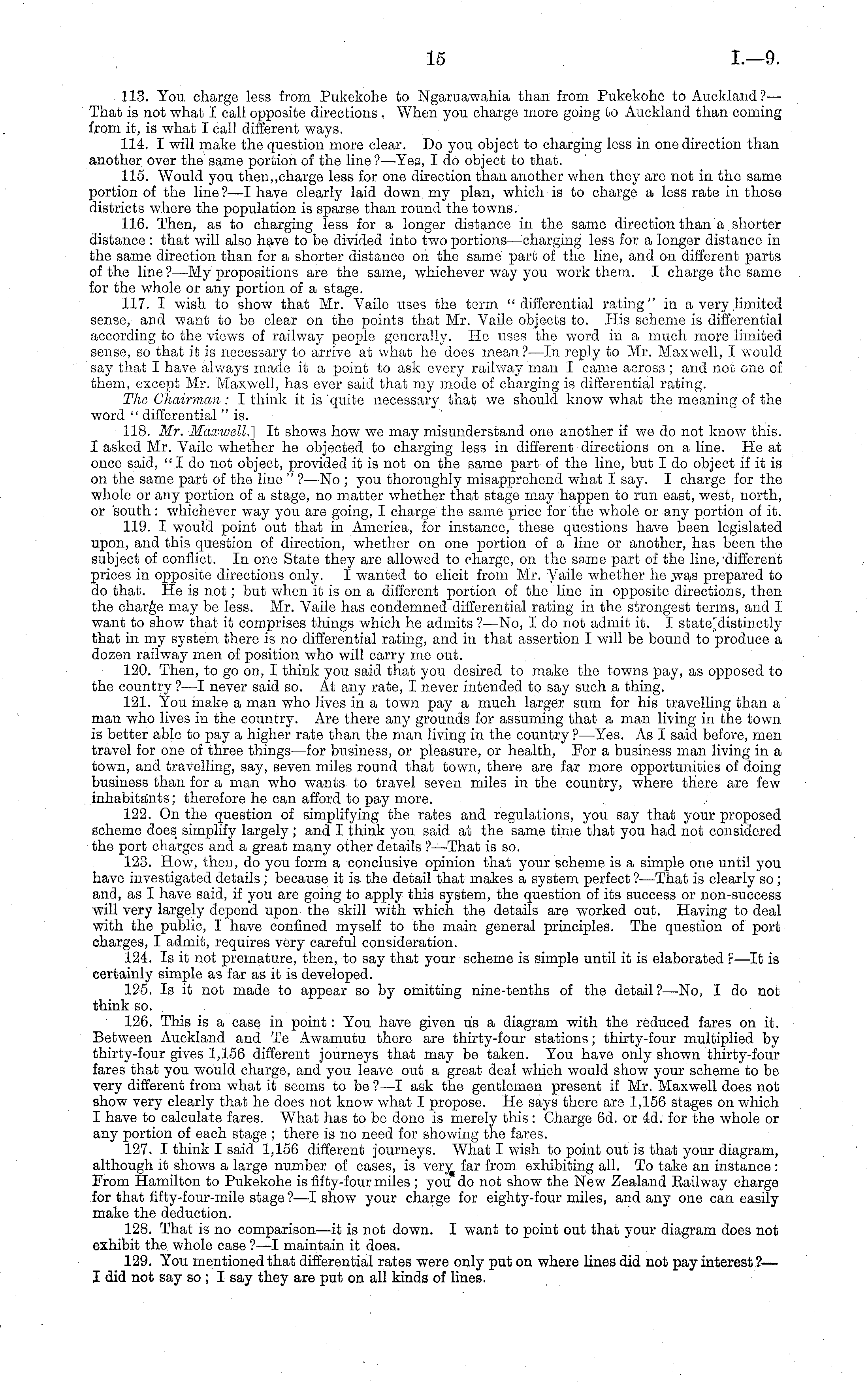 113. You charge less from Pukekohe to Ngaruawahia than from Pukekohe to Auckland?— That is not what I call opposite directions . When you charge more going to Auckland than coming from it, is what I call different ways. 114. I will make the question more clear. Do you object to charging less in one direction than another over the same portion of the line ?—Yes, I do object to that. 115. Would you then,,charge less for one direction than another when they are not in the same portion of the line ?—I have clearly laid down my plan, which is to charge a less rate in those districts where the population is sparse than round the towns. 116. Then, as to charging less for a longer distance in the same direction than a shorter distance : that will also have to be divided into two portions—charging less for a longer distance in the same direction than for a shorter distance on the same part of the line, and on different parts of the line?—My propositions are the same, whichever way you work them. I charge the same for the whole or any portion of a stage. 117. I wish to show that Mr. Vaile uses the term "differential rating" in a very limited sense, and want to be clear on the points that Mr. Vaile objects to. His scheme is differential according to the views of railway people generally. Ho uses the word in a much more limited sense, so that it is necessary to arrive at what he does mean?—ln reply to Mr. Maxwell, I would say that I have always made it a point to ask every railway man I came across; and not one of them, except Mr. Maxwell, has ever said that my mode of charging is differential rating. The Chairman : I think it is quite necessary that we should know what the meaning of the word " differential "is. 118. Mr. Maxwell.} It shows how we may misunderstand one another if we do not know this. I asked Mr. Vaile whether he objected to charging less in different directions on a line. He at once said, " I do not object, provided it is not on the same part of the line, but I do object if it is on the same part of the line " ? —No ; you thoroughly misapprehend what I say. I charge for the whole or any portion of a stage, no matter whether that stage may happen to run east, west, north, or south: whichever way you are going, I charge the same price for the whole or any portion of it. 119. I would point out that in America, for instance, these questions have been legislated upon, and this question of direction, whether on one portion of a line or another, has been the subject of conflict. In one State they are allowed to charge, on the same part of the line, 'different prices in opposite directions only. I wanted to elicit from Mr. V a ile whether he >vas prepared to do.that. He is not; but when it is on a different portion of the line in opposite directions, then the charge may be less. Mr. Vaile has condemned differential rating in the strongest terms, and I want to show that it comprises things which he admits ?—No, Ido not admit it. I state'distinctly that in my system there is no differential rating, and in that assertion I will be bound to produce a dozen railway men of position who will carry me out. 120. Then, to go on, I think you said that you desired to make the towns pay, as opposed to the country ?—I never said so. At any rate, I never intended to say such a thing. 121. You make a man who lives in a town pay a much larger sum for his travelling than a man who lives in the country. Are there any grounds for assuming that a man living in the town is better able to pay a higher rate than the man living in the country ? —Yes. As I said before, men travel for one of three things—for business, or pleasure, or health, For a business man living in a town, and travelling, say, seven miles round that town, there are far more opportunities of doing business than for a man who wants to travel seven miles in the country, where there are few inhabitants; therefore he can afford to pay more. 122. On the question of simplifying the rates and regulations, you say that your proposed scheme does simplify largely ; and I think you said at the same time that you had not considered the port charges and a great many other details ?—That is so. 123. How, then, do you form a conclusive opinion that your scheme is a simple one until you have investigated details ; because it is the detail that makes a system perfect ?—That is clearly so ; and, as I have said, if you are going to apply this system, the question of its success or non-success will very largely depend upon the skill with which the details are worked out. Having to deal with the public, I have confined myself to the main general principles. The question of port charges, I admit, requires very careful consideration. 124. Is it not premature, then, to say that your scheme is simple until it is elaborated ? —lt is certainly simple as far as it is developed. 125. Is it not made to appear so by omitting nine-tenths of the detail ? —No, I do not think so. 126. This is a case in point: You have given us a diagram with the reduced fares on it. Between Auckland and Te Awamutu there are thirty-four stations; thirty-four multiplied by thirty-four gives 1,156 different journeys that may be taken. You have only shown thirty-four fares that you would charge, and you leave out a great deal which would show your scheme to be very different from what it seems to be ?—I ask the gentlemen present if Mr. Maxwell does not show very clearly that he does not know what I propose. He says there are 1,156 stages on which I have to calculate fares. What has to be done is merely this : Charge 6d. or 4d. for the whole or any portion of each stage ; there is no need for showing the fares. 127. I think I said 1,156 different journeys. What I wish to point out is that your diagram, although it shows a large number of cases, is very far from exhibiting all. To take an instance: From Hamilton to Pukekohe is fifty-four miles ; you do not show the New Ze