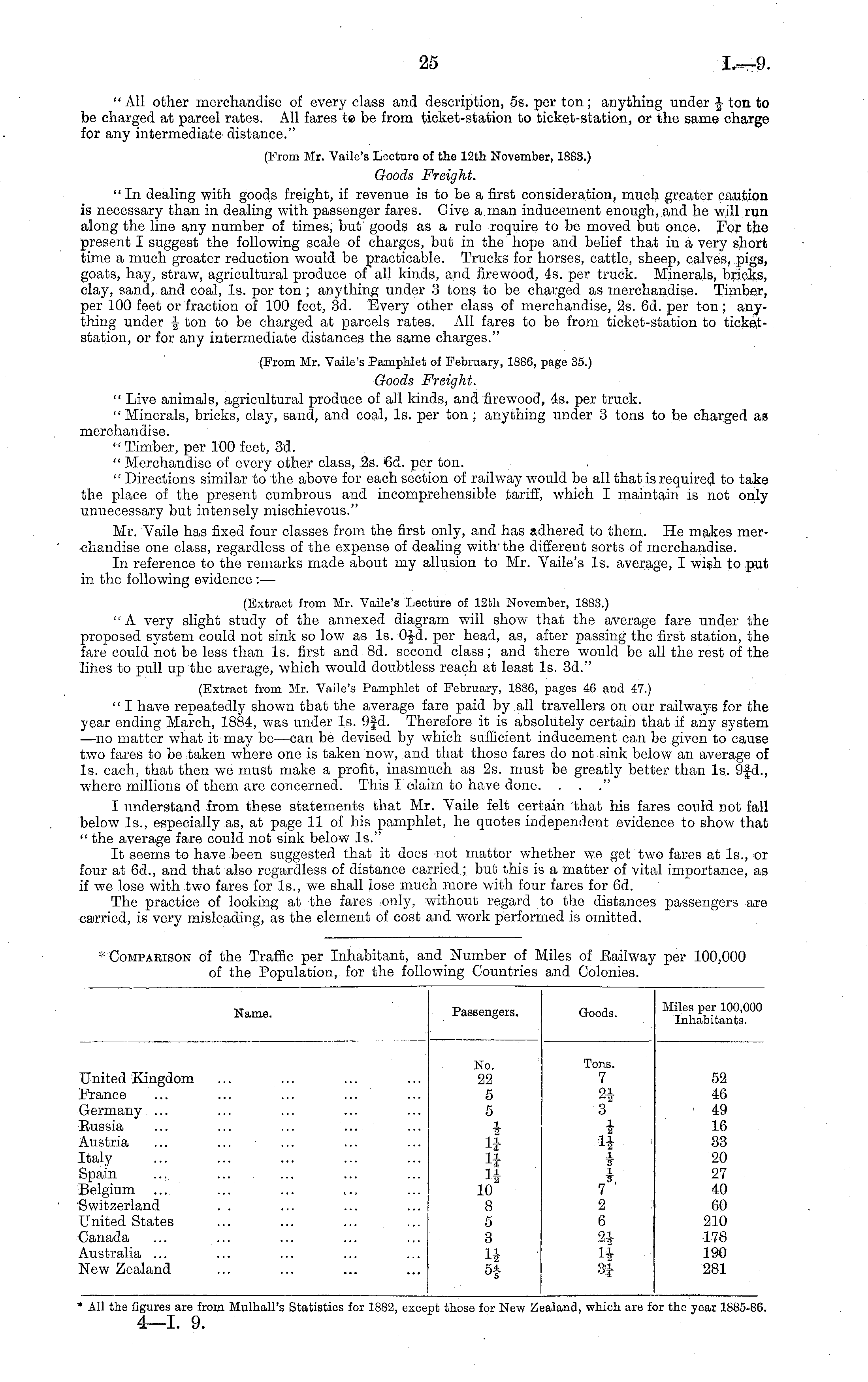"All other merchandise of every class and description, ss. per ton; anything under \ ton to be charged at parcel rates. All fares te be from ticket-station to ticket-station, or the same charge for any intermediate distance." (From Mr. Vaile's Lecture of the 12th November, 1883.) Goods Freight. "In dealing with goods freight, if revenue is to be a first consideration, much greater caution is necessary than in dealing with passenger fares. Give a man inducement enough, and he will run along the line any number of times, but goods as a rule require to be moved but once. For the present I suggest the following scale of charges, but in the hope and belief that in a very short time a much greater reduction would be practicable. Trucks for horses, cattle, sheep, calves, pigs, goats, hay, straw, agricultural produce of all kinds, and firewood, 4s. per truck. Minerals, bricks, clay, sand, and coal, Is. per ton ; anything under 3 tons to be charged as merchandise. Timber, per 100 feet or fraction of 100 feet, 3d. Every other class of merchandise, 2s. 6d. per ton; anything under \ ton to be charged at parcels rates. All fares to be from ticket-station to ticketstation, or for any intermediate distances the same charges." (From Mr. Vaile's Pamphlet of February, 1886, page 35.) Goods Freight. " Live animals, agricultural produce of all kinds, and firewood, 4s. per truck. " Minerals, bricks, clay, sand, and coal, Is. per ton ; anything under 3 tons to be charged as merchandise. "Timber, per 100 feet, 3d. " Merchandise of every other class, 2s. 6d. per ton. " Directions similar to the above for each section of railway would be all that is required to take the place of the present cumbrous and incomprehensible tariff, which I maintain is not only unnecessary but intensely mischievous." Mr. Vaile has fixed four classes from the first only, and has adhered to them. He makes merchandise one class, regardless of the expense of dealing with-the different sorts of merchandise. In reference to the remarks made about my allusion to Mr. Vaile's Is. average, I wish to put in the following evidence : — (Extract from Mr. Vaile's Lecture of 12th November, 1883.) '' A very slight study of the annexed diagram will show that the average fare under the proposed system could not sink so low as Is. o|d. per head, as, after passing the first station, the fare could not be less than Is. first and Bd. second class; and there would be all the rest of the lines to pull up the average, which would doubtless reach at least Is. 3d." (Extract from Mr. Vaile's Pamphlet of February, 1886, pages 46 and 47.) " I have repeatedly shown that the average fare paid by all travellers on our railways for the year ending March, 1884, was under Is. 9fd. Therefore it is absolutely certain that if any system —no matter what it may be —can be devised by which sufficient inducement can be given to cause two fares to be taken where one is taken now, and that those fares do not sink below an average of Is. each, that then we must make a profit, inasmuch as 2s. must be greatly better than Is. 9fd., where millions of them are concerned. This I claim to have done. I understand from these statements that Mr. Vaile felt certain 'that his fares could not fall below Is., especially as, at page 11 of his pamphlet, he quotes independent evidence to show that " the average fare could not sink below Is." It seems to have been suggested that it does not matter whether we get two fares at Is., or four at 6d., and that also regardless of distance carried; but this is a matter of vital importance, as if we lose with two fares for Is., we shall lose much more with four fares for 6d. The practice of looking at the fares only, without regard to the distances passengers are carried, is very misleading, as the element of cost and work performed is omitted.