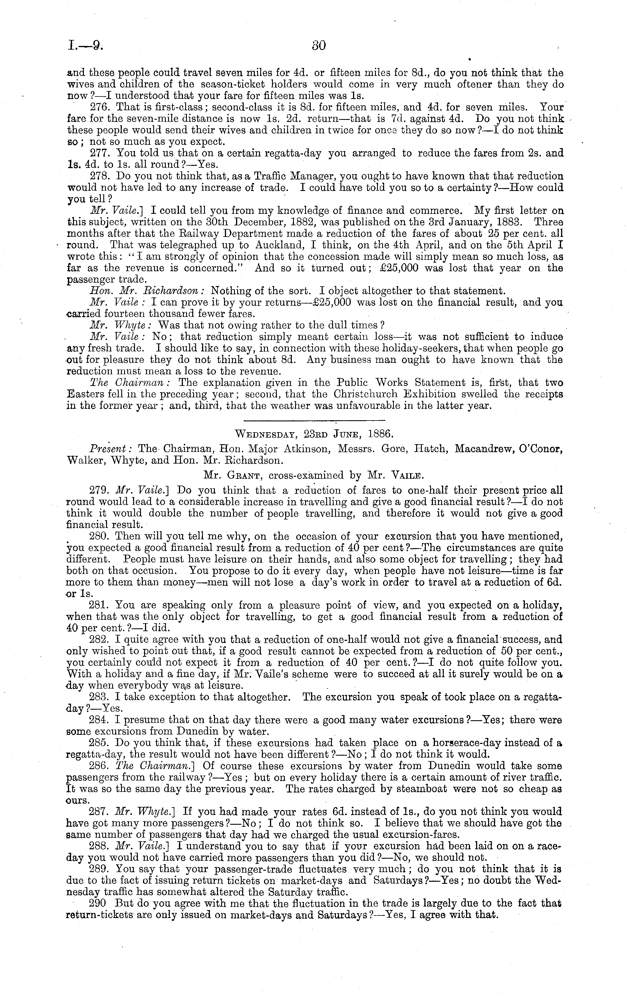 Wednesday, 23rd June, 1886. Present: The Chairman, Hon. Major Atkinson, Messrs. Gore, Hatch, Macandrew, O'Conor, Walker, Whyte, and Hon. Mr. Eichardson. Mr. Grant, cross-examined by Mr. Vaile. 279. Mr. Vaile.] Do you think that a reduction of fares to one-half their present price all round would lead to a considerable increase in travelling and give a good financial result ?—I do not think it would double the number of people travelling, and therefore it would not give a good financial result. 280. Then will you tell me why, on the occasion of your excursion that you have mentioned, you expected a good financial result from a reduction of 40 per cent ?—The circumstances are quite different. People must have leisure on their hands, and also some object for travelling; they had both on that occusion. You propose to do it every day, when people have not leisure—time is far more to them than money—men will not lose a day's work in order to travel at a reduction of 6d. or Is. 281. You are speaking only from a pleasure point of view, and you expected on a holiday, when that was the only object for travelling, to get a good financial result from a reduction of 40 per cent. ? —I did. 282. I quite agree with you that a reduction of one-half would not give a financial success, and only wished to point out that, if a good result cannot be expected from a reduction of 50 per cent., you certainly could not expect it from a reduction of 40 per cent. ?—I do not quite follow you. With a holiday and a fine day, if Mr. Vaile's scheme were to succeed at all it surely would be on a day when everybody was at leisure. 283. I take exception to that altogether. The excursion you speak of took place on a regattaday ?—Yes. 284. I presume that on that day there were a good many water excursions ?—Yes; there were some excursions from Dunedin by water. 285. Do you think that, if these excursions had taken place on a horserace-day instead of a regatta-day, the result would not have been different ? —No; I do not think it would. 286. The Chairman.] Of course these excursions by water from Dunedin would take some passengers from the railway ?—Yes ; but on every holiday there is a certain amount of river traffic. It was so the same day the previous year. The rates charged by steamboat were not so cheap as ours. 287. Mr. Whyte.] If you had made your rates 6d. instead of Is., do you not think you would have got many more passengers?—No ; I do not think so. I believe that we should have got the same number of passengers that day had we charged the usual excursion-fares. 288. Mr. Vaile.] I understand you to say that if your excursion had been laid on on a raceday you would not have carried more passengers than you did ? —No, we should not. 289. You say that your passenger-trade fluctuates very much; do you not think that it is due to the fact of issuing return tickets on market-days and Saturdays ? —Yes; no doubt the Wednesday traffic has somewhat altered the Saturday traffic. 290 But do you agree with me that the fluctuation in the trade is largely due to the fact that return-tickets are only issued on market-days and Saturdays ? —Yes, I agree with that.