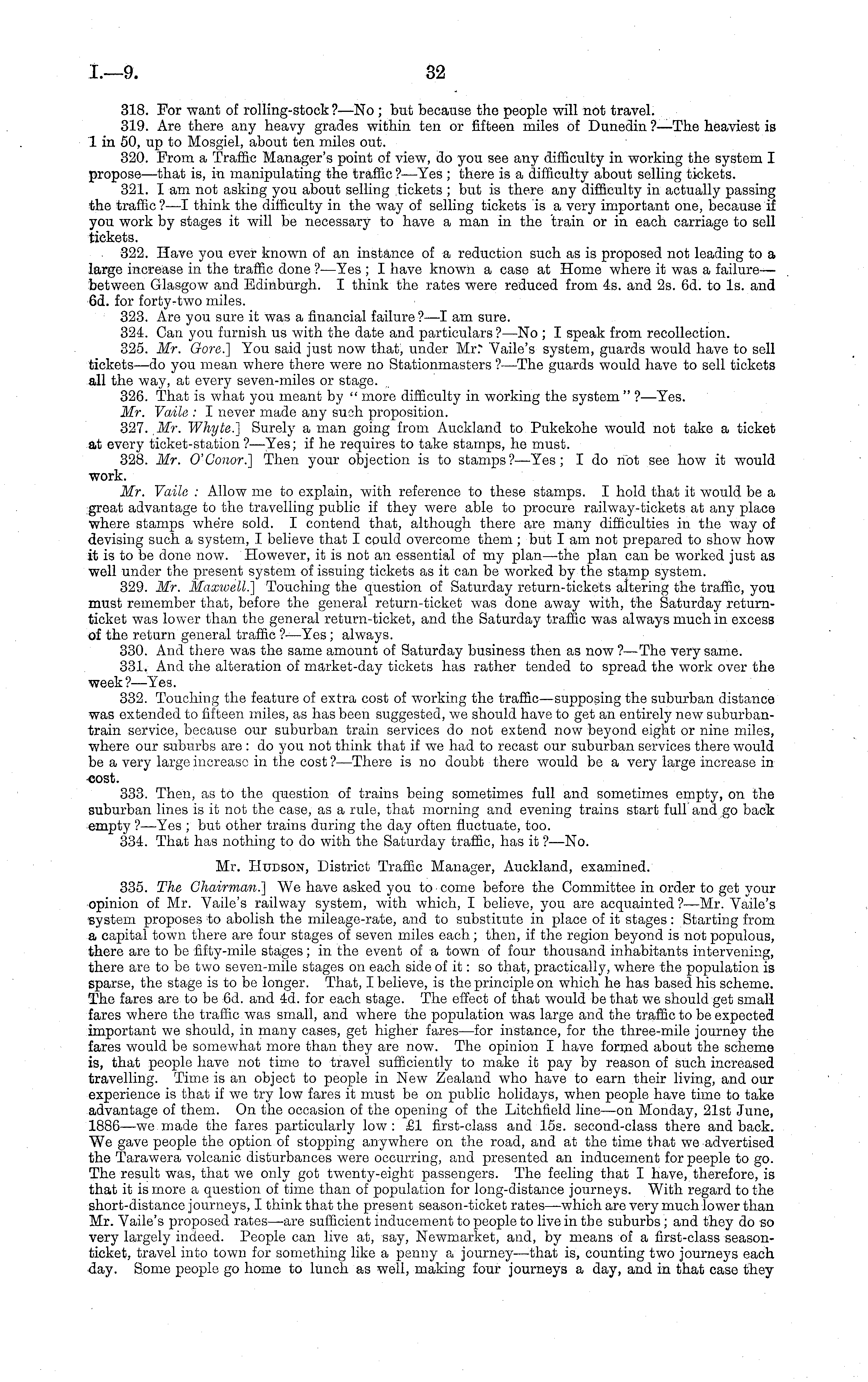 318. For want of rolling-stock ? —No ; but because the people will not travel. 319. Are there any heavy grades within ten or fifteen miles of Dunedin ?—The heaviest is 1 in 50, up to Mosgiel, about ten miles out. 320. From a Traffic Manager's point of view, do you see any difficulty in working the system I propose—that is, in manipulating the traffic ?—Yes ; there is a difficulty about selling tickets. 321. I am not asking you about selling tickets ; but is there any difficulty in actually passing the traffic ?—I think the difficulty in the way of selling tickets is a very important one, because if you work by stages it will be necessary to have a man in the train or in each carriage to sell tickets. 322. Have you ever known of an instance of a reduction such as is proposed not leading to a large increase in the traffic done ?—Yes ; I have known a case at Home where it was a failure— between Glasgow and Edinburgh. I think the rates were reduced from 4s. and 2s. 6d. to Is. and 6d. for forty-two miles. 323. Are you sure it was a financial failure ? —I am sure. 324. Can you furnish us with the date and particulars ? —No ; I speak from recollection. 325. Mr. Gore.] You said just now that, under Mr? Vaile's system, guards would have to sell tickets—do you mean where there were no Stationmasters ?—The guards would have to sell tickets all the way, at every seven-miles or stage. 326. That is what you meant by " more difficulty in working the system " ? —Yes. Mr. Vaile : I never made any such proposition. 827. Mr. Whyte.} Surely a man going from Auckland to Pukekohe would not take a ticket at every ticket-station?— Yes; if he requires to take stamps, he must. 328. Mr. O'Conor.] Then your objection is to stamps?— Yes; I do not see how it would work. Mr. Vaile : Allow me to explain, with reference to these stamps. I hold that it would be a great advantage to the travelling public if they were able to procure railway-tickets at any place where stamps where sold. I contend that, although there are many difficulties in the way of devising such a system, I believe that I cpuld overcome them ; but I am not prepared to show how it is to be done now. However, it is not an essential of my plan—the plan can be worked just as well under the present system of issuing tickets as it can be worked by the stamp system. 329. Mr. Maxiuell.] Touching the question of Saturday return-tickets altering the traffic, you must remember that, before the general return-ticket was done away with, the Saturday returnticket was lower than the general return-ticket, and the Saturday traffic was always much in excess of the return general traffic ?—Yes ; always. 330. And there was the same amount of Saturday business then as now ?—The very same. 331. And the alteration of market-day tickets has rather tended to spread the work over the week?— Yes. 332. Touching the feature of extra cost of working the traffic—supposing the suburban distance was extended to fifteen miles, as has been suggested, we should have to get an entirely new suburbantrain service, because our suburban train services do not extend now beyond eight or nine miles, where our suburbs are : do you not think that if we had to recast our suburban services there would be a very large increase in the cost ?—There is no doubt there would be a very large increase in cost. 333. Then, as to the question of trains being sometimes full and sometimes empty, on the suburban lines is it not the case, as a rule, that morning and evening trains start full and go back empty ?—Yes ; but other trains during the day often fluctuate, too. 334. That has nothing to do with the Saturday traffic, has it ?—No. Mr. Hudson, District Traffic Manager, Auckland, examined. 335. The Chairman.] We have asked you to come before the Committee in order to get your opinion of Mr. Vaile's railway system, with which, I believe, you are acquainted ?—Mr. Vaile's system proposes to abolish the mileage-rate, and to substitute in place of it stages : Starting from a capital town there are four stages of seven miles each; then, if the region beyond is not populous, there are to be fifty-mile stages; in the event of a town of four thousand inhabitants intervening, there are to be two seven-mile stages on each side of it: so that, practically, where the population is sparse, the stage is to be longer. That, I believe, is the principle on which he has based his scheme. The fares are to be 6d. and 4d. for each stage. The effect of that would be that we should get small fares where the traffic was small, and where the population was large and the traffic to be expected important we should, in many cases, get higher fares —for instance, for the three-mile journey the fares would be somewhat more than they are now. The opinion I have formed about the scheme is, that people have not time to travel sufficiently to make it pay by reason of such increased travelling. Time is an object to people in New Zealand who have to earn their living, and our experience is that if we try low fares it must be on public holidays, when people have time to take advantage of them. On the occasion of the opening of the Litchfield line—on Monday, 21st June, 1886 —we made the fares particularly low: £1 first-class and 15s. second-class there and back. We gave people the option of stopping anywhere on the road, and at the time that we advertised the Tarawera volcanic disturbances were occurring, and presented an inducement for peeple to go. The result was, that we only got twenty-eight passengers. The feeling that I have, therefore, is that it is more a question of time than of population for long-distance journeys. With regard to the short-distance journeys, I think that the present season-ticket rates—which are very much lower than Mr. Vaile's proposed rates —are sufficient inducement to people to live in the suburbs ; and they do so very largely indeed. People can live at, say, 