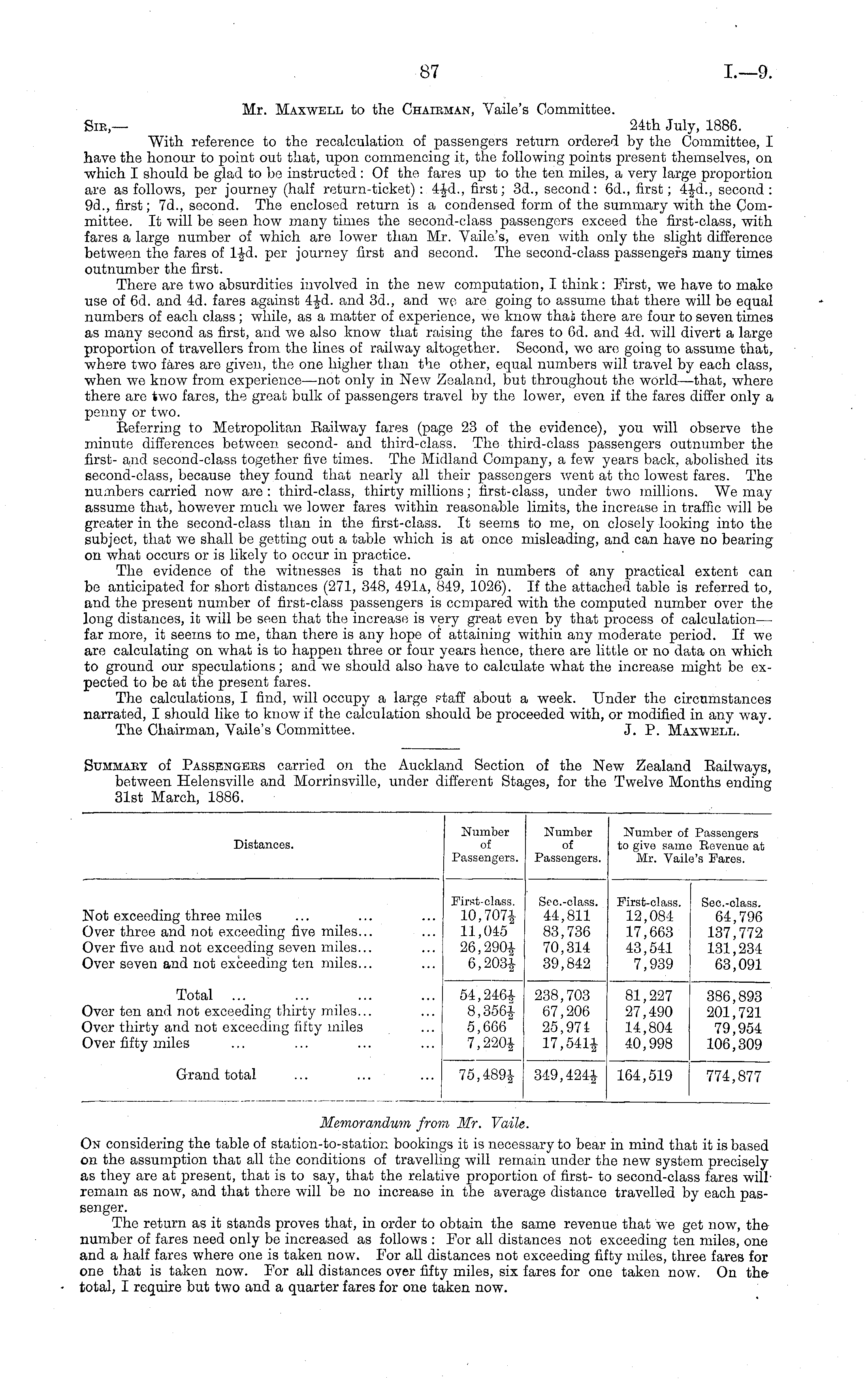 Mr. Maxwell to the Chaieman, Vaile's Committee. Sib,— 24th July, 1886. With reference to the recalculation of passengers return ordered by the Committee, I have the honour to point out that, upon commencing it, the following points present themselves, on which I should be glad to be instructed : Of the fares up to the ten miles, a very large proportion are as follows, per journey (half return-ticket): first; 3d., second: 6d., first; _Jd., second: 9d., first; 7d., second. The enclosed return is a condensed form of the summary with the Committee. It will be seen how many times the second-class passengers exceed the first-class, with fares a large number of which are lower than Mr. Vaile's, even with only the slight difference between the fares of 1-J-d. per journey first and second. The second-class passengers many times outnumber the first. There are two absurdities involved in the new computation, I think : First, we have to make use of 6d. and 4d. fares against 4!d. and 3d., and wo are going to assume that there will be equal numbers of each class ; while, as a matter of experience, we know thai there are four to seven times as many second as first, and we also know that raising the fares to 6d. and 4d. will divert a large proportion of travellers from the lines of railway altogether. Second, we are going to assume that, where two fares are given, the one higher than the other, equal numbers will travel by each class, when we know from experience—not only in New Zealand, but throughout the world —that, where there are two fares, the great bulk of passengers travel by the lower, even if the fares differ only a penny or two. Beferring to Metropolitan Eailway fares (page 23 of the evidence), you will observe the minute differences between second- and third-class. The third-class passengers outnumber the first- and second-class together five times. The Midland Company, a few years back, abolished its second-class, because they found that nearly all their passengers went at the lowest fares. The numbers carried now are : third-class, thirty millions; first-class, under two millions. We may assume that, however much we lower fares within reasonable limits, the increase in traffic will be greater in the second-class than in the first-class. It seems to me, on closely looking into the subject, that we shall be getting out a table which is at once misleading, and can have no bearing on what occurs or is likely to occur in practice. The evidence of the witnesses is that no gain in numbers of any practical extent can be anticipated for short distances (271, 348, 491 a, 849, 1026). If the attached table is referred to, and the present number of first-class passengers is compared with the computed number over the long distances, it will be seen that the increase is very great even by that process of calculation— far more, it seems to me, than there is any hope of attaining within any moderate period. If we are calculating on what is to happen three or four years hence, there are little or no data on which to ground our speculations; and. we should also have to calculate what the increase might be expected to be at the present fares. The calculations, I find, will occupy a large staff about a week. Under the circumstances narrated, I should like to know if the calculation should be proceeded with, or modified in any way. The Chairman, Vaile's Committee. J. P. Maxwell.