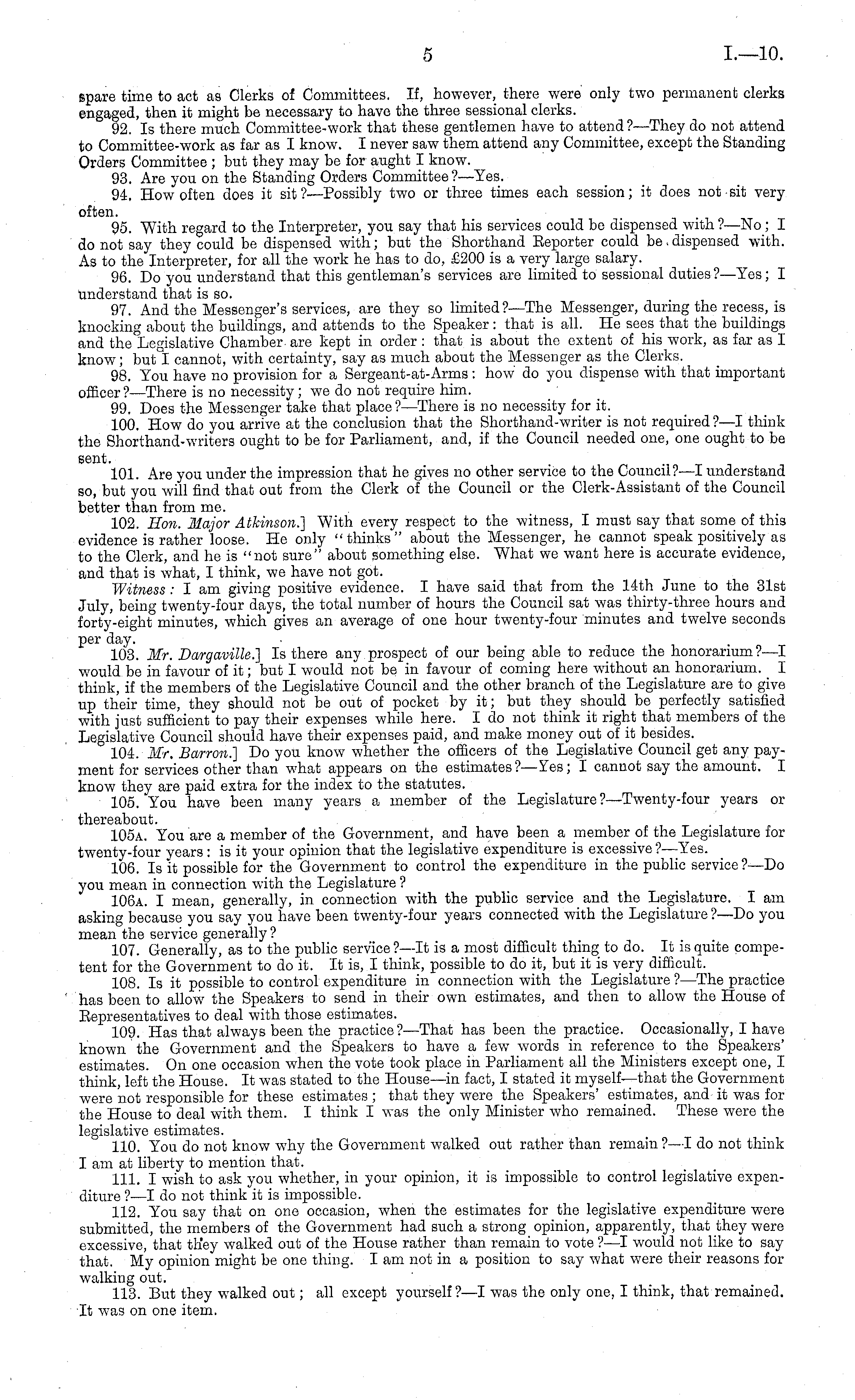 spare time to act as Clerks of Committees. If, however, there were only two permanent clerks engaged, then it might be necessary to have the three sessional clerks. 92. Is there much Committee-work that these gentlemen have to attend? —They do not attend to Committee-work as far as I know. I never saw them attend any Committee, except the Standing Orders Committee ; but they may be for aught I know. 93. Are you on the Standing Orders Committee? —Yes. 94. How often does it sit ?—Possibly two or three times each session; it does not sit very often. 95. With regard to the Interpreter, you say that his services could be dispensed with ?—No ; I do not say they could be dispensed with; but the Shorthand Eeporter could be.dispensed with. As to the Interpreter, for all the work he has to do, £200 is a very large salary. 96. Do you understand that this gentleman's services are limited to sessional duties?— Yes; I understand that is so. 97. And the Messenger's services, are they so limited?— The Messenger, during the recess, is knocking about the buildings, and attends to the Speaker : that is all. He sees that the buildings and the Legislative Chamber are kept in order : that is about the extent of his work, as far as I know; but I cannot, with certainty, say as much about the Messenger as the Clerks. 98. You have no provision for a Sergeant-at-Arms : how do you dispense with that important officer? —There is no necessity; we do not require him. 99. Does the Messenger take that place?— There is no necessity for it. 100. How do you arrive at the conclusion that the Shorthand-writer is not required ?—I think the Shorthand-writers ought to be for Parliament, and, if the Council needed one, one ought to be sent. 101. Are you under the impression that he gives no other service to the Council?—l understand so, but you will find that out from the Clerk of the Council or the Clerk-Assistant of the Council better than from me. 102. Hon. Major Atkinson.] With every respect to the witness, I must say that some of this evidence is rather loose. He only "thinks" about the Messenger, he cannot speak positively as to the Clerk, and he is "not sure" about something else. What we want here is accurate evidence, and that is what, I think, we have not got. Witness : I am giving positive evidence. I have said that from the 14th June to the 31st July, being twenty-four days, the total number of hours the Council sat was thirty-three hours and forty-eight minutes, which gives an average of one hour twenty-four minutes and twelve seconds per day. 103. Mr. Dargaville.] Is there any prospect of our being able to reduce the honorarium?—l would be in favour of it; but I would not be in favour of coming here without an honorarium. I think, if the members of the Legislative Council and the other branch of the Legislature are to give up their time, they should not be out of pocket by it; but they should be perfectly satisfied with just sufficient to pay their expenses while here. I do not think it right that members of the Legislative Council should have their expenses paid, and make money out of it besides. 104. Mr. Barron.] Do you know whether the officers of the Legislative Council get any payment for services other than what appears on the estimates?— Yes; I cannot say the amount. I know they are paid extra for the index to the statutes. 105. You have been many years a member of the Legislature ?—Twenty-four years or thereabout. 105 a. You are a member of the Government, and have been a member of the Legislature for twenty-four years : is it your opinion that the legislative expenditure is excessive ?—Yes. 106. Is it possible for the Government to control the expenditure in the public service?—Do you mean in connection with the Legislature ? 106 a. I mean, generally, in connection with the public service and the Legislature. I am asking because you say you have been twenty-four years connected with the Legislature ?—Do you mean the service generally ? 107. Generally, as to the public service?—lt is a most difficult thing to do. It is quite competent for the Government to do it. It is, I think, possible to do it, but it is very difficult. 108. Is it possible to control expenditure in connection with the Legislature ?—The practice has been to allow the Speakers to send in their own estimates, and then to allow the House of Eepresentatives to deal with those estimates. 109. Has that always been the practice?— That has been the practice. Occasionally, I have known the Government and the Speakers to have a few words in reference to the Speakers' estimates. On one occasion when the vote took place in Parliament all the Ministers except one, I think, left the House. It was stated to the House —in fact, I stated it myself—that the Government were not responsible for these estimates ; that they were the Speakers' estimates, and it was for the House to deal with them. I think I was the only Minister who remained. These were the legislative estimates. 110. You do not know why the Government walked out rather than remain ?—I do not think I am at liberty to mention that. 111. I wish to ask you whether, in your opinion, it is impossible to control legislative expenditure ?—I do not think it is impossible. 112. You say that on one occasion, when the estimates for the legislative expenditure were submitted, the members of the Government had such a strong opinion, apparently, that they were excessive, that they walked out of the House rather than remain to vote ?—I would not like to say that. My opinion might be one thing. lam not in a position to say what were their reasons for walking out. 113. But they walked out; all except yourself? —I was the only one, I think, that remained. It was on one item.