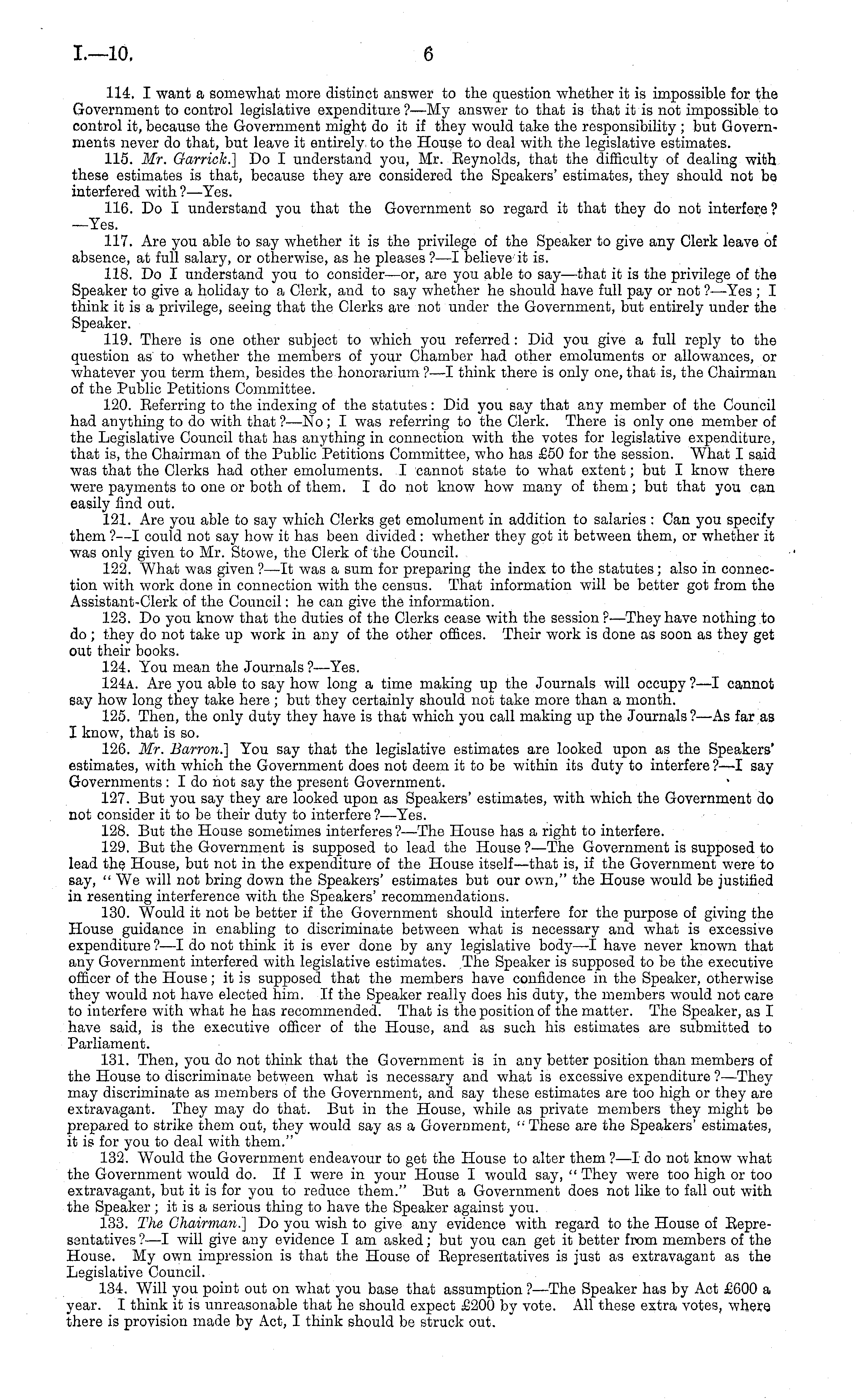 114. I want a somewhat more distinct answer to the question whether it is impossible for the Government to control legislative expenditure ?—My answer to that is that it is not impossible to control it, because the Government might do it if they would take the responsibility ; but Governments never do that, but leave it entirely to the House to deal with the legislative estimates. 115. Mr. Garrick.] Do I understand you, Mr. Eeynolds, that the difficulty of dealing with these estimates is that, because they are considered the Speakers' estimates, they should not be interfered with?— Yes. 116. Do I understand you that the Government so regard it that they do not interfere ? —Yes. 117. Are you able to say whether it is the privilege of the Speaker to give any Clerk leave of absence, at full salary, or otherwise, as he pleases ? —I believe it is. 118. Do I understand you to consider—or, are you able to say—that it is the privilege of the Speaker to give a holiday to a Clerk, and to say whether he should have full pay or not ?—Yes ; I think it is a privilege, seeing that the Clerks are not under the Government, but entirely under the Speaker. 119. There is one other subject to which you referred : Did you give a full reply to the question as to whether the members of your Chamber had other emoluments or allowances, or whatever you term them, besides the honorarium ? —I think there is only one, that is, the Chairman of the Public Petitions Committee. 120. Eeferring to the indexing of the statutes: Did you say that any member of the Council had anything to do with that ?—No; I was referring to the Clerk. There is only one member of the Legislative Council that has anything in connection with the votes for legislative expenditure, that is, the Chairman of the Public Petitions Committee, who has £50 for the session. What I said was that the Clerks had other emoluments. I cannot state to what extent; but I know there were payments to one or both of them. I do not know how many of them; but that you can easily find out. 121. Are you able to say which Clerks get emolument in addition to salaries : Can you specify them ?—I could not say how it has been divided : whether they got it between them, or whether it was only given to Mr. Stowe, the Clerk of the Council. 122. What was given ?—lt was a sum for preparing the index to the statutes ; also in connection with work done in connection with the census. That information will be better got from the Assistant-Clerk of the Council: he can give the information. 123. Do you know that the duties of the Clerks cease with the session ? —They have nothing to do ; they do not take up work in any of the other offices. Their work is done as soon as they get out their books. 124. You mean the Journals ?—Yes. 124 a. Are you able to say how long a time making up the Journals will occupy ?—I cannot say how long they take here ; but they certainly should not take more than a month. 125. Then, the only duty they have is that which you call making up the Journals ?—As far as I know, that is so. 126. Mr. Barron.] You say that the legislative estimates are looked upon as the Speakers' estimates, with which the Government does not deem it to be within its duty to interfere ? —I say Governments : I do not say the present Government. 127. But you say they are looked upon as Speakers' estimates, with which the Government do not consider it to be their duty to interfere ?—Yes. 128. But the House sometimes interferes?— The House has a right to interfere. 129. But the Government is supposed to lead the House ?—The Government is supposed to lead the House, but not in the expenditure of the House itself—that is, if the Government were to say, " We will not bring down the Speakers' estimates but our own," the House would be justified in resenting interference with the Speakers' recommendations. 130. Would it not be better if the Government should interfere for the purpose of giving the House guidance in enabling to discriminate between what is necessary and what is excessive expenditure ?—I do not think it is ever done by any legislative body—l have never known that any Government interfered with legislative estimates. The Speaker is supposed to be the executive officer of the House; it is supposed that the members have confidence in the Speaker, otherwise they would not have elected him. If the Speaker really does his duty, the members would not care to interfere with what he has recommended. That is the position of the matter. The Speaker, as I have said, is the executive officer of the House, and as such his estimates are submitted to Parliament. 131. Then, you do not think that the Government is in any better position than members of the House to discriminate between what is necessary and what is excessive expenditure ?—They may discriminate as members of the Government, and. say these estimates are too high or they are extravagant. They may do that. But in the House, while as private members they might be prepared to strike them out, they would say as a Government, "These are the Speakers' estimates, it is for you to deal with them." 132. Would the Government endeavour to get the House to alter them ?—I do not know what the Government would do. If I were in your House I would say, " They were too high or too extravagant, but it is for you to reduce them." But a Government does not like to fall out with the Speaker; it is a serious thing to have the Speaker against you. 133. The Chairman.] Do you wish to give any evidence with regard to the House of Bepressntatives ?—I will give any evidence lam asked; but you can get it better from members of the House. My own impression is that the House of Eepresentatives is just as extravagant as the Legislative Council. 134. Will you point out on what you base that assumption ?—The Speaker has by Act £600 a year. I think it is unreasonable that he should expect £200 by vote. All these 
