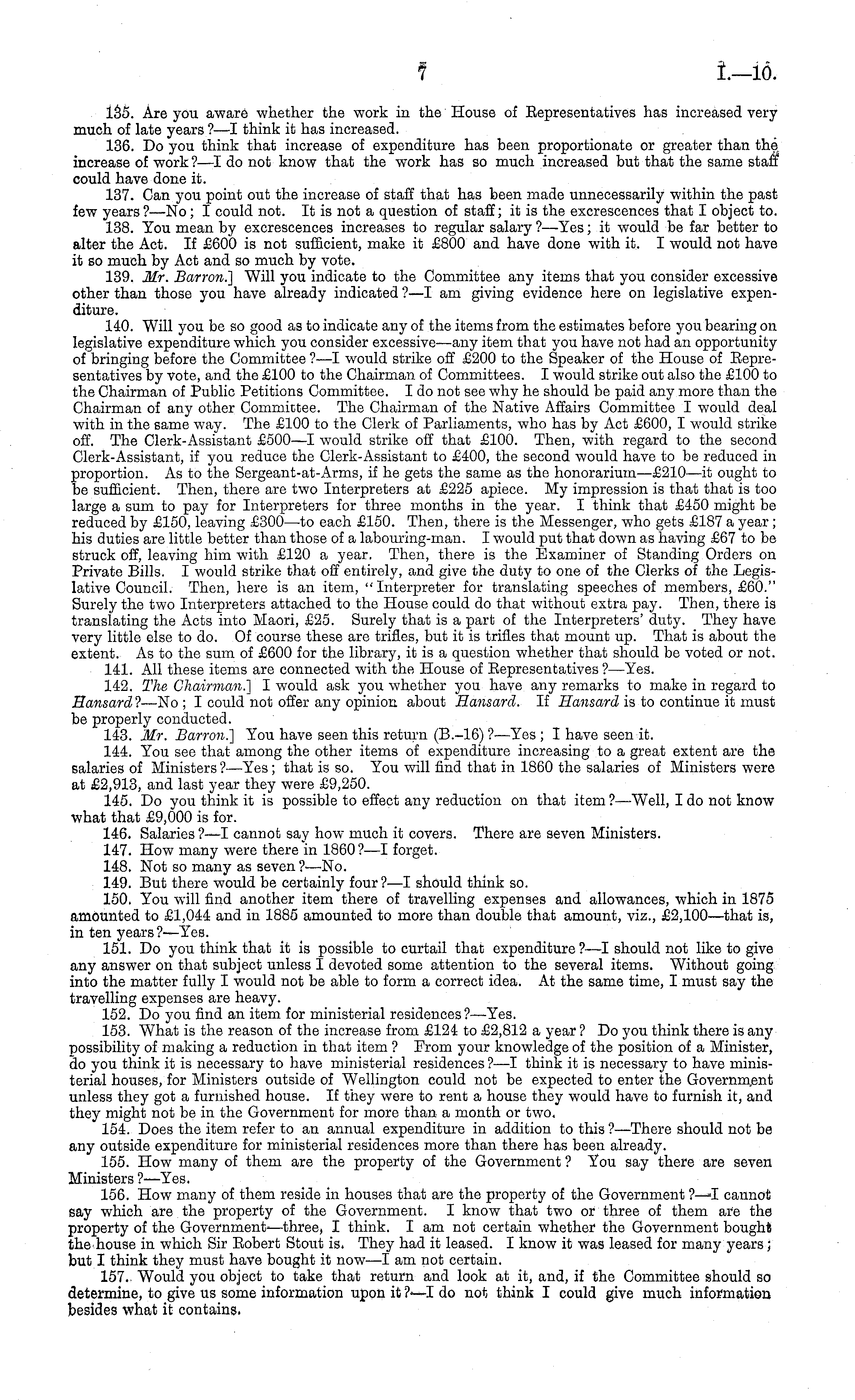135. Are you aware whether the work in the House of Eepresentatives has increased verymuch of late years ?—I think it has increased. 136. Do you think that increase of expenditure has been proportionate or greater than the increase of work ?—I do not know that the work has so much increased but that the same staff 1 could have done it. 137. Can you point out the increase of staff that has been made unnecessarily within the past few years?—No; I could not. It is not a question of staff; it is the excrescences that I object to. 138. You mean by excrescences increases to regular salary ?—Yes; it would be far better to alter the Act. If £600 is not sufficient, make it £800 and have done with it. I would not have it so much by Act and so much by vote. 139. Mr. Ban-on.] Will you indicate to the Committee any items that you consider excessive other than those you have already indicated ?—I am giving evidence here on legislative expenditure. 140. Will you be so good as to indicate any of the items from the estimates before you bearing on legislative expenditure which you consider excessive—any item that you have not had an opportunity of bringing before the Committee ?—I would strike off £200 to the Speaker of the House of Eepresentatives by vote, and the £100 to the Chairman of Committees. I would strike out also the £100 to the Chairman of Public Petitions Committee. Ido not see why he should be paid any more than the Chairman of any other Committee. The Chairman of the Native Affairs Committee I would deal with in the same way. The £100 to the Clerk of Parliaments, who has by Act £600, I would strike off. The Clerk-Assistant £500—I would strike off that £100. Then, with regard to the second Clerk-Assistant, if you reduce the Clerk-Assistant to £400, the second would have to be reduced in proportion. As to the Sergeant-at-Arms, if he gets the same as the honorarium—£2lo—it ought to be sufficient. Then, there are two Interpreters at £225 apiece. My impression is that that is too large a sum to pay for Interpreters for three months in the year. I think that £450 might be reduced by £150, leaving £300—to each £150. Then, there is the Messenger, who gets £187 a year; his duties are little better than those of a labouring-man. I would put that down as having £67 to be struck off, leaving him with £120 a year. Then, there is the Examiner of Standing Orders on Private Bills. I would strike that off entirely, and give the duty to one of the Clerks of the Legislative Council. Then, here is an item, "Interpreter for translating speeches of members, £60." Surely the two Interpreters attached to the House could do that without extra pay. Then, there is translating the Acts into Maori, £25. Surely that is a part of the Interpreters' duty. They have very little else to do. Of course these are trifles, but it is trifles that mount up. That is about the extent. As to the sum of £600 for the library, it is a question whether that should be voted or not. 141. All these items are connected with the House of Eepresentatives ? —Yes. 142. The Chairman.] I would ask you whether you have any remarks to make in regard to Hansard ?—No ; I could not offer any opinion about Hansard. If Hansard is to continue it must be properly conducted. 143. Mr. Barron.] You have seen this return (8.-16) ?—Yes ; I have seen it. 144. You see that among the other items of expenditure increasing to a great extent are the salaries of Ministers? —Yes; that is so. You will find that in 1860 the salaries of Ministers were at £2,913, and last year they were £9,250. 145. Do you think it is possible to effect any reduction on that item? —Well, Ido not know what that £9,000 is for. 146. Salaries ? —I cannot say how much it covers. There are seven Ministers. 147. How many were there in 1860?— I forget. 148. Not so many as seven ? —No. 149. But there would be certainly four ?—I should think so. 150. You will find another item there of travelling expenses and allowances, which in 1875 amounted to £1,044 and in 1885 amounted to more than double that amount, viz., £2,100 —that is, in ten years?— Yes. 151. Do you think that it is possible to curtail that expenditure?—l should not like to give any answer on that subject unless I devoted some attention to the several items. Without going into the matter fully I would not be able to form a correct idea. At the same time, I must say the travelling expenses are heavy. 152. Do you find an item for ministerial residences?— Yes. 153. What is the reason of the increase from £124 to £2,812 a year ? Do you think there is any possibility of making a reduction in that item ? From your knowledge of the position of a Minister, do you think it is necessary to have ministerial residences ?—I think it is necessary to have ministerial houses, for Ministers outside of Wellington could not be expected to enter the Government unless they got a furnished house. If they were to rent a house they would have to furnish it, and they might not be in the Government for more than a month or two. 154. Does the item refer to an annual expenditure in addition to this ?—There should not be any outside expenditure for ministerial residences more than there has been already. 155. How many of them are the property of the Government ? You say there are seven Ministers ?—Yes. 156. How many of them reside in houses that are the property of the Government ?—=l cannot say which are the property of the Government. I know that two or three of them are the property of the Government- —three, I think. I am not certain whether the Government bought the house in which Sir Eobert Stout is. They had it leased. I know it was leased for many years; but I think they must have bought it now —I am not certain. 157. Would you object to take that return and look at it, and, if the Committee should so determine, to give us some information upon it ?—--I do not think I c