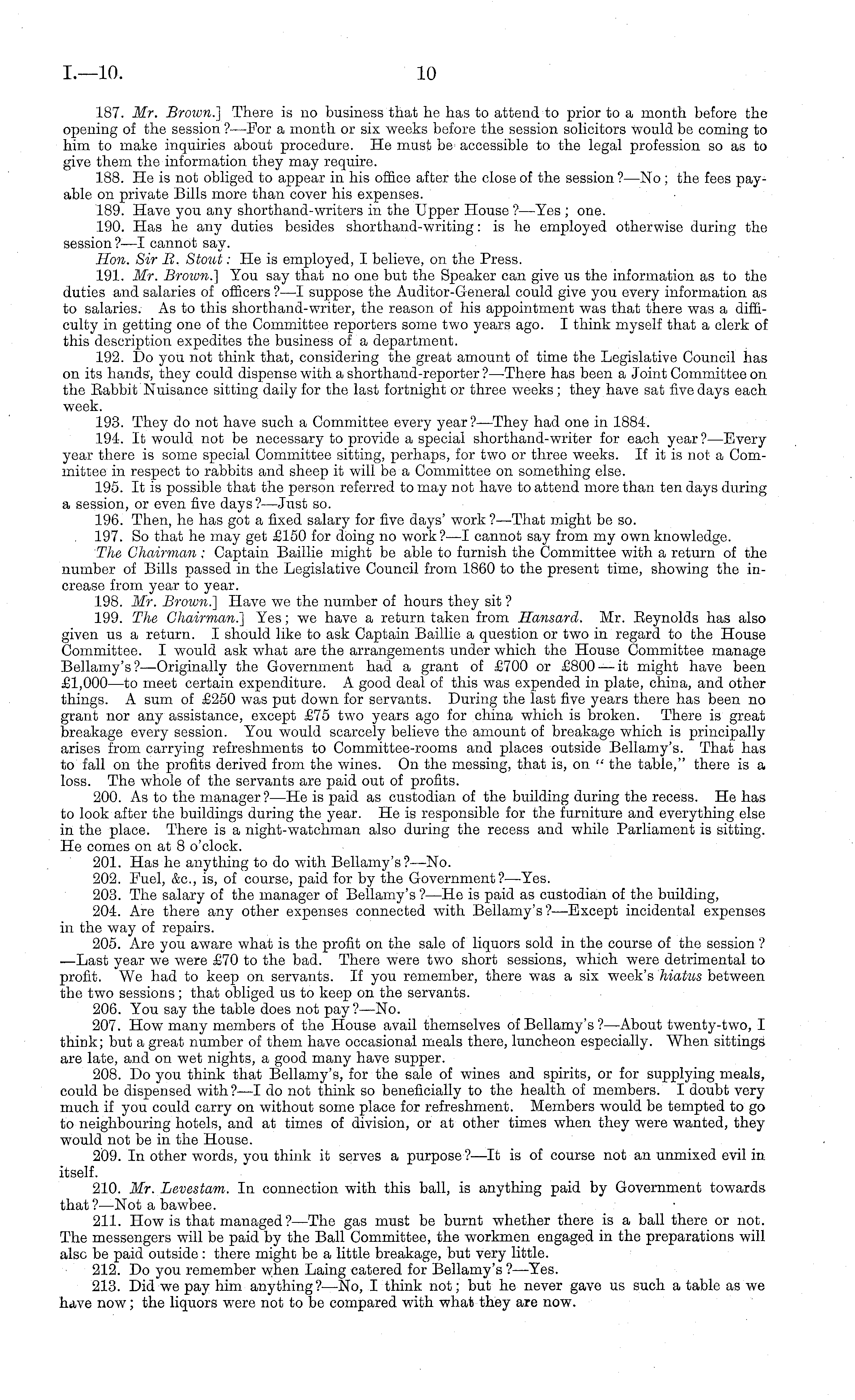 187. Mr. Brown.'] There is no business that he has to attend to prior to a month before the opening of the session ?—For a month or six weeks before the session solicitors would be coming to him to make inquiries about procedure. He must be accessible to the legal profession so as to give them the information they may require. 188. He is not obliged to appear in his office after the close of the session ?—No ; the fees payable on private Bills more than cover his expenses. 189. Have you any shorthand-writers in the Upper House ?—Yes ; one. 190. Has he any duties besides shorthand-writing: is he employed otherwise during the session?—l cannot say. Hon. Sir B. Stout: He is employed, I believe, on the Press. 191. Mr. Broivn.] You say that no one but the Speaker can give us the information as to the duties and salaries of officers ?—I suppose the Auditor-General could give you every information as to salaries. As to this shorthand-writer, the reason of his appointment was that there was a difficulty in getting one of the Committee reporters some two years ago. I think myself that a clerk of this description expedites the business of a department. 192. Do you not think that, considering the great amount of time the Legislative Council has on its hands, they could dispense with a shorthand-reporter ?—There has been a Joint Committee on the Babbit' Nuisance sitting daily for the last fortnight or three weeks; they have sat five days each week. 193. They do not have such a Committee every year?— They had one in 1884. 194. It would not be necessary to provide a special shorthand-writer for each year?— Every year there is some special Committee sitting, perhaps, for two or three weeks. If it is not a Committee in respect to rabbits and sheep it will be a Committee on something else. 195. It is possible that the person referred to may not have to attend more than ten days during a session, or even five days?— Just so. 196. Then, he has got a fixed salary for five days' work ?—That might be so. . 197. So that he may get £150 for doing no work? —I cannot say from my own knowledge. The Chairman ; Captain Baillie might be able to furnish the Committee with a return of the number of Bills passed in the Legislative Council from 1860 to the present time, showing the increase from year to year. 198. Mr. Brown.] Have we the number of hours they sit ? 199. The Chairman.] Yes; we have a return taken from Hansard. Mr. Beynolds has also given us a return. I should like to ask Captain Baillie a question or two in regard to bhe House Committee. I would ask what are the arrangements under which the House Committee manage Bellamy's? —Originally the Government had a grant of £700 or £800 —it might have been £1,000 —to meet certain expenditure. A good deal of this was expended in plate, china, and other things. A sum of £250 was put down for servants. During the last five years there has been no grant nor any assistance, except £75 two years ago for china which is broken. There is great breakage every session. You would scarcely believe the amount of breakage which is principally arises from carrying refreshments to Committee-rooms and places outside Bellamy's. That has to fall on the profits derived from the wines. On the messing, that is, on " the table," there is a loss. The whole of the servants are paid out of profits. 200. As to the manager?—He is paid as custodian of the building during the recess. He has to look after the buildings during the year. He is responsible for the furniture and everything else in the place. There is a night-watchman also during the recess and while Parliament is sitting. He comes on at 8 o'clock. 201. Has he anything to do with Bellamy's?— No. 202. Fuel, &c, is, of course, paid for by the Government?— Yes. 203. The salary of the manager of Bellamy's ?—He is paid as custodian of the building, 204. Are there any other expenses connected with Bellamy's ?—Except incidental expenses in the way of repairs. 205. Are you aware what is the profit on the sale of liquors sold in the course of the session ? —Last year we were £70 to the bad. There were two short sessions, which were detrimental to profit. We had to keep on servants. If you remember, there was a six week's hiatus between the two sessions; that obliged us to keep on the servants. 206. You say the table does not pay?— No. 207. How many members of the House avail themselves of Bellamy's?— About twenty-two, I think; but a great number of them have occasional meals there, luncheon especially. When sittings are late, and on wet nights, a good many have supper. 208. Do you think that Bellamy's, for the sale of wines and spirits, or for supplying meals, could be dispensed with ?—I do not think so beneficially to the health of members. I doubt very much if you could carry on without some place for refreshment. Members would be tempted to go to neighbouring hotels, and at times of division, or at other times when they were wanted, they would not be in the House. 209. In other words, you think it serves a purpose?—lt is of course not an unmixed evil in itself. 210. Mr. Levestam. In connection with this ball, is anything paid by Government towards that? —Not a bawbee. 211. How is that managed ?—The gas must be burnt whether there is a ball there or not. The messengers will be paid by the Ball Committee, the workmen engaged in the preparations will also be paid outside : there might be a little breakage, but very little. 212. Do you remember when Laing catered for Bellamy's ?—Yes. 213. Did we pay him anything?—No, I think not; but he never gave us such a table as we have now; the liquors were not to be compared with what they are now.