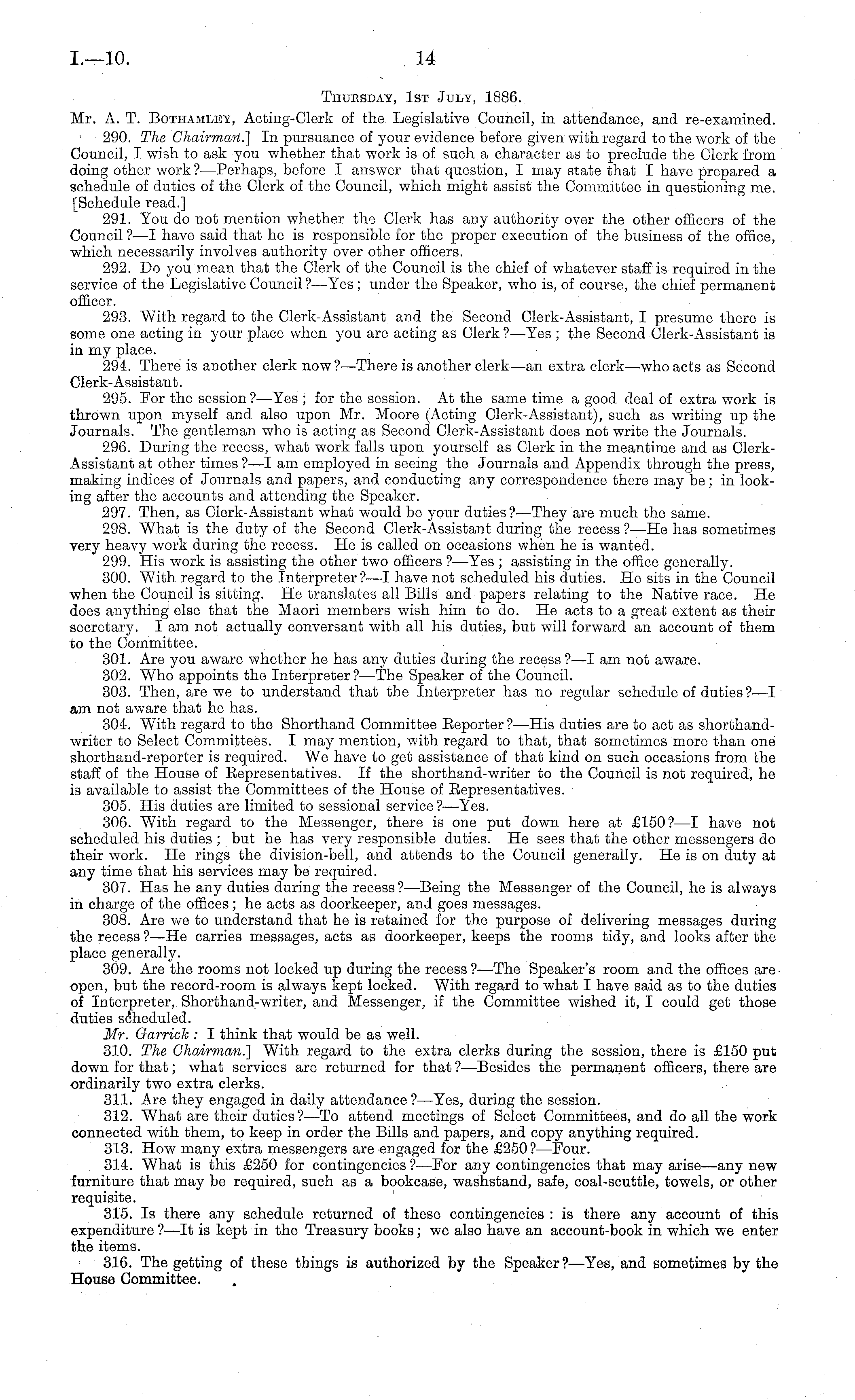 Thubsday, Ist July, 1886. Mr. A. T. Bothamley, Acting-Clerk of the Legislative Council, in attendance, and re-examined. 1 290. The Chairman.'] In pursuance of your evidence before given with regard to the work of the Council, I wish to ask you whether that work is of such a character as to preclude the Clerk from doing other work?— Perhaps, before I answer that question, I may state that I have prepared a schedule of duties of the Clerk of the Council, which might assist the Committee in questioning me. [Schedule read.] 291. You do not mention whether the Clerk has any authority over the other officers of the Council ? —I have said that he is responsible for the proper execution of the business of the office, which necessarily involves authority over other officers. 292. Do you mean that the Clerk of the Council is the chief of whatever staff is required in the service of the Legislative Council ?—Yes; under the Speaker, who is, of course, the chief permanent officer. 293. With regard to the Clerk-Assistant and the Second Clerk-Assistant, I presume there is some one acting in your place when you are acting as Clerk ?—Yes ; the Second Clerk-Assistant is in my place. 294. There is another clerk now?— There is another clerk—an extra clerk—who acts as Second Clerk-Assistant. 295. For the session? —Yes ; for the session. At the same time a good deal of extra work is thrown upon myself and also upon Mr. Moore (Acting Clerk-Assistant), such as writing up the Journals. The gentleman who is acting as Second Clerk-Assistant does not write the Journals. 296. During the recess, what work falls upon yourself as Clerk in the meantime and as ClerkAssistant at other times ?—I am employed in seeing the Journals and Appendix through the press, making indices of Journals and papers, and conducting any correspondence there may be; in looking after the accounts and attending the Speaker. 297. Then, as Clerk-Assistant what would be your duties?'—They are much the same. 298. What is the duty of the Second Clerk-Assistant during the recess ?—He has sometimes very heavy work during the recess. He is called on occasions when he is wanted. 299. His work is assisting the other two officers ?—Yes ; assisting in the office generally. 300. With regard to the Interpreter?—l have not scheduled his duties. He sits in the Council when the Council is sitting. He translates all Bills and papers relating to the Native race. He does anything else that the Maori members wish him to do. He acts to a great extent as their secretary. lam not actually conversant with all his duties, but will forward an account of them to the Committee. 301. Are you aware whether he has any duties during the recess ?—I am not aware. 302. Who appoints the Interpreter? —The Speaker of the Council. 303. Then, are we to understand that the Interpreter has no regular schedule of duties ?—I am not aware that he has. 304. With regard to the Shorthand Committee Eeporter ? —His duties are to act as shorthandwriter to Select Committees. I may mention, with regard to that, that sometimes more than one shorthand-reporter is required. We have to get assistance of that kind on such occasions from the staff of the House of Eepresentatives. If the shorthand-writer to the Council is not required, he i 3 available to assist the Committees of the House of Eepresentatives. 305. His duties are limited to sessional service?— Yes. 306. With regard to the Messenger, there is one put down here at £150?— I have not scheduled his duties ; but he has very responsible duties. He sees that the other messengers do their work. He rings the division-bell, and attends to the Council generally. He is on duty at any time that his services may be required. 307. Has he any duties during the recess? —Being the Messenger of the Council, he is always in charge of the offices; he acts as doorkeeper, and goes messages. 308. Are we to understand that he is retained for the purpose of delivering messages during the recess ?—He carries messages, acts as doorkeeper, keeps the rooms tidy, and looks after the place generally. 309. Are the rooms not locked up during the recess ?—The Speaker's room and the offices areopen, but the record-room is always kept locked. With regard to what I have said as to the duties of Interpreter, Shorthand-writer, and Messenger, if the Committee wished it, I could get those duties scheduled. Mr. Garrick : I think that would be as well. 310. The Chairman.] With regard to the extra clerks during the session, there is £150 put down for that; what services are returned for that ?—Besides the permanent officers, there are ordinarily two extra clerks. 311. Are they engaged in daily attendance?— Yes, during the session. 312. What are their duties?—To attend meetings of Select Committees, and do all the work connected with them, to keep in order the Bills and papers, and copy anything required. 313. How many extra messengers are engaged for the £250? —Four. 314. What is this £250 for contingencies?— For any contingencies that may arise—any new furniture that may be required, such as a bookcase, washstand, safe, coal-scuttle, towels, or other requisite. 315. Is there any schedule returned of these contingencies : is there any account of this expenditure ?—lt is kept in the Treasury books; we also have an account-book in which we enter the items. 316. The getting of these things is authorized by the Speaker ? —Yes, and sometimes by the House Committee.
