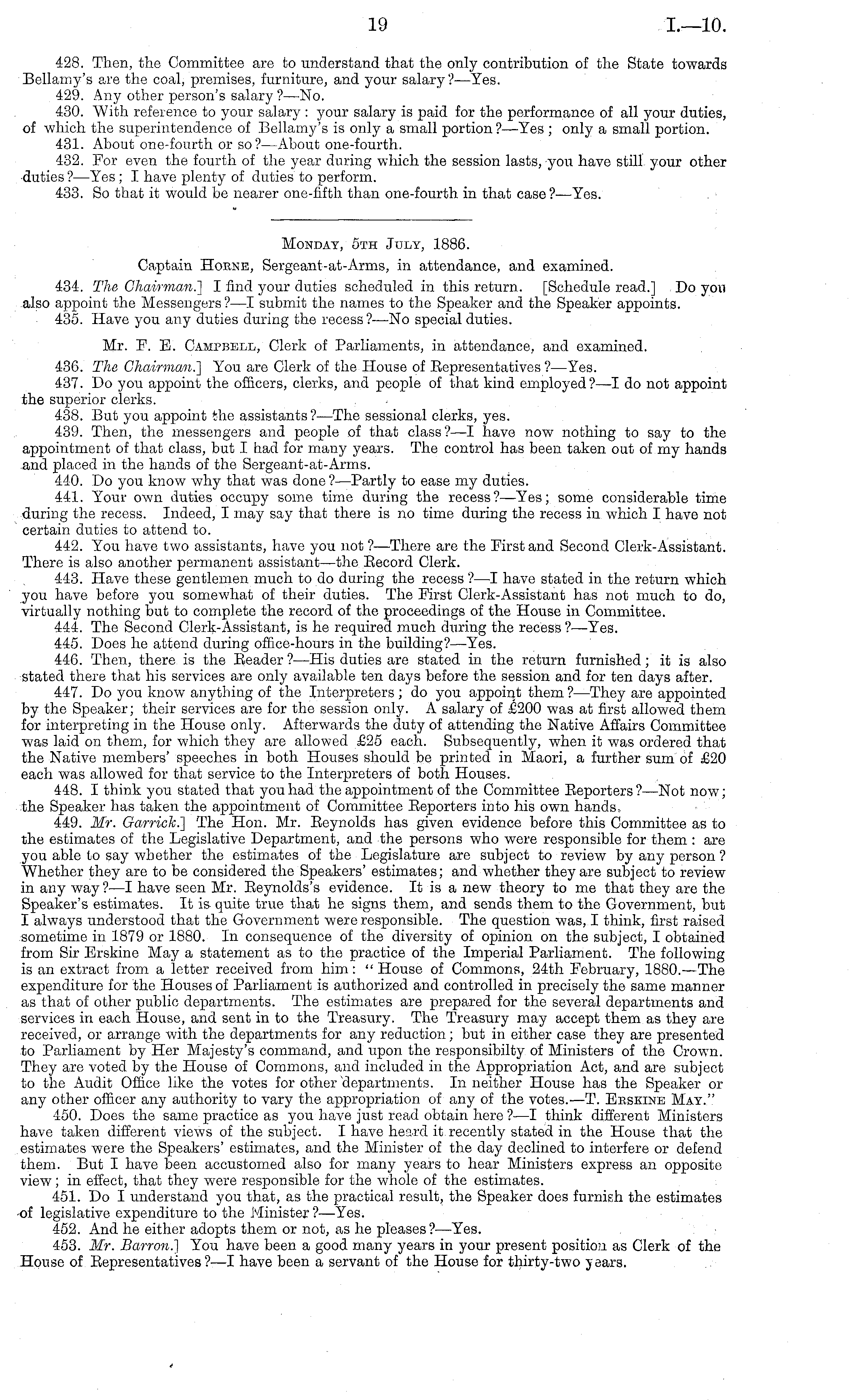Monday, sth July, 1886. Captain House, Sergeant-at-Arms, in attendance, and examined. 434. The Chairman.] I find your duties scheduled in this return. [Schedule read.] Do yon also appoint the Messengers ?—I submit the names to the Speaker and the Speaker appoints. 435. Have you any duties during the recess?—No special duties. Mr. F. E. Campbell, Clerk of Parliaments, in attendance, and examined. 436. The Chairman.] You are Clerk of the House of Representatives ?—Yes. 437. Do you appoint the officers, clerks, and people of that kind employed?—l do not appoint the superior clerks. 438. But you appoint the assistants ?—The sessional clerks, yes. 439. Then, the messengers and people of that class? —I have now nothing to say to the appointment of that class, but I had for many years. The control has been taken out of my hands and placed in the hands of the Sergeant-at-Arms. 440. Do you know why that was done?— Partly to ease my duties. 441. Your own duties occupy some time during the recess? —Yes; some considerable time during the recess. Indeed, I may say that there is no time during the recess in which I have not certain duties to attend to. 442. You have two assistants, have you not ?—There are the First and Second Clerk-Assistant. There is also another permanent assistant—the Eecord Clerk. 443. Have those gentlemen much to do during the recess ? —I have stated in the return which you have before you somewhat of their duties. The First Clerk-Assistant has not much to do, virtually nothing but to complete the record of the proceedings of the House in Committee. 444. The Second Clerk-Assistant, is he required much during the recess ?—Yes. 445. Does he attend during office-hours in the building? —Yes. 446. Then, there is the Eeader ?—His duties are stated in the return furnished; it is also stated there that his services are only available ten days before the session and for ten days after. 447. Do you know anything of the Interpreters ; do you appoint them ?—They are appointed by the Speaker; their services are for the session only. A salary of £200 was at first allowed them for interpreting in the House only. Afterwards the duty of attending the Native Affairs Committee was laid on them, for which they are allowed £25 each. Subsequently, when it was ordered that the Native members' speeches in both Houses should be printed in Maori, a further sum of £20 each was allowed for that service to the Interpreters of both Houses. 448. I think you stated that you had the appointment of the Committee Beporters?—Not now; the Speaker has taken the appointment of Committee Eeporters into his own hands, 449. Mr. Garrick.] The Hon. Mr. Reynolds has given evidence before this Committee as to the estimates of the Legislative Department, and the persons who were responsible for them : are you able to say whether the estimates of the Legislature are subject to review by any person ? Whether they are to be considered the Speakers' estimates; and whether they are subject to review in any way?—l have seen Mr. Eeynolds's evidence. It is a new theory to me that they are the Speaker's estimates. It is quite true that he signs them, and sends them to the Government, but I always understood that the Government were responsible. The question was, I think, first raised sometime in 1879 or 1880. In consequence of the diversity of opinion on the subject, I obtained from Sir Erskine May a statement as to the practice of the Imperial Parliament. The following is an extract from a letter received from him: "House of Commons, 24th February, 1880.—The expenditure for the Houses of Parliament is authorized and controlled in precisely the same manner as that of other public departments. The estimates are prepared for the several departments and services in each House, and sent in to the Treasury. The Treasury may accept them as they are received, or arrange with the departments for any reduction ; but in either case they are presented to Parliament by Her Majesty's command, and upon the responsibilty of Ministers of the Crown. They are voted by the House of Commons, and included in the Appropriation Act, and are subject to the Audit Office like the votes for other 'departments. In neither House has the Speaker or any other officer any authority to vary the appropriation of any of the votes.' —T. Eeskinb May." 450. Does the same practice as you have just read obtain here ?—I think different Ministers have taken different views of the subject. I have heard it recently stated in the House that the estimates were the Speakers' estimates, and the Minister of the day declined to interfere or defend them. But I have been accustomed also for many years to hear Ministers express an opposite view; in effect, that they were responsible for the whole of the estimates. 451. Do I understand you that, as the practical result, the Speaker does furnish the estimates of legislative expenditure to the Minister ?—Yes. 452. And he either adopts them or not, as he pleases? —Yes. 453. Mr. Barron.) You have been a good many years in your present position as Clerk of the House of Eepresentatives ?—I have been a servant of the House for thirty-two years.