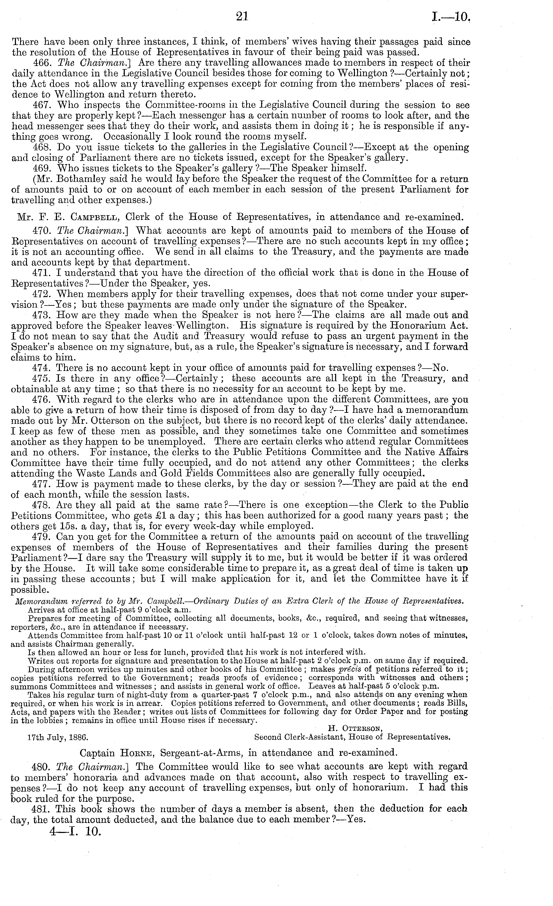 There have been only three instances, I think, of members' wives having their passages paid since the resolution of the House of Eepresentatives in favour of their being paid was passed. 466. The Chairman.] Are there any travelling allowances made to members in respect of their daily attendance in the Legislative Council besides those for coming to Wellington ? —Certainly not; the Act does not allow any travelling expenses except for coming from the members' places of residence to Wellington and return thereto. 467. Who inspects the Committee-rooms in the Legislative Council during the session to see that they are properly kept ? —Each messenger has a certain number of rooms to look after, and the head messenger sees that they do their work, and assists them in doing it; he is responsible if anything goes wrong. Occasionally I look round the rooms myself. 468. Do you issue tickets to the galleries in the Legislative Council?— Except at the opening and closing of Parliament there are no tickets issued, except for the Speaker's gallery. 469. Who issues tickets to the Speaker's gallery ?—The Speaker himself. (Mr. Bothamley said he would lay before the Speaker the request of the Committee for a return of amounts paid to or on account of each member in each session of the present Parliament for travelling and other expenses.) Mr. F. E. Campbell, Clerk of the House of Eepresentatives, in attendance and re-examined. 470. The Chairman.] What accounts are kept of amounts paid to members of the House of Eepresentatives on account of travelling expenses ?—There are no such accounts kept in my office ; it is not an accounting office. We send in all claims to the Treasury, and the payments are made and accounts kept by that department. 471. I understand that you have the direction of the official work that is done in the House of Eepresentatives ?—Under the Speaker, yes. 472. When members apply for their travelling expenses, does that not come under your supervision ?—Yes; but these payments are made only under the signature of the Speaker. 473. How are they made when the Speaker is not here ?—The claims are all made out and approved before the Speaker leaves-Wellington. His signature is required by the Honorarium Act. I do not mean to say that the Audit and Treasury would refuse to pass an urgent payment in the Speaker's absence on my signature, but, as a rule, the Speaker's signature is necessary, and I forward claims to him. 474. There is no account kept in your office of amounts paid for travelling expenses ? —No. 475. Is there in any office?— Certainly; these accounts are all kept in the Treasury, and obtainable at any time ; so that there is no necessity for an account to be kept by me. 476. With regard to the clerks who are in attendance upon the different Committees, are you able to give a return of how their time is disposed of from day to day ?—I have had a memorandum made out by Mr. Otterson on the subject, but there is no record kept of the clerks' daily attendance. I keep as few of these men as possible, and they sometimes take one Committee and sometimes another as they happen to be unemployed. There are certain clerks who attend regular Committees and no others. For instance, the clerks to the Public Petitions Committee and the Native Affairs Committee have their time fully occupied, and do not attend any other Committees; the clerks attending the Waste Lands and Gold Fields Committees also are generally fully occupied. 477. How is payment made to these clerks, by the day or session ?—They are paid at the end of each month, while the session lasts. 478. Are they all paid at the same rate ? —There is one exception—the Clerk to the Public Petitions Committee, who gets £1 a day; this has been authorized for a good many years past; the others get 15s. a day, that is, for every week-day while employed. 479. Can you get for the Committee a return of the amounts paid on account of the travelling expenses of members of the House of Eepresentatives and their families during the present Parliament? —I dare say the Treasury will supply it to me, but it would be better if it was ordered by the House. It will take some considerable time to prepare it, as a great deal of time is taken up in passing these accounts; but I will make application for it, and let the Committee have it if possible. Memorandum referred to by Mr. Campbell. — Ordinary Duties of an Extra Clerk of the House of Representatives. Arrives at office at half-past 9 o'clock a.m. Prepares for meeting of Committee, collecting all documents, books, &c, required, and seeing that witnesses, reporters, &c, are in attendance if necessary. Attends Committee from half-past 10 or 11 o'clock until half-past 12 or 1 o'clock, takes down notes of minutes, and assists Chairman generally. Is then allowed an hour or less for lunch, provided that his work is not interfered with. Writes out reports for signature and presentation to the House at half-past 2 o'clock p.m. on same day if required. During afternoon writes up minutes and other books of his Committee ; makes precis of petitions referred to it; copies petitions referred to the Government; reads proofs of evidence ; corresponds with witnesses and others; summons Committees and witnesses ; and assists in general work of office. Leaves at half-past 5 o'clock p.m. Takes his regular turn of night-duty from a quarter-past 7 o'clock p.m., and also attends on any evening when required, or when his work is in arrear. Copies petitions referred to Government, and other documents ; reads Bills, Acts, and papers with the Reader ; writes out lists of Committees for following day for Order Paper and for posting in the lobbies ; remains in office until House rises if necessary. H. Ottebson, 17th July, 1886. Second Clerk-Assistant, House of Eepresentatives. Captain Hokne, Sergeant-at-Arms, in attendance and re-examined. 480. The Chairman.] The Committee would like to see what ac