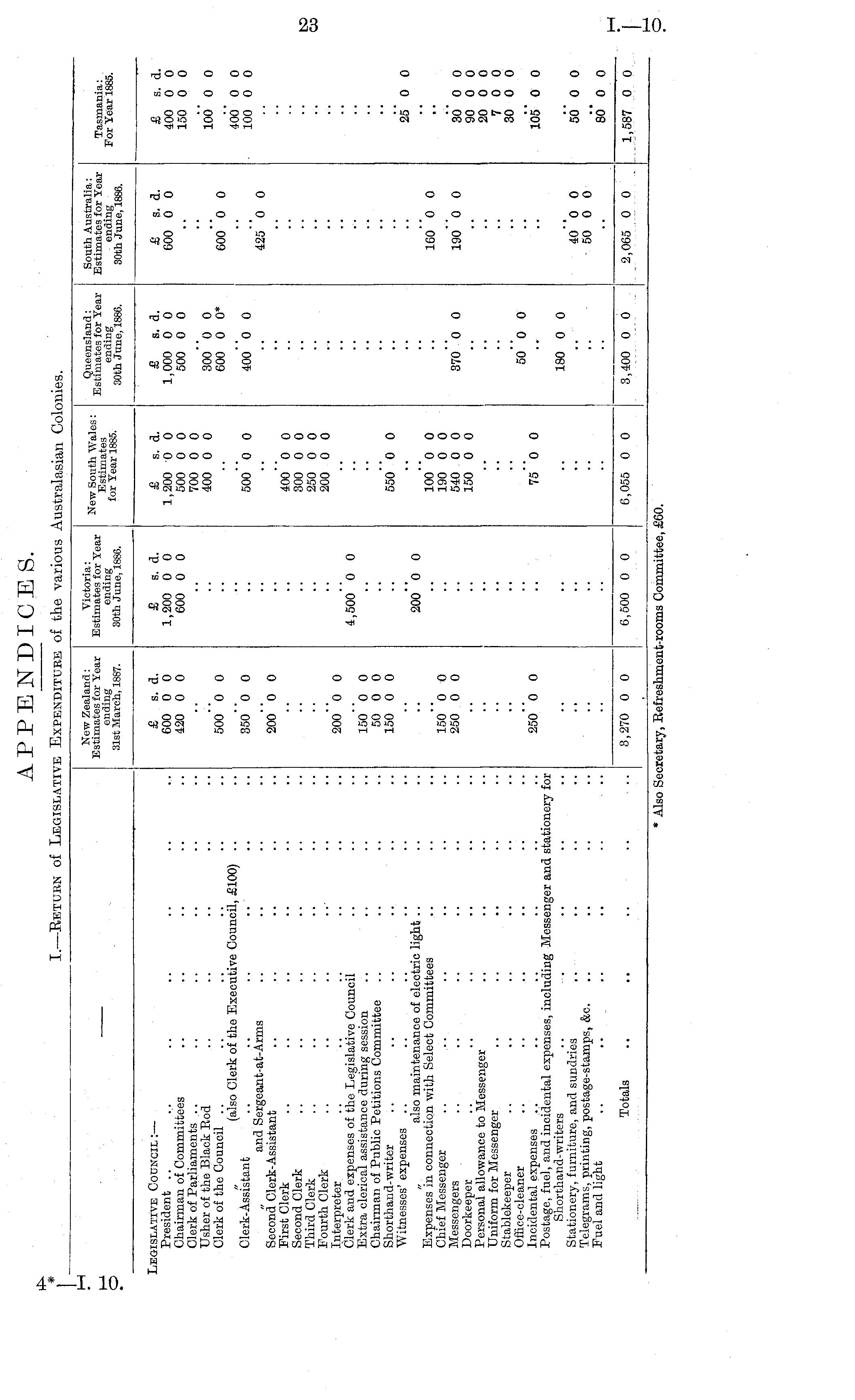 New Zealand: Estimates for Year ending 31st March, 1887. Victoria: Estimates for Year ending 30th June, 1886. New South Wales: Estimates for Year 1885. Queensland: Estimates for Year ending 30th June, 1886. South Australia: Estimates for Year ending 30th June, 1886. Tasmania: . For Year 1885. Legislative Coukcil: — President Chairman of Committees Clerk of Parliaments Usher of the Black Rod Clerk of the Council .. „ (also Clerk of the Executive Council, £100) Clerk-Assistant .. .. .. .. ■ „ and Sergeant-at-Arms Second Clerk-Assistant First Clerk Second Clerk Third Clerk Fourth Clerk Interpreter Clerk and expenses of the Legislative Council Extra clerical assistance auring session .. Chairman of Public Petitions Committee Shorthana-writer .. .. .. .. Witnesses' expenses .. „ also maintenance of electric light Expenses in connection with Select Committees Chief Messenger Messengers Doorkeeper Personal allowance to Messenger Uniform for Messenger Stablekeeper Office-cleaner Incidental expenses .. Postage, fuel, and incidental expenses, including Messenger and stationery for Shorthand-writers Stationery, furniture, and sundries Telegrams, printing, postage-stamps, h&c. Fuel and light .. .. .. .. .. ... £ s. a. 600 0 0 420 0 0 50o"o 0 35o"o 0 20o"o 0 200*0 0 150 0 0 50 0 0 150 0 0 £ s. d. 1,200 0 0 600 0 0 4,500"0 0 £ s. d. 1,200 0 0 500 0 0 700 0 0 400 0 0 50o"'o 0 400 0 0 300 0 0 250 0 0 200 0 0 550 0 0 £ s. a. 1,000 0 0 500 0 0 300"o 0 600 0 0* 400" 0 0 £ s. d. 600 0 0 600*0 0 425 - 0 0 £ s. a. 400 0 0 150 0 0 100* 0 0 400* 0 0 100 0 0 200"0 0 25 0 0 150"o 0 250 0 0 100 0 0 190 0 0 540 0 0 150 0 0 37o"o 0 16o"o 0 190' 0 0 30 0 0 90 0 0 20 0 0 7 0 0 30 0 0 I 250*0 0 75"o 0 50"o 0 105* 0 0 180 0 0 40"0 0 50 0 0 50* 0 0 80° 0 0 Totals 3,270 0 0 6,500 0 0 6,055 0 0 3,400 0 0 2,065 0 0 1,587 0 0 * Also Secretary, Refreshment-rooms Committee, £60.