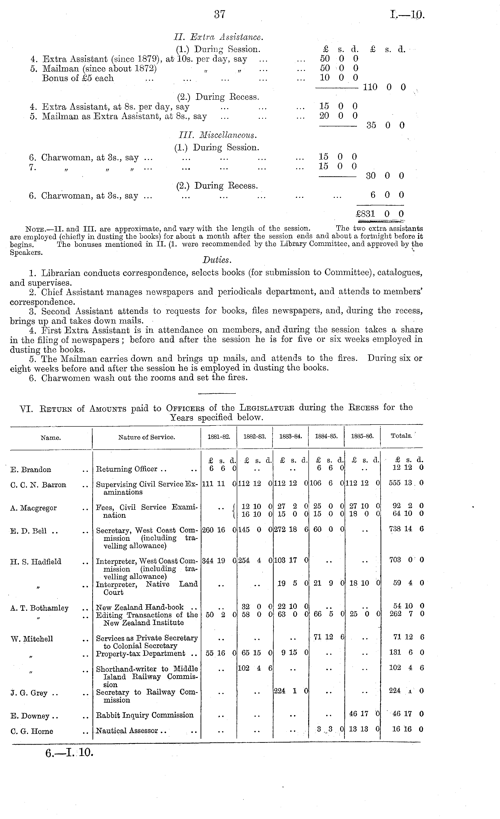 11. Extra Assistance. (1.) During Session. £ s. d. £ s. d. 4. Extra Assistant (since 1879), at 10s. per day, say ... ... 50 0 0 5. Mailman (since about 1872) „ „ ... ... 50 0 0 Bonus of £5 each ... ... ... ... ... 10 0 0 110 0 0 (2.) During Eecess. 4. Extra Assistant, at Bs. per day, say ... ... ... 15 0 0 5. Mailman as Extra Assistant, at Bs., say ... ... ... 20 0 0 35 0 0 111. Miscellaneous. (1.) During Session. 6. Charwoman, at 35., say ... ... ... ... ... 15 0 0 7. „ 15 0 0 30 0 0 (2.) During Eecess. 6. Charwoman, at 35., say ... ... ... ... ... ... 600 £831__0_ 0 Note.—ll. and 111. are approximate, and vary with the length of the session. The two extra assistants are employed (chiefly in dusting the books) for about a month after the session ends and about a fortnight before it begins. The bonuses mentioned in 11. (1. were recommended by the Library Committee, and approved by the Speakers. Duties. 1. Librarian conducts correspondence, selects books (for submission to Committee), catalogues, and supervises. 2. Chief Assistant manages newspapers and periodicals department, and attends to members' correspondence. 3. Second Assistant attends to requests for books, files newspapers, and, during the recess, brings up and takes down mails. 4. First Extra Assistant is in attendance on members, and during the session takes a share in the filing of newspapers ; before and after the session he is for five or six weeks employed in dusting the books. 5. The Mailman carries down and brings up mails, and attends to the fires. During six or eight weeks before and after the session he is employed in dusting the books. 6. Charwomen wash out the rooms and set the fires.
