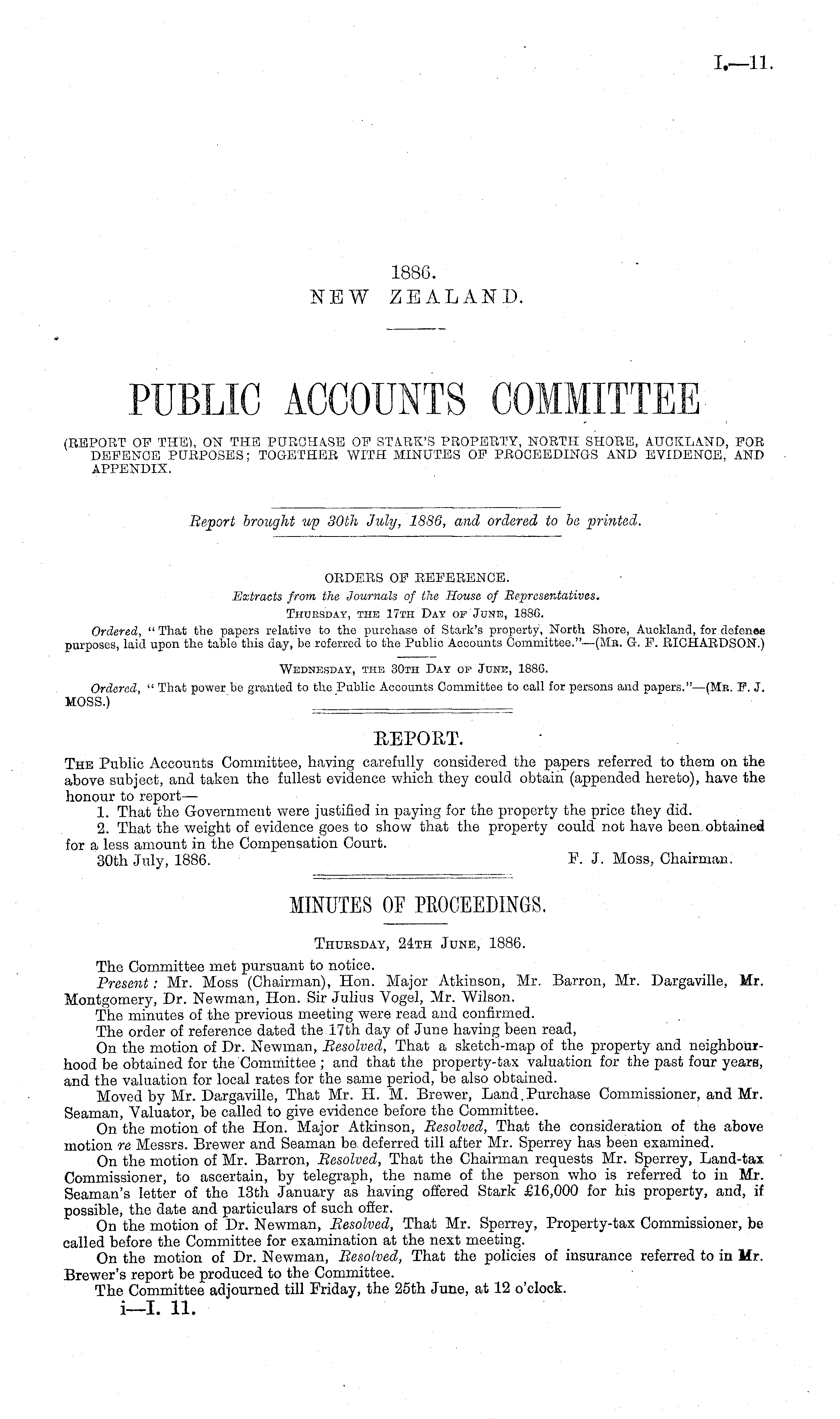 PUBLIC ACCOUNTS COMMITTEE (REPORT OF THE), ON THE PURCHASE OF STARK'S PROPERTY, NORTH SHORE, AUCKLAND, FOR DEFENCE PURPOSES; TOGETHER WITH MINUTES OF PROCEEDINGS AND EVIDENCE, AND APPENDIX.