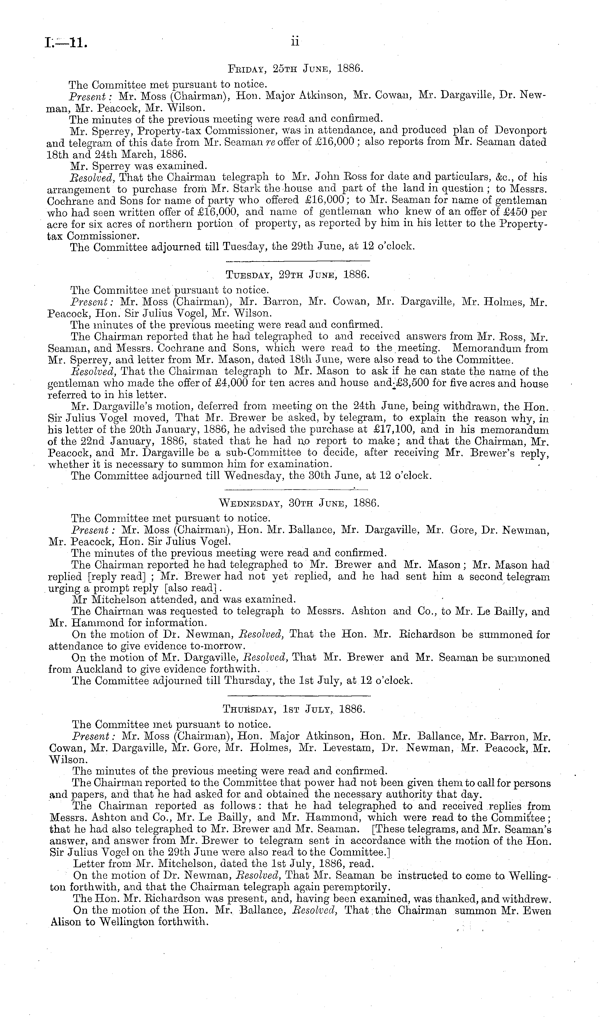 Fbiday, 25th June, 1886. Tho Committee met pursuant to notice. Present: Mr. Moss (Chairman), Hon. Major Atkinson, Mr. Cowan, Mr. Dargaville, Dr. Newman, Mr. Peacock, Mr. Wilson. The minutes of the previous meeting were read and confirmed. Mr. Sperrey, Property-tax Commissioner, was in attendance, and produced plan of Devonport and telegram of this date from Mr. Seaman re offer of £16,000 ; also reports from Mr. Seaman dated 18th and 24th March, 1886. Mr. Sperrey was examined. Besolved, That the Chairman telegraph to Mr. John Eoss for date and particulars, &c, of his arrangement to purchase from Mr. Stark the house and part of the land in question ; to Messrs. Cochrane and Sons for name of party who offered £16,000; to Mr. Seaman for name of gentleman who had seen written offer of £16,000, and name of gentleman who knew of an offer of £450 per acre for six acres of northern portion of property, as reported by him in his letter to the Propertytax Commissioner. The Committee adjourned till Tuesday, the 29th June, at 12 o'clock.