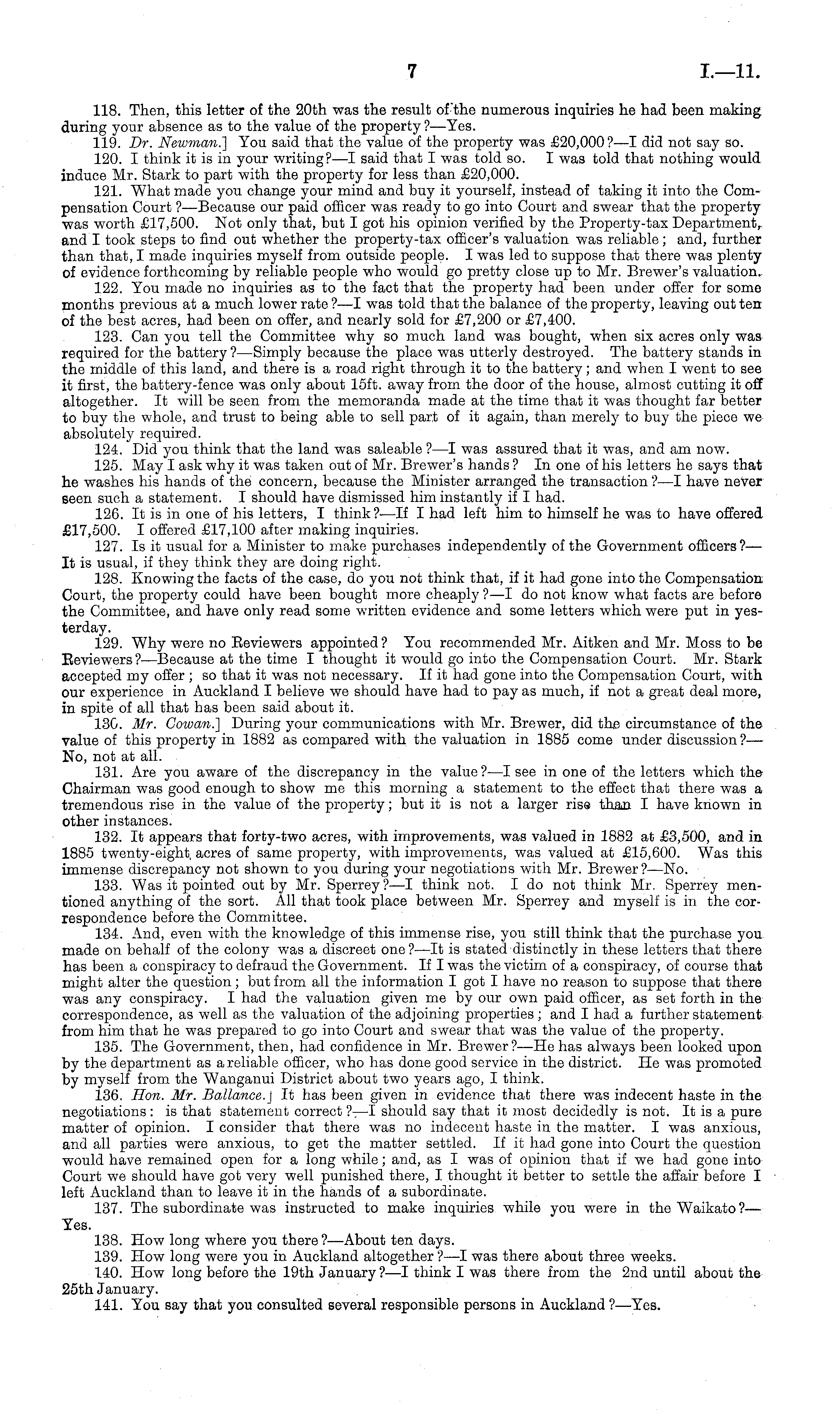 118. Then, this letter of the 20th was the result of the numerous inquiries he had been making during your absence as to the value of the property ? —Yes. 119. Dr. Newman.] You said that the value of the property was £20,000? —I did not say so. 120. I think it is in your writing?—l said that I was told so. I was told that nothing would induce Mr. Stark to part with the property for less than £20,000. 121. "What made you change your mind and buy it yourself, instead of taking it into the Compensation Court ? —Because our paid officer was ready to go into Court and swear that the property was worth £17,500. Not only that, but I got his opinion verified by the Property-tax Department, and I took steps to find out whether the property-tax officer's valuation was reliable; and, further than that, I made inquiries myself from outside people. I was led to suppose that there was plenty of evidence forthcoming by reliable people who would go pretty close up to Mr. Brewer's valuation. 122. You made no inquiries as to the fact that the property had been under offer for some months previous at a much lower rate ? —I was told that the balance of the property, leaving out ten of the best acres, had been on offer, and nearly sold for £7,200 or £7,400. 123. Can you tell the Committee why so much land was bought, when six acres only was required for the battery ?—Simply because the place was utterly destroyed. The battery stands in the middle of this land, and there is a road right through it to the battery; and when I went to see it first, the battery-fence was only about 15ft. away from the door of the house, almost cutting it off altogether. It will be seen from the memoranda made at the time that it was thought far better to buy the whole, and trust to being able to sell part of it again, than merely to buy the piece we absolutely required. 124. Did you think that the land was saleable ? —I was assured that it was, and am now. 125. May I ask why it was taken out of Mr. Brewer's hands ? In one of his letters he says that he washes his hands of the concern, because the Minister arranged the transaction ?—I have never Been such a statement. I should have dismissed him instantly if I had. 126. It is in one of his letters, I think?—lf I had left him to himself he was to have offered £17,500. I offered £17,100 after making inquiries. 127. Is it usual for a Minister to make purchases independently of the Government officers?— It is usual, if they think they are doing right. 128. Knowing the facts of the case, do you not think that, if it had gone into the Compensation Court, the property could have been bought more cheaply ? —I do not know what facts are before the Committee, and have only read some written evidence and some letters which were put in yesterday. 129. Why were no Reviewers appointed ? You recommended Mr. Aitken and Mr. Moss to be Eeviewers?—Because at the time I thought it would go into the Compensation Court. Mr. Stark accepted my offer ; so that it was not necessary. If it had gone into the Compensation Court, with our experience in Auckland I believe we should have had to pay as much, if not a great deal more, in spite of all that has been said about it. 130. Mr. Cowan.'] During your communications with Mr. Brewer, did the circumstance of the value of this property in 1882 as compared with the valuation in 1885 come under discussion ?— No, not at all. 131. Are you aware of the discrepancy in the value?—l see in one of the letters which the Chairman was good enough to show me this morning a statement to the effect that there was a tremendous rise in the value of the property; but it is not a larger rise than I have known in other instances. 132. It appears that forty-two acres, with improvements, was valued in 1882 at £3,500, and in 1885 twenty-eight acres of same property, with improvements, was valued at £15,600. Was this immense discrepancy not shown to you during your negotiations with Mr. Brewer?— No. 133. Was it pointed out by Mr. Sperrey?—l think not. I do not think Mr. Sperrey mentioned anything of the sort. All that took place between Mr. Sperrey and myself is in the correspondence before the Committee. 134. And, even with the knowledge of this immense rise, you still think that the purchase you made on behalf of the colony was a discreet one? —It is stated distinctly in these letters that there has been a conspiracy to defraud the Government. If I was the victim of a conspiracy, of course that might alter the question; but from all the information I got I have no reason to suppose that there was any conspiracy. I had the valuation given me by our own paid officer, as set forth in the correspondence, as well as the valuation of the adjoining properties; and I had a further statement from him that he was prepared to go into Court and swear that was the value of the property. 135. The Government, then, had confidence in Mr. Brewer?—He has always been looked upon by the department as a reliable officer, who has done good service in the district. He was promoted by myself from the Wanganui District about two years ago, I think. 136. Hon. Mr. Ballance.] It has been given in evidence that there was indecent haste in the negotiations :is that statement correct ?- —I should say that it most decidedly is not. It is a pure matter of opinion. I consider that there was no indecent haste in the matter. I was anxious, and all parties were anxious, to get the matter settled. If it had gone into Court the question would have remained open for a long while; and, as I was of opinion that if we had gone into Court we should have got very well punished there, I thought it better to settle the affair before I left Auckland than to leave it in the hands of a subordinate. 137. The subordinate was instructed to make inquiries while you were in the Waikato?— Yes. 138. How long where you there ?—About ten days. 139. How long were you in Auckland altogether 