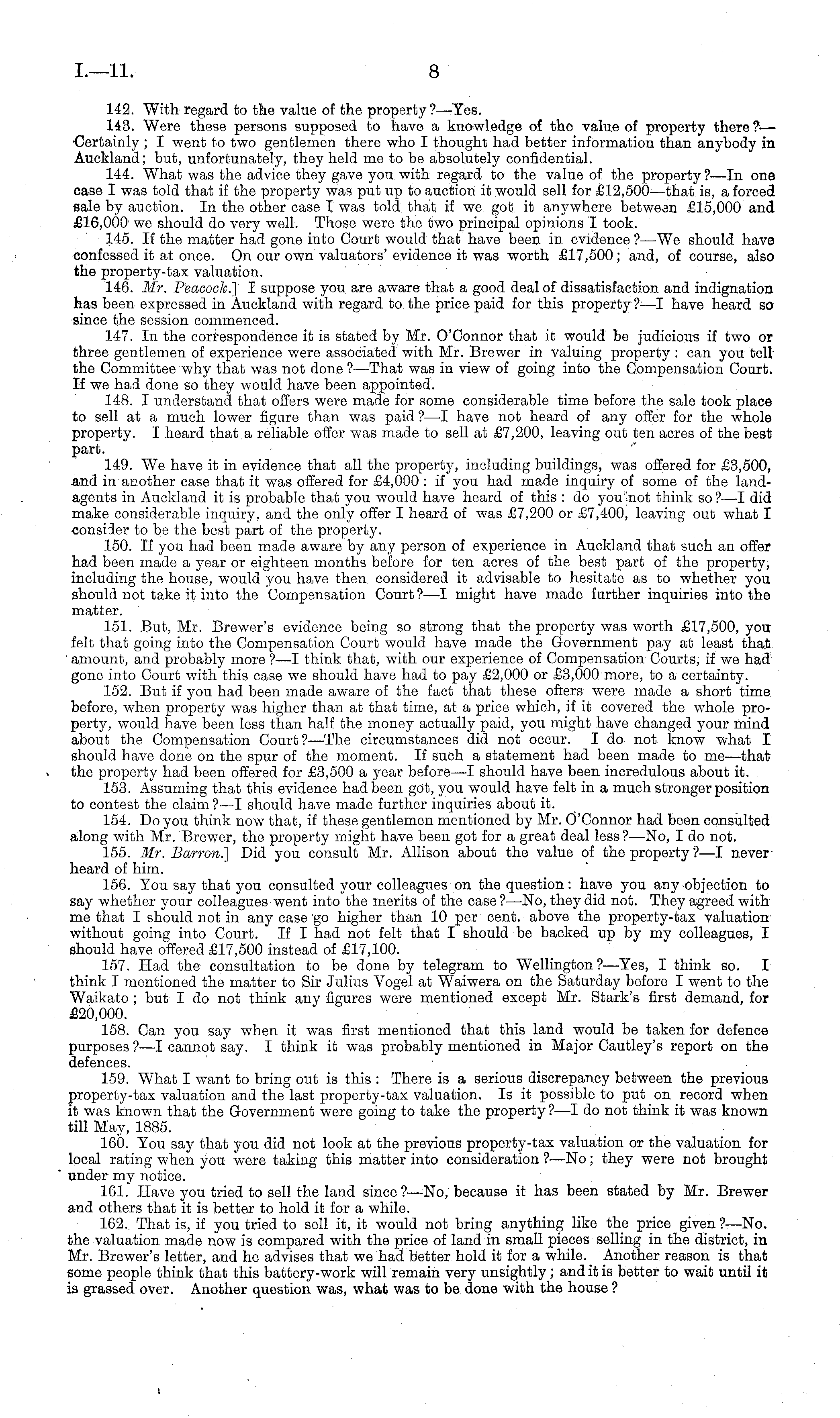 142. With regard to the value of the property ?—Yes. 143. Were these persons supposed to have a knowledge of the value of property there?— Certainly ; I went to two gentlemen there who I thought had better information than anybody in Auckland; but, unfortunately, they held me to be absolutely confidential. 144. What was the advice they gave you with regard to the value of the property ?—ln one case I was told that if the property was put up to auction it would sell for £12,500 —that is, a forced sale by auction. In the other case I was told that if we got it anywhere betwean £15,000 and £16,000 we should do very well. Those were the two principal opinions I took. 145. If the matter had gone into Court would that have been in evidence ? —We should have confessed it at once. On our own valuators'evidence it was worth £17,500; and, of course, also the property-tax valuation. 146. Mr. Peacock.} I suppose you are aware that a good deal of dissatisfaction and indignation has been expressed in Auckland with regard to the price paid for this property ?—I have heard so since the session commenced. 147. In the correspondence it is stated by Mr. O'Connor that it would be judicious if two or three gentlemen of experience were associated with Mr. Brewer in valuing property : can you tell the Committee why that was not done ?—That was in view of going into the Compensation Court. If we had done so they would have been appointed. 148. I understand that offers were made for some considerable time before the sale took place to sell at a much lower figure than was paid ?—I have not heard of any offer for the whole property. I heard that a reliable offer was made to sell at £7,200, leaving out ten acres of the best part. 149. We have it in evidence that all the property, including buildings, was offered for £3,500, and in another case that it was offered for £4,000 : if you had made inquiry of some of the landagents in Auckland it is probable that you would have heard of this :do you '.not think so ?—-I did make considerable inquiry, and the only offer I heard of was £7,200 or £7,400, leaving out what I consider to be the best part of the property. 150. If you had been made aware by any person of experience in Auckland that such an offer had been made a year or eighteen months before for ten acres of the best part of the property, including the house, would you have then considered it advisable to hesitate as to whether you should not take it into the Compensation Court?—l might have made further inquiries into the matter. 151. But, Mr. Brewer's evidence being so strong that the property was worth £17,500, you felt that going into the Compensation Court would have made the Government pay at least that amount, and probably more ?—I think that, with our experience of Compensation Courts, if we had gone into Court with this case we should have had to pay £2,000 or £3,000 more, to a certainty. 152. But if you had been made aware of the fact that these ofters were made a short time before, when property was higher than at that time, at a price which, if it covered the whole property, would have been less than half the money actually paid, you might have changed your mind about the Compensation Court?— The circumstances did not occur. Ido not know what I should have done on the spur of the moment. If such a statement had been made to me—that the property had been offered for £3,500 a year before—l should have been incredulous about it. 153. Assuming that this evidence had been got, you would have felt in a much stronger position to contest the claim ? —I should have made further inquiries about it. 154. Do you think now that, if these gentlemen mentioned by Mr. O'Connor had been consulted along with Mr. Brewer, the property might have been got for a great deal less?—No, I do not. 155. Mr. Barron.] Did you consult Mr. Allison about the value of the property ?—I never heard of him. 156. You say that you consulted your colleagues on the question: have you any objection to say whether your colleagues went into the merits of the case ? —No, they did not. They agreed with me that I should not in any case go higher than 10 per cent, above the property-tax valuation without going into Court. If I had not felt that I should be backed up by my colleagues, I should have offered £17,500 instead of £17,100. 157. Had the consultation to be done by telegram to Wellington?— Yes, I think so. I think I mentioned the matter to Sir Julius Vogel at Waiwera on the Saturday before I went to the Waikato; but I do not think any figures were mentioned except Mr. Stark's first demand, for £20,000. 158. Can you say when it was first mentioned that this land would be taken for defence purposes ?—I cannot say. I think it was probably mentioned in Major Cautley's report on the defences. 159. What I want to bring out is this : There is a serious discrepancy between the previous property-tax valuation and the last property-tax valuation. Is it possible to put on record when it was known that the Government were going to take the property ? —I do not think it was known till May, 1885. 160. You say that you did not look at the previous property-tax valuation or the valuation for local rating when you were taking this matter into consideration ?—No; they were not brought under my notice. 161. Have you tried to sell the land since?—No, because it has been stated by Mr. Brewer and others that it is better to hold it for a while. 162. That is, if you tried to sell it, it would not bring anything like the price given?— No. the valuation made now is compared with the price of land in small pieces selling in the district, in Mr. Brewer's letter, and he advises that we had better hold it for a while. Another reason is that some people think that this battery-work will remain very unsightly; and it is better to wait until it is grassed over. Another question was, what was to be done with the 