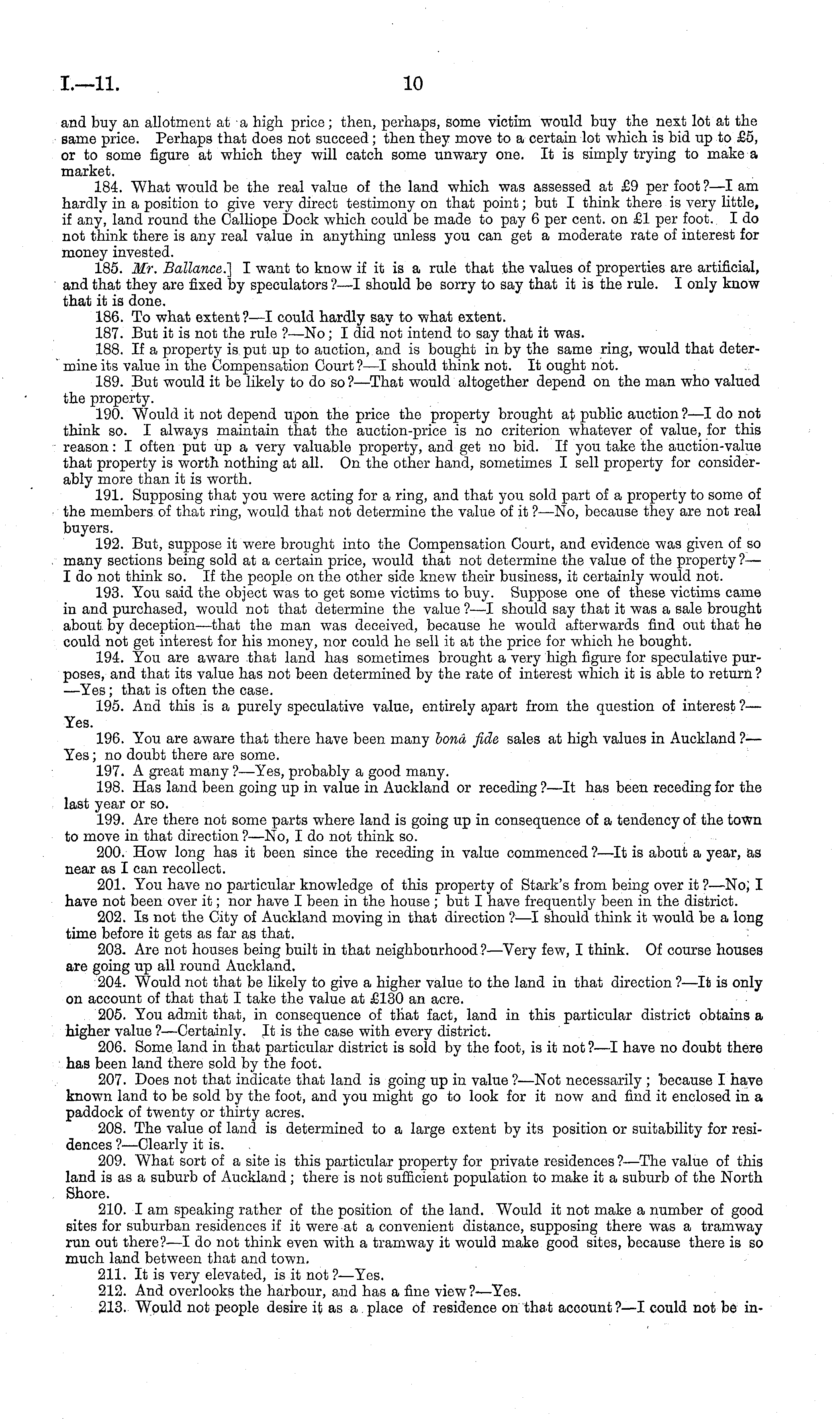 and buy an allotment at a high price; then, perhaps, some victim would buy the next lot at the same price. Perhaps that does not succeed; then they move to a certain lot which is bid up to £5, or to some figure at which they will catch some unwary one. It is simply trying to make a market. 184. What would be the real value of the land which was assessed at £9 per foot? —I am hardly in a position to give very direct testimony on that point; but I think there is very little, if any, land round the Calliope Dock which could be made to pay 6 per cent, on £1 per foot. Ido not think there is any real value in anything unless you can get a moderate rate of interest for money invested. 185. Mr. Ballance.'] I want to know if it is a rule that the values of properties are artificial, and that they are fixed by speculators ?—I should be sorry to say that it is the rule. I only know that it is done. 186. To what extent ? —I could hardly say to what extent. 187. But it is not the rule ? —No; I did not intend to say that it was. 188. If a property is put up to auction, and is bought in by the same ring, would that determine its value in the Compensation Court ? —I should think not. It ought not. 189. But would it be likely to do so ? —That would altogether depend on the man who valued the property. 190. Would it not depend upon the price the property brought at public auction ?—I do not think so. I always maintain that the auction-price is no criterion whatever of value, for this reason: I often put up a very valuable property, and get no bid. If you take the auction-value that property is worth nothing at all. On the other hand, sometimes I sell property for considerably more than it is worth. 191. Supposing that you were acting for a ring, and that you sold part of a property to some of the members of that ring, would that not determine the value of it ? —No, because they are not real buyers. 192. But, suppose it were brought into the Compensation Court, and evidence was given of so many sections being sold at a certain price, would that not determine the value of the property?— Ido not think so. If the people on the other side knew their business, it certainly would not. 193. You said the object was to get some victims to buy. Suppose one of these victims came in and purchased, would not that determine the value ?—I should say that it was a sale brought about, by deception—that the man was deceived, because he would afterwards find out that he could not get interest for his money, nor could he sell it at the price for which he bought. 194. You are aware that land has sometimes brought a very high figure for speculative purposes, and that its value has not been determined by the rate of interest which it is able to return ? —Yes; that is often the case. 195. And this is a purely speculative value, entirely apart from the question of interest ?— Yes. 196. You are aware that there have been many bond, fide sales at high values in Auckland ?— Yes; no doubt there are some. 197. A great many ?—Yes, probably a good many. 198. Has land been going up in value in Auckland or receding ?—lt has been receding for the last year or so. 199. Are there not some parts where land is going up in consequence of a tendency of the town to move in that direction ?—No, I do not think so. 200. How long has it been since the receding in value commenced ?—lt is about a year, as near as I can recollect. 201. You have no particular knowledge of this property of Stark's from being over it ?—No; I have not been over it; nor have I been in the house ; but I have frequently been in the district. 202. Is not the City of Auckland moving in that direction ? —I should think it would be a long time before it gets as far as that. ' 203. Are not houses being built in that neighbourhood ?—Very few, I think. Of course houses are going up all round Auckland. 204. Would not that be likely to give a higher value to the land in that direction ?—lt is only on account of that that I take the value at £130 an acre. 205. You admit that, in consequence of that fact, land in this particular district obtains a higher value ?—Certainly. It is the case with every district. 206. Some land in that particular district is sold by the foot, is it not?—l have no doubt there has been land there sold by the foot. 207. Does not that indicate that land is going up in value ?—Not necessarily ; because I have known land to be sold by the foot, and you might go to look for it now and find it enclosed in a paddock of twenty or thirty acres. 208. The value of land is determined to a large extent by its position or suitability for residences ?—Clearly it is. 209. What sort of a site is this particular property for private residences ?—The value of this land is as a suburb of Auckland ; there is not sufficient population to make it a suburb of the North Shore. 210. lam speaking rather of the position of the land. Would it not make a number of good sites for suburban residences if it were at a convenient distance, supposing there was a tramway run out there?'—l do not think even with a tramway it would make good sites, because there is so much land between that and town. 211. It is very elevated, is it not ?—Yes. 212. And overlooks the harbour, and has a fine view?— Yes. 213. Would not people desire it as a place of residence on that account?—l could not be in-