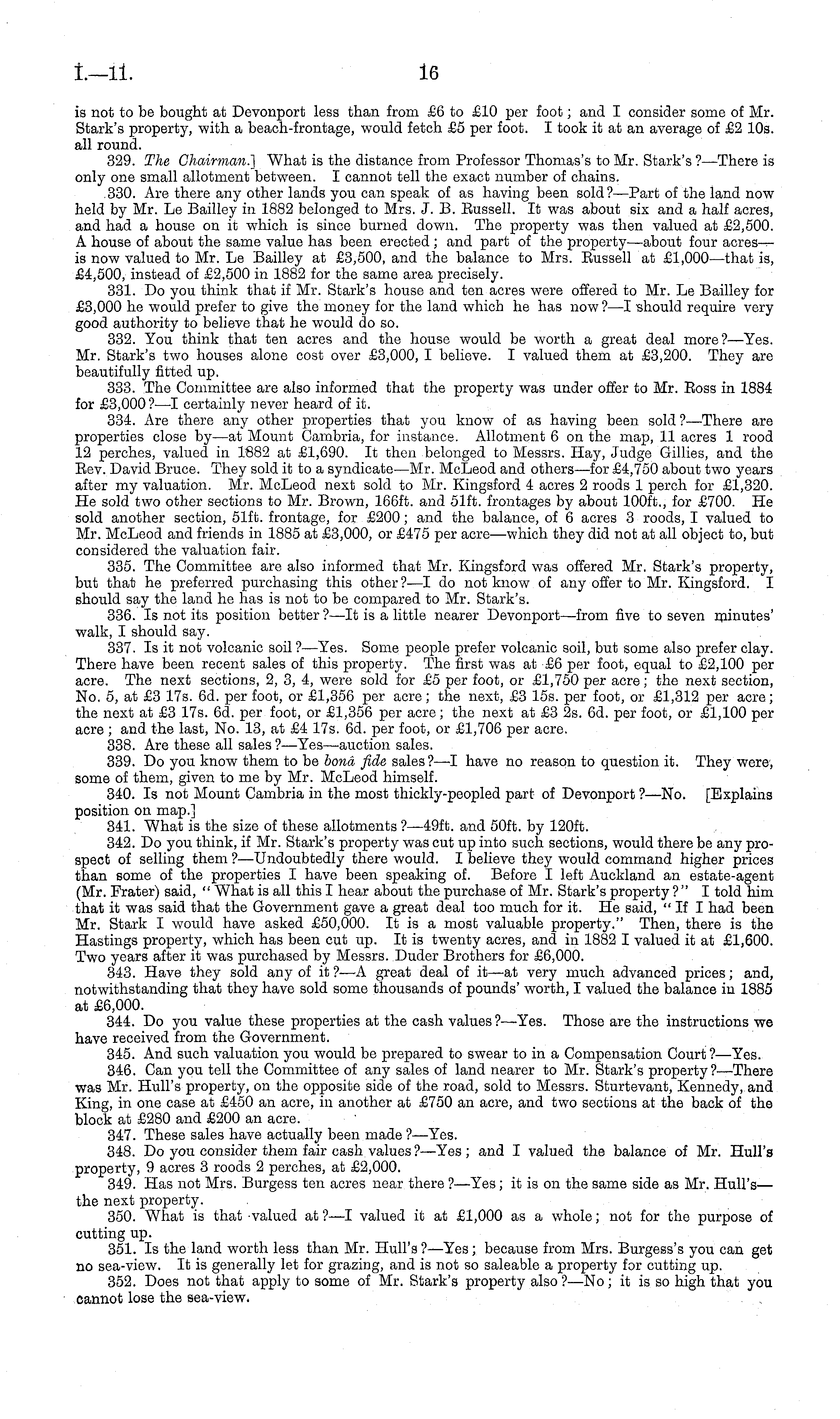 is not to be bought at Devonport less than from £6 to £10 per foot; and I consider some of Mr. Stark's property, with a beach-frontage, would fetch £5 per foot. I took it at an average of £2 10s. all round. 329. The Chairman.] What is the distance from Professor Thomas's to Mr. Stark's ?—There is only one small allotment between. I cannot tell the exact number of chains. .330. Are there any other lands you can speak of as having been sold?— Part of the land now held by Mr. Le Bailley in 1882 belonged to Mrs. J. B. Eussell. It was about six and a half acres, and had a house on it which is since burned down. The property was then valued at £2,500. A house of about the same value has been erected ; and part of the property—about four is now valued to Mr. Le Bailley at £3,500, and the balance to Mrs. Eussell at £1,000 —that is, £4,500, instead of £2,500 in 1882 for the same area precisely. 331. Do you think that if Mr. Stark's house and ten acres were offered to Mr. Le Bailley for £3,000 he would prefer to give the money for the land which he has now?—l ■should require very good authority to believe that he would do so. 332. You think that ten acres and the house would be worth a great deal more?— Yes. Mr. Stark's two houses alone cost over £3,000, I believe. I valued them at £3,200. They are beautifully fitted up. 333. The Committee are also informed that the property was under offer to Mr. Eoss in 1884 for £3,000? —I certainly never heard of it. 334. Are there any other properties that you know of as having been sold ?—There are properties close by—at Mount Cambria, for instance. Allotment 6 on the map, 11 acres 1 rood 12 perches, valued in 1882 at £1,690. It then belonged to Messrs. Hay, Judge Gillies, and the Eev. David Bruce. They sold it to a syndicate—Mr. McLeod and others—for £4,750 about two years after my valuation. Mr. McLeod next sold to Mr. Kingsford 4 acres 2 roods 1 perch for £1,320. He sold two other sections to Mr. Brown, 166 ft. and 51ft. frontages by about 100 ft., for £700. He sold another section, 51ft. frontage, for £200; and the balance, of 6 acres 3 roods, I valued to Mr. McLeod and friends in 1885 at £3,000, or £475 per acre —which they did not at all object to, but considered the valuation fair. 335. The Committee are also informed that Mr. Kingsford was offered Mr. Stark's property, but that he preferred purchasing this other?—l do not know of any offer to Mr. Kingsford. I should say the land he has is not to be compared to Mr. Stark's. 336. Is not its position better ?—lt is a little nearer Devonport—from five to seven minutes' walk, I should say. 337. Is it not volcanic soil ?—Yes. Some people prefer volcanic soil, but some also prefer clay. There have been recent sales of this property. The first was at £6 per foot, equal to £2,100 per acre. The next sections, 2, 3, 4, were sold for £5 per foot, or £1,750 per acre; the next section, No. 5, at £3 17s. 6d. per foot, or £1,356 per acre; the next, £3 15s. per foot, or £1,312 per acre; the next at £3 17s. 6d. per foot, or £1,356 per acre; the next at £3 2s. 6d. per foot, or £1,100 per acre ; and the last, No. 13, at £4 17s. 6d. per foot, or £1,706 per acre. 338. Are these all sales ?—Yes—auction sales. 339. Do you know them to be hona fide sales?—l have no reason to question it. They were, some of them, given to me by Mr. McLeod himself. 340. Is not Mount Cambria in the most thickly-peopled part of Devonport ?—No. [Explains position on map.] 341. What is the size of these allotments ?—49ft. and 50ft. by 120 ft. 342. Do you think, if Mr. Stark's property was cut up into such sections, would there be any prospect of selling them ?—Undoubtedly there would. I believe they would command higher prices than some of the properties I have been speaking of. Before I left Auckland an estate-agent (Mr. Prater) said, " What is all this I hear about the purchase of Mr. Stark's property ?" I told him that it was said that the Government gave a great deal too much for it. He said, "If I had been Mr. Stark I would have asked £50,000. It is a most valuable property." Then, there is the Hastings property, which has been cut up. It is twenty acres, and in 1882 I valued it at £1,600. Two years after it was purchased by Messrs. Duder Brothers for £6,000. 343. Have they sold any of it ? —A great deal of it—at very much advanced prices; and, notwithstanding that they have sold some thousands of pounds' worth, I valued the balance in 1885 at £6,000. 344. Do you value these properties at the cash values ? —Yes. Those are the instructions we have received from the Government. 345. And such valuation you would be prepared to swear to in a Compensation Court?— Yes. 346. Can you tell the Committee of any sales of land nearer to Mr. Stark's property?—-There was Mr. Hull's property, on the opposite side of the road, sold to Messrs. Sturtevant, Kennedy, and King, in one case at £450 an acre, in another at £750 an acre, and two sections at the back of the block at £280 and £200 an acre. 347. These sales have actually been made ?—Yes. 348. Do you consider them fair cash values ?—Yes ; and I valued the balance of Mr. Hull's property, 9 acres 3 roods 2 perches, at £2,000. 349. Has not Mrs. Burgess ten acres near there ? —Yes; it is on the same side as Mr. Hull's— the next property. 350. What is that valued at ? —I valued it at £1,000 as a whole; not for the purpose of cutting up. 351. Is the land worth less than Mr. Hull's?— Yes; because from Mrs. Burgess's you can get no sea-view. It is generally let for grazing, and is not so saleable a property for cutting up. 352. Does not that apply to some of Mr. Stark's property also ?—No; it is so high that you cannot lose the sea-view.