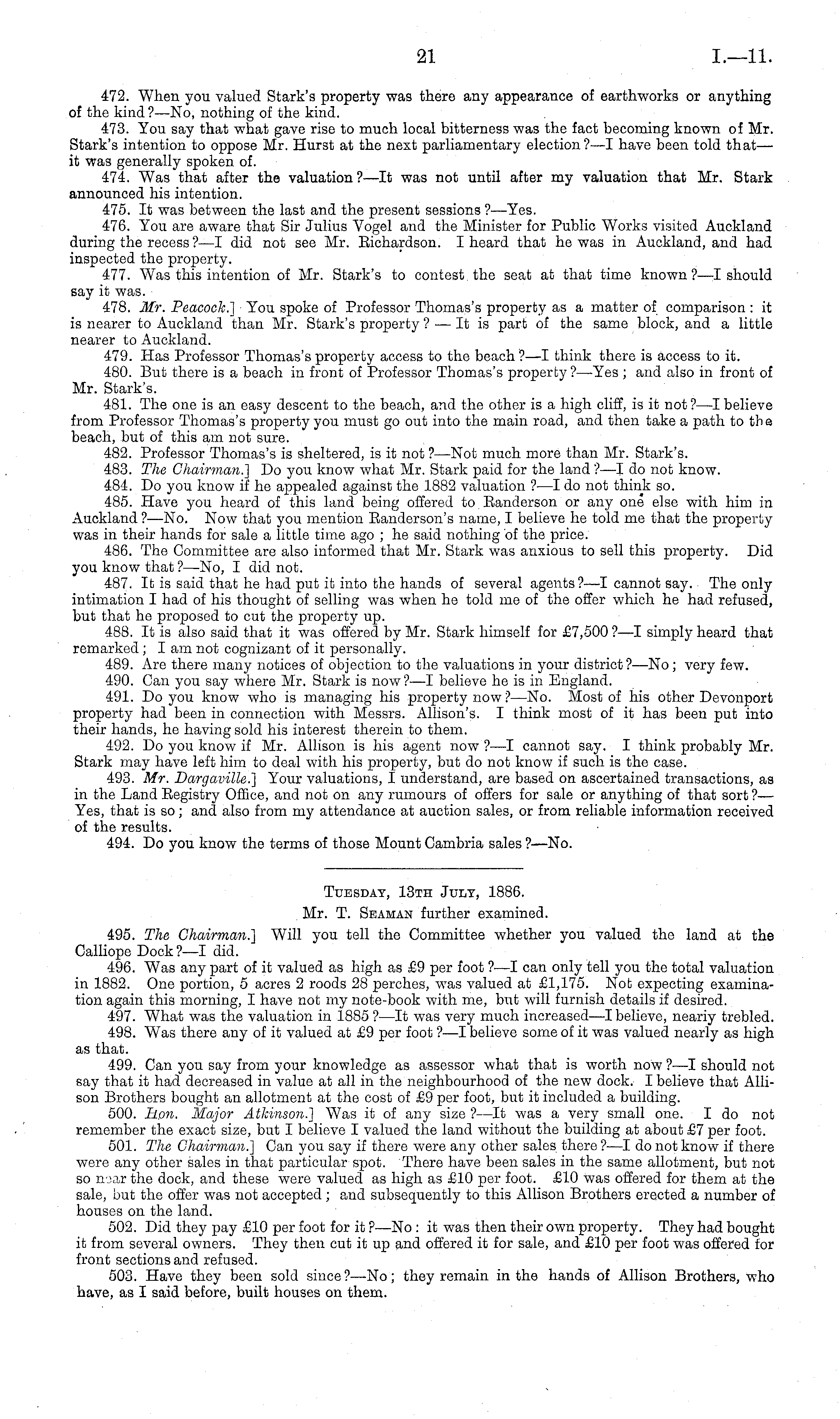 472. When you valued Stark's property was there any appearance of earthworks or anything of the kind ?—No, nothing of the kind. 473. You say that what gave rise to much local bitterness was the fact becoming known of Mr. Stark's intention to oppose Mr. Hurst at the next parliamentary election?—l have been told that— it was generally spoken of. 474. Was that after the valuation ?—lt was not until after my valuation that Mr. Stark announced his intention. 475. It was between the last and the present sessions ? —Yes. 476. You are aware that Sir Julius Vogel and the Minister for Public Works visited Auckland during the recess ? —I did not see Mr. Eichardson. I heard that he was in Auckland, and had inspected the property. 477. Was this intention of Mr. Stark's to contest the seat at that time known ?—I should say it was. 478. Mr. Peacock.] You spoke of Professor Thomas's property as a matter of comparison :it is nearer to Auckland than Mr. Stark's property ? —It is part of the same block, and a little nearer to Auckland. 479. Has Professor Thomas's property access to the beach ?—I think there is access to it. 480. But there is a beach in front of Professor Thomas's property ?—Yes ; and also in front of Mr. Stark's. 481. The one is an easy descent to the beach, and the other is a high cliff, is it not?—l believe from Professor Thomas's property you must go out into the main road, and then take a path to th c beach, but of this am not sure. 482. Professor Thomas's is sheltered, is it not ?—Not much more than Mr. Stark's. 483. The Chairman.] Do you know what Mr. Stark paid for the land ?—I do not know. 484. Do you know if he appealed against the 1882 valuation ?—I do not think so. 485. Have you heard of this land being offered to Eanderson or any one else with him in Auckland ?—No. Now that you mention Eanderson's name, I believe he told me that the property was in their hands for sale a little time ago ; he said nothing of the price. 486. The Committee are also informed that Mr. Stark was anxious to sell this property. Did you know that ?—No, I did not. 487. It is said that he had put it into the hands of several agents? —I cannot say. The only intimation I had of his thought of selling was when he told me of the offer which he had refused, but that he proposed to cut the property up. 488. It is also said that it was offered by Mr. Stark himself for £7,500 ?—I simply heard that remarked ; I am not cognizant of it personally. 489. Are there many notices of objection to the valuations in your district ? —No; very few. 490. Can you say where Mr. Stark is now? —I believe he is in England. 491. Do you know who is managing his property now?— No. Most of his other Devonport property had been in connection with Messrs. Allison's. I think most of it has been put into their hands, he having sold his interest therein to them. 492. Do you know if Mr. Allison is his agent now ? —I cannot say. I think probably Mr. Stark may have left him to deal with his property, but do not know if such is the case. 493. Mr. Dargaville.] Your valuations, I understand, are based on ascertained transactions, as in the Land Eegistry Office, and not on any rumours of offers for sale or anything of that sort ?— Yes, that is so; and also from my attendance at auction sales, or from reliable information received of the results. 494. Do you know the terms of those Mount Cambria sales ?—No.