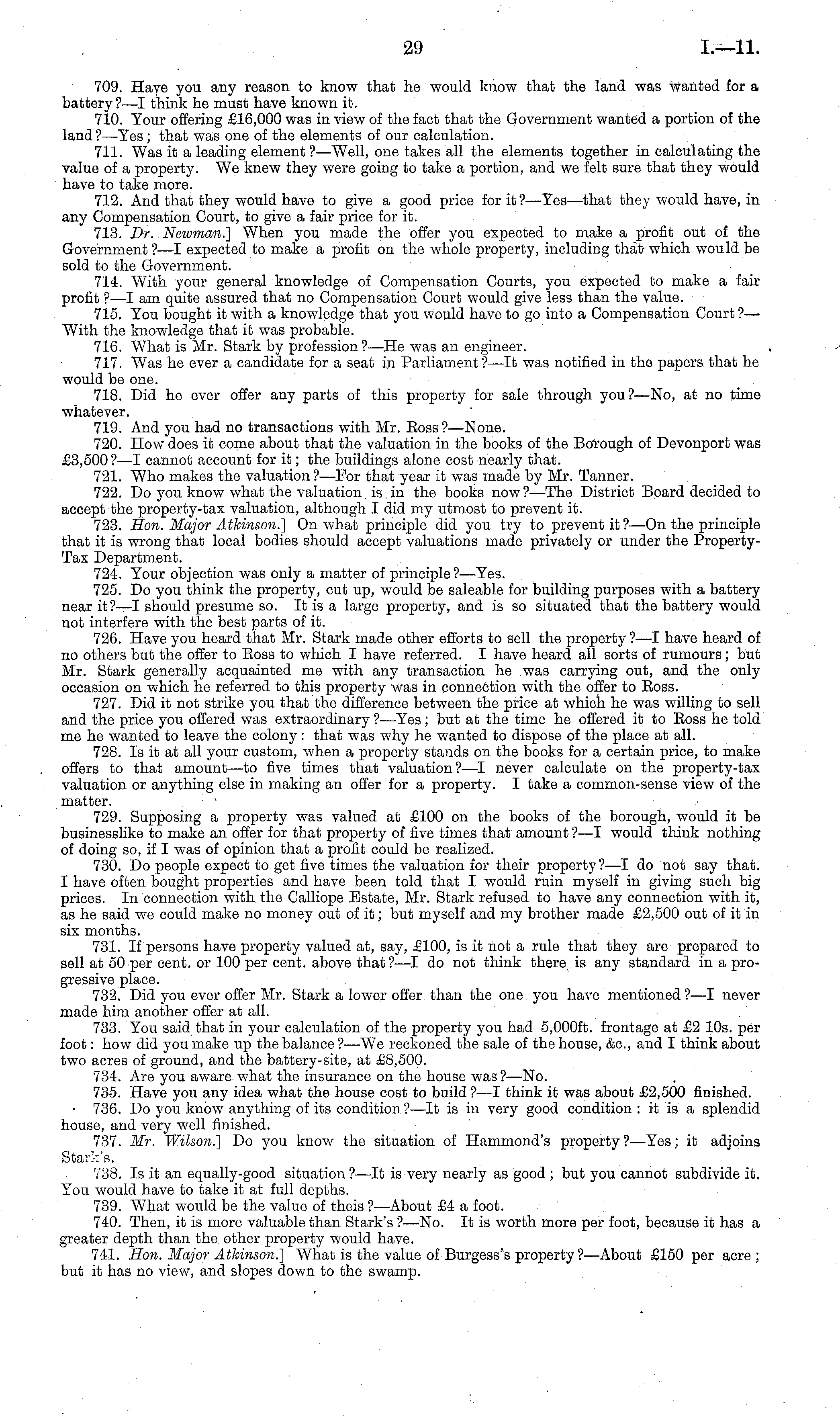 709. Have you any reason to know that he would know that the land was wanted for a battery?—l think he must have known it. 710. Your offering £16,000 was in view of the fact that the Government wanted a portion of the land?— Yes; that was one of the elements of our calculation. 711. Was it a leading element? —Well, one takes all the elements together in calculating the value of a property. We knew they were going to take a portion, and we felt sure that they would have to take more. 712. And that they would have to give a good price for it ?—Yes—that they would have, in any Compensation Court, to give a fair price for it. 713. Dr. Newman.'] When you made the offer you expected to make a profit out of the Government ? —I expected to make a profit on the whole property, including that- which would be sold to the Government. 714. With your general knowledge of Compensation Courts, you expected to make a fair profit ? —I am quite assured that no Compensation Court would give less than the value. 715. You bought it with a knowledge that you would have to go into a Compensation Court ?— With the knowledge that it was probable. 716. What is Mr. Stark by profession ?—He was an engineer. 717. Was he ever a candidate for a seat in Parliament ?—lt was notified in the papers that he would be one. 718. Did he ever offer any parts of this property for sale through you?—No, at no time whatever. 719. And you had no transactions with Mr. Eoss?—None. 720. How does it come about that the valuation in the books of the Borough of Devonport was £3,500? —I cannot account for it; the buildings alone cost nearly that. 721. Who makes the valuation?— For that year it was made by Mr. Tanner. 722. Do you know what the valuation is in the books now? —The District Board decided to accept the property-tax valuation, although I did my utmost to prevent it. 723. Hon. Major Atkinson.'] On what principle did you try to prevent it ?—On the principle that it is wrong that local bodies should accept valuations made privately or under the PropertyTax Department. 724. Your objection was only a matter of principle ?—Yes. 725. Do you think the property, cut up, would be saleable for building purposes with a battery near it?—l should presume so. It is a large property, and is so situated that the battery would not interfere with the best parts of it. 726. Have you heard that Mr. Stark made other efforts to sell the property ?—I have heard of no others but the offer to Eoss to which I have referred. I have heard all sorts of rumours; but Mr. Stark generally acquainted me with any transaction he was carrying out, and the only occasion on which he referred to this property was in connection with the offer to Eoss. 727. Did it not strike you that the difference between the price at which he was willing to sell arid the price you offered was extraordinary ?—Yes; but at the time he offered it to Eoss he told me he wanted to leave the colony : that was why he wanted to dispose of the place at all. 728. Is it at all your custom, when a property stands on the books for a certain price, to make offers to that amount —to five times that valuation?—l never calculate on the property-tax valuation or anything else in making an offer for a property. I take a common-sense view of the matter. 729. Supposing a property was valued at £100 on the books of the borough, would it be businesslike to make an offer for that property of five times that amount ?—I would think nothing of doing so, if I was of opinion that a profit could be realized. 730. Do people expect to get five times the valuation for their property?—l do not say that. I have often bought properties and have been told that I would ruin myself in giving such big prices. In connection with the Calliope Estate, Mr. Stark refused to have any connection with it, as he said we could make no money out of it; but myself and my brother made £2,500 out of it in six months. 731. If persons have property valued at, say, £100, is it not a rule that they are prepared to sell at 50 per cent, or 100 per cent, above that?—l do not think there i is any standard in a progressive place. 732. Did you ever offer Mr. Stark a lower offer than the one you have mentioned?—l never made him another offer at all. 733. You said that in your calculation of the property you had 5,000 ft. frontage at £2 10s. per foot: how did you make up the balance ? —We reckoned the sale of the house, &c, and I think about two acres of ground, and the battery-site, at £8,500. 734. Are you aware what the insurance on the house was?— No. 735. Have you any idea what the house cost to build ? —I think it was about £2,500 finished. • 736. Do you know anything of its condition ? —lt is in very good condition : it is a splendid house, and very well finished. 737. Mr. Wilson.] Do you know the situation of Hammond's property?— Yes; it adjoins Stark's. 738. Is it an equally-good situation ?—lt is very nearly as good ; but you cannot subdivide it. You would have to take it at full depths. 739. What would be the value of theis ? —About £4 a foot. 740. Then, it is more valuable than Stark's ?—No. It is worth more per foot, because it has a greater depth than the other property would have. 741. Hon. Major Atkinson.] What is the value of Burgess's property ? —About £150 per acre; but it has no view, and slopes down to the swamp.