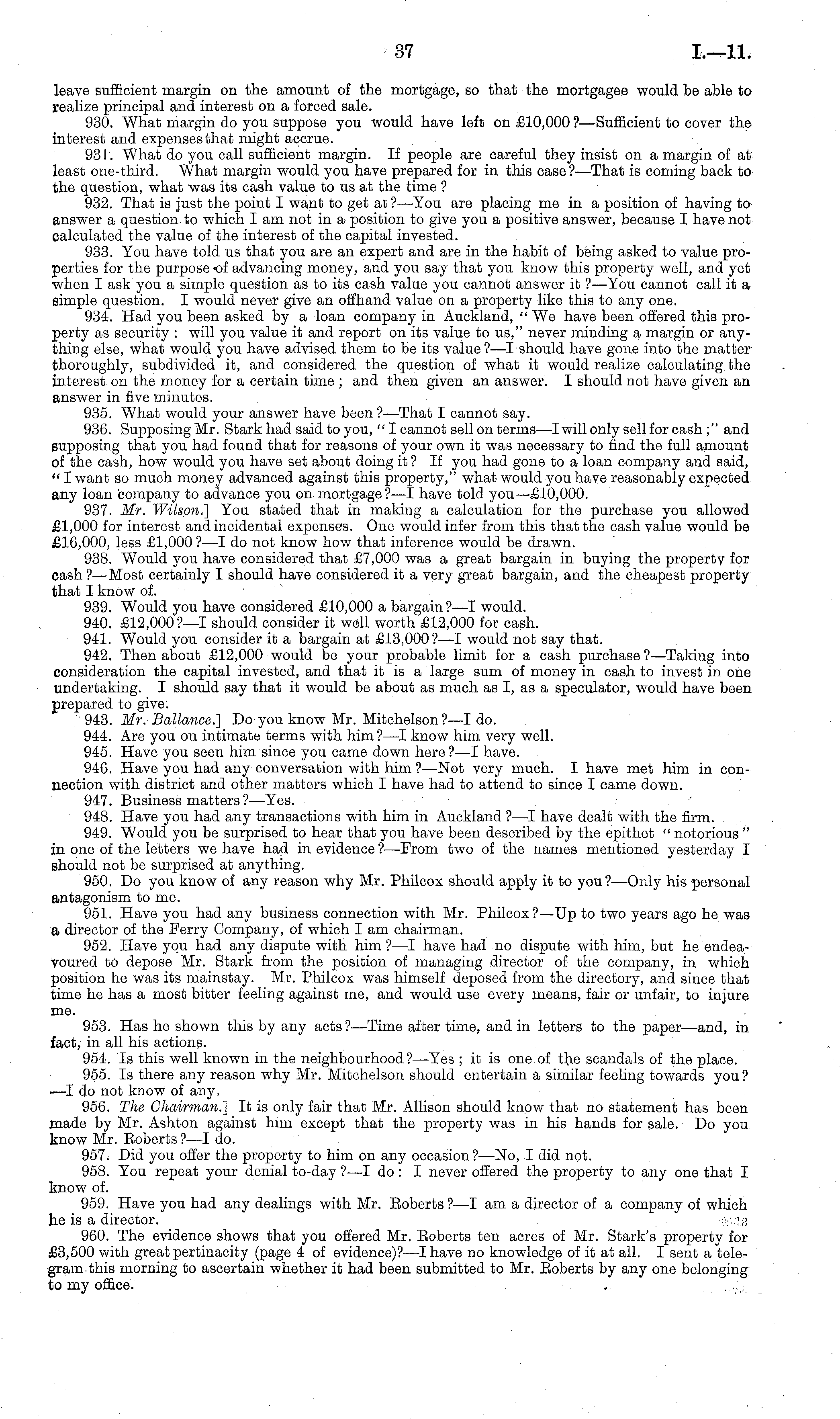 leave sufficient margin on the amount of the mortgage, so that the mortgagee would be able to realize principal and interest on a forced sale. 930. What margin do you suppose you would have left on £10,000? —Sufficient to cover the interest and expenses that might accrue. 931. What do you call sufficient margin. If people are careful they insist on a margin of at least one-third. What margin would you have prepared for in this case? —That is coming back to the question, what was its cash value to us at the time ? 932. That is just the point I want to get at?— You are placing me in a position of having to answer a question to which I am not in a position to give you a positive answer, because I have not calculated the value of the interest of the capital invested. 933. You have told us that you are an expert and are in the habit of being asked to value properties for the purpose of advancing money, and you say that you know this property well, and yet when I ask you a simple question as to its cash value you cannot answer it ? —You cannot call it a simple question. I would never give an offhand value on a property like this to any one. 934. Had you been asked by a loan company in Auckland, " We have been offered this property as security : will you value it and report on its value to us," never minding a margin or anything else, what would you have advised them to be its value?—l should have gone into the matter thoroughly, subdivided it, and considered the question of what it would realize calculating the interest on the money for a certain time ; and then given an answer. I should not have given an answer in five minutes. 935. What would your answer have been ?—That I cannot say. 936. Supposing Mr. Stark had said to you, " I cannot sell on terms—l will only sell for cash ;" and supposing that you had found that for reasons of your own it was necessary to find the full amount of the cash, how would you have set about doing it ? If you had gone to a loan company and said, " I want so much money advanced against this property," what would you have reasonably expected any loan company to advance you on mortgage? —I have told you—£lo,ooo. 937. Mr. Wilson.] You stated that in making a calculation for the purchase you allowed £1,000 for interest and incidental expenses. One would infer from this that the cash value would be £16,000, less £1,000 ?—I do not know how that inference would be drawn. 938. Would you have considered that £7,000 was a great bargain in buying the property for cash? —Most certainly I should have considered it a very great bargain, and the cheapest property that I know of. 939. Would you have considered £10,000 a bargain?—l would. 940. £12,000 ?—I should consider it well worth £12,000 for cash. 941. Would you consider it a bargain at £13,000? —I would not say that. 942. Then about £12,000 would be your probable limit for a cash purchase?— Taking into consideration the capital invested, and that it is a large sum of money in cash to invest in one undertaking. I should say that it would be about as much as I, as a speculator, would have been prepared to give. 943. Mr. Ballance.] Do you know Mr. Mitchelson?—l do. 944. Are you on intimate terms with him?—l know him very well. 945. Have you seen him since you came down here?—l have. 946. Have you had any conversation with him ?—Not very much. I have met him in connection with district and other matters which I have had to attend to since I came down. 947. Business matters?— Yes. 948. Have you had any transactions with him in Auckland ? —I have dealt with the firm. 949. Would you be surprised to hear that you have been described by the epithet " notorious " in one of the letters we have had in evidence ?—Frorn two of the names mentioned yesterday I should not be surprised at anything. 950. Do you know of any reason why Mr. Philcox should apply it to you?—Oiiiy his personal antagonism to me. 951. Have you had any business connection with Mr. Philcox?—Up to two years ago he was a director of the Ferry Company, of which I am chairman. 952. Have you had any dispute with him ? —I have had no dispute with him, but he endeavoured to depose Mr. Stark from the position of managing director of the company, in which position he was its mainstay. Mr. Philcox was himself deposed from the directory, and since that time he has a most bitter feeling against me, and would use every means, fair or unfair, to injure me. 953. Has he shown this by any acts ?—Time after time, and in letters to the paper—and, in fact, in all his actions. 954. Is this well known in the neighbourhood?— Yes ; it is one of the scandals of the place. 955. Is there any reason why Mr. Mitchelson should entertain a similar feeling towards you? —I do not know of any, 956. The Chairman.] It is only fair that Mr. Allison should know that no statement has been made by Mr. Ashton against him except that the property was in his hands for sale. Do you know Mr. Eoberts ? —I do. 957. Did you offer the property to him on any occasion ?—No, I did not. 958. You repeat your denial to-day ?—I do : I never offered the property to any one that I know of. 959. Have you had any dealings with Mr. Eoberts ?—I am a director of a company of which he is a director. d-MI.S 960. The evidence shows that you offered Mr. Eoberts ten acres of Mr. Stark's property for £3,500 with great pertinacity (page 4of evidence)? —I have no knowledge of it at all. I sent a telegram this morning to ascertain whether it had been submitted to Mr. Eoberts by any one belonging to my office.