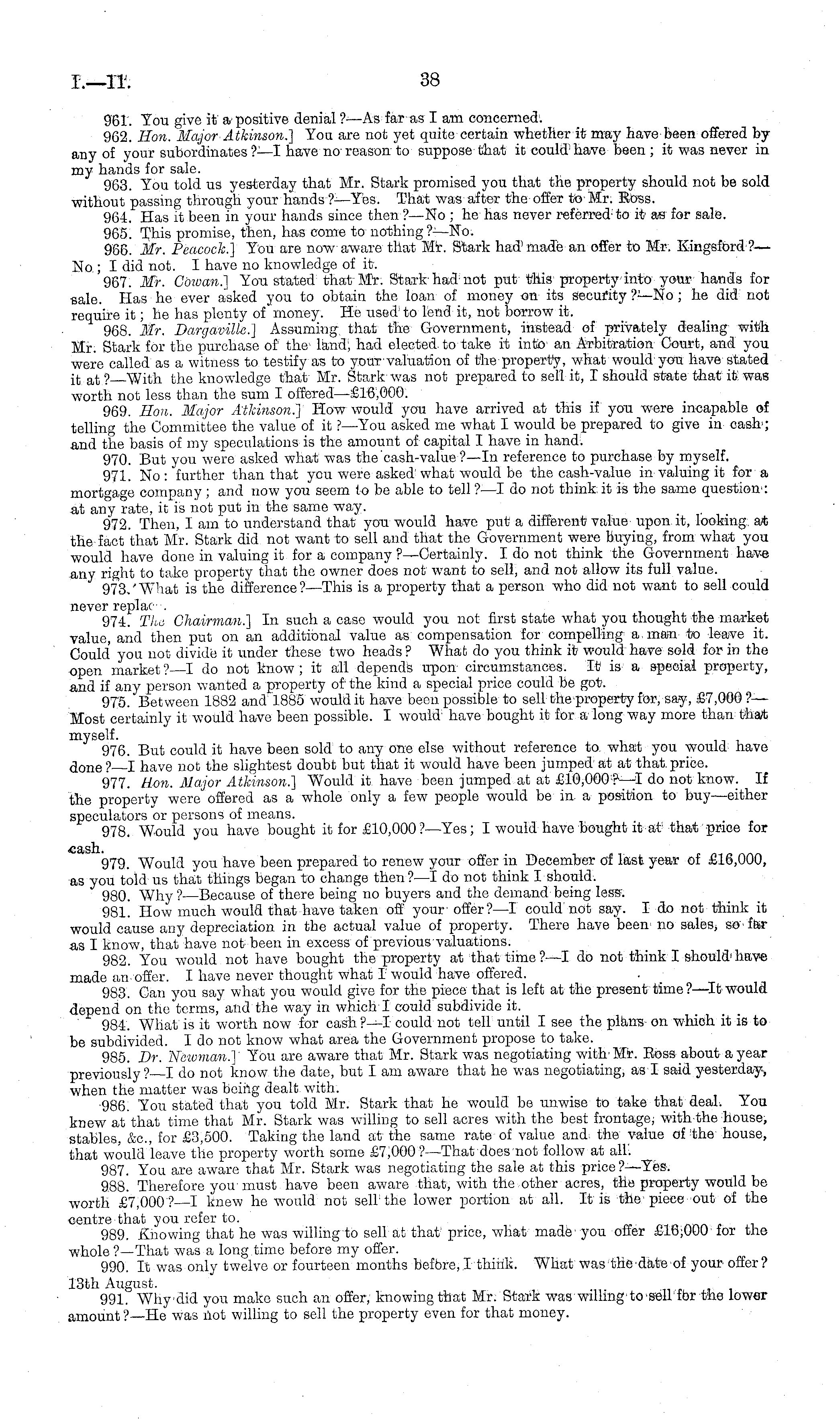 961. You give it a positive denial ?—As far as lam concerned. 962. Hon. Major Atkinson.} You are not yet quite certain whether it may have been offered by any of your subordinates ?-—I have no reason to suppose that it could have been ;it was never in my hands for sale. 963. You told us yesterday that Mr. Stark promised you that the property should not be sold without passing through your hands ? —Yes. That was after the offer to Mr. Eoss. 964. Has it been in your hands since then ?—No ; he has never referred to it as for sale. 965. This promise, then, has come to nothing? —No. 966. Mr. Peacock.] You are now aware that Mr. Stark had made an offer to Mr. Eingsford ?— No ; I did not. I have no knowledge of it. 967. Mr. Gbwan.} You stated that Mr. Stark had not put this property into your hands for sale. Has he ever asked you to obtain the loan of money on its security ?— No ; he did not require it; he has plenty of money. Ho used to lend it, not borrow it. 968. Mr. Dargavillo.] Assuming that the Government, instead of privately dealing with Mr. Stark for the purchase of the land, had elected to take it into an Arbitration Court, and you were called as a witness to testify as to your valuation of the property, what would you have stated it a t ? With the knowledge that Mr. Stark was not prepared to sell it, I should state that it was worth not less than the sum I offered—£l6,ooo. 969. Hon. Major Atkinson.] How would you have arrived at this if you were incapable of telling the Committee the value of it ? —You asked me what I would be prepared to give in cash; and the basis of my speculations is the amount of capital I have in hand. 970. But you were asked what was the cash-value ?—ln reference to purchase by myself. 971. No: further than that you were asked , what would bo the cash-value in valuing it for a mortgage company ; and now you seem to be able to tell ? —I do not think it is the same question : at any rate, it is not put in the same way. 972. Then, I am to understand that you would have put a different value upon it, looking at the fact that Mr. Stark did not want to sell and that the Government were buying, from what you would have done in valuing it for a company ?—Certainly. I do not think the Government have any right to take property that the owner does not want to sell, and not allow its full value. 973.'What is the difference? —This is a property that a person who did not want to sell could never replac . 974. The Chairman.] In such a case would you not first state what you thought the market value, and then put on an additional value as compensation for compelling a man to leave it. Could you not divide it under these two heads? What do you think it would have sold for in the open market ? —I do not know ;it all depends upon circumstances. It is a special property, and if any person wanted a property of the kind a special price could be got. 975. Between 1882 and 1885 would it have been possible to sell the property for, say, £7,000 ?— Most certainly it would have been possible. I would have bought it for a long way more than that myself. 976. But could it have been sold to any one else without reference to what you would have done? I have not the slightest doubt but that it would have been jumped at at that price. 977. Hon. A/ajor Atkinson.] Would it have been jumped at at £10,000? —I do not know. If the property were offered as a whole only a few people would be in a position to buy—either speculators or persons of means. 978. Would you have bought it for £10,000? —Yes; I would have bought it at that price for cash. 979. Would you have been prepared to renew your offer in December of last year of £16,000, as you told us that things began to change then ?—1 do not think I should. 980. Why ?—Because of there being no buyers and the demand being less. 981. How much would that have taken off your offer? —I could not say. Ido not think it would cause any depreciation in the actual value of property. There have been no sales, so far as I know, that have not been in excess of previous valuations. 982. You would not have bought the property at that time ? —I do not think I should' have made an offer. I have never thought what I would have offered. 983. Can you say what you would give for the piece that is left at the present time? —It would depend on the terms, and the way in which I could subdivide it. 984. What is it worth now for cash ?—I could not tell until I see the plans on which it is to be subdivided. Ido not know what area the Government propose to take. 985. Dr. Nczvman.] You are aware that Mr. Stark was negotiating with Mr. Eoss about a year previously? Ido not know the date, but lam aware that he was negotiating, as I said yesterday, when the matter was being dealt with. ■986. You stated that you told Mr. Stark that he would be unwise to take that deal. You knew at that time that Mr. Stark was willing to sell acres with the best frontage, with the house, stables, &c, for £3,500. Taking the land at the same rate of value and the value of the house, that would leave the property worth some £7,000 ?—That does not follow at all. 987. You are aware that Mr. Stark was negotiating the sale at this price?— Yes. 988. Therefore you must have been aware that, with the other acres, the property would be worth £7,000 ? I knew he would not sell the lower portion at all. It is the piece out of the centre that you refer to. 989. Knowing that he was willing to sell at that price, what made you offer £16,000 for the ■whole ?—That was a long time before my offer. 990. It was only twelve or fourteen months before, I think. What was the date of your offer? 13th August. 991. Why did you make such an offer, knowing that Mr. Stark was willing to sell for the lower amount ?—He was not willing to sell tho property even for that money.