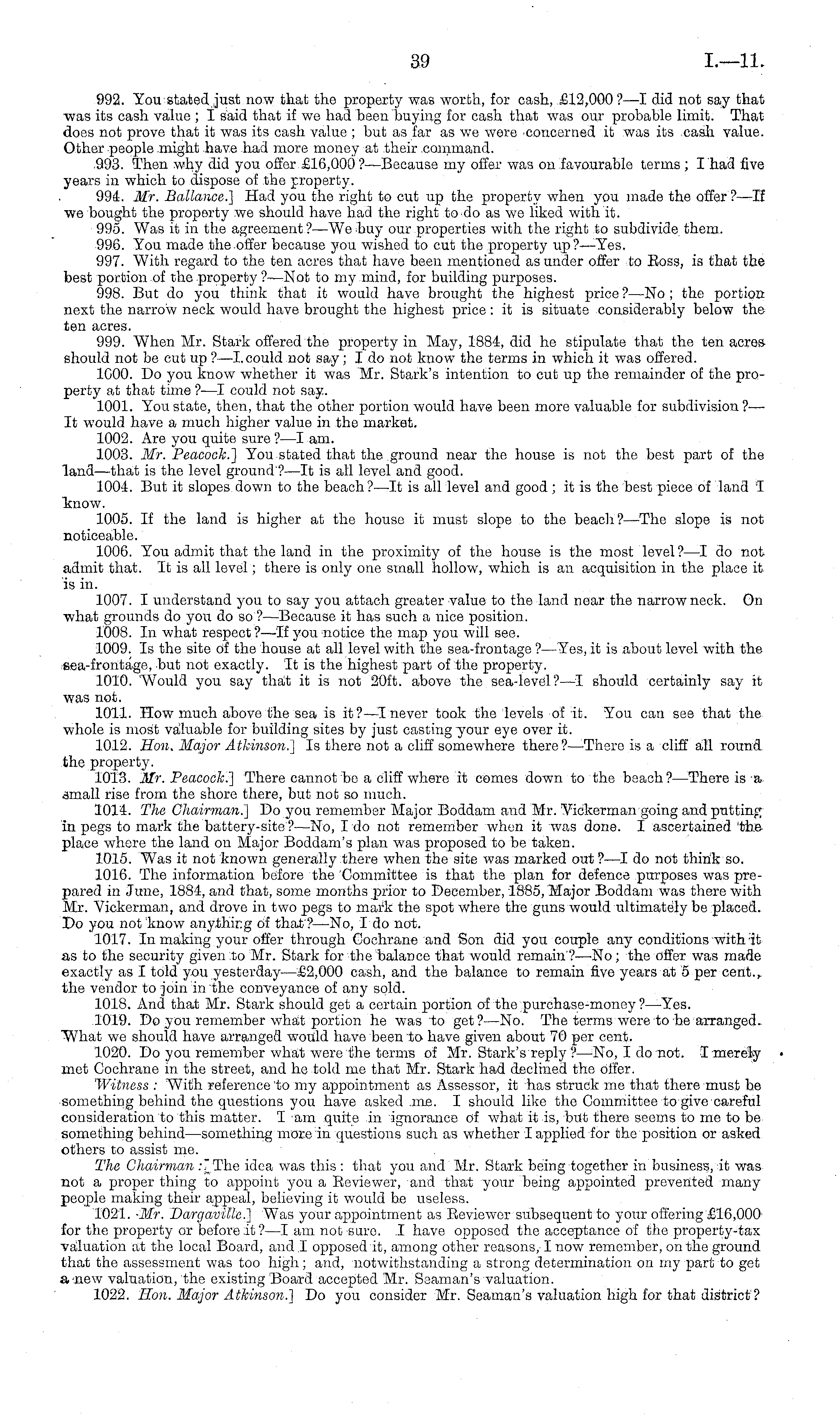 992. You stated just now that the property was worth, for cash, £12,000 ?—I did not say that ■was its cash value ; I said that if we had been, buying for cash that was our probable limit. That does not prove that it was its cash value ; but as far as we wero concerned it was its cash value. Other people might have had more money at their command. 993. Then why did you offer £16,000 ?—Because my offer was on favourable terms ; I had five years in which to dispose of the property. 994. Mr. Ballance.] Had you the right to cut up the property when you made the offer ?—lf we bought the property we should have had the right to do as we liked with it. 995. Was it in the agreement?—We buy our properties with the right to subdivide them. 996. You made the offer because you wished to cut the property up ?—Yes. 997. With regard to the ten acres that have been mentioned asunder offer to Eoss, is that the best portion of the property ?—Not to my mind, for building purposes. 998. But do you think that it would have brought the highest price ?—No ; the portion next the narrow neck would have brought the highest price : it is situate considerably below the ten acres. 999. When Mr. Stark offered the property in May, 1884, did he stipulate that the ten acres should not be cut up ? —I. could not say ;I do not know the terms in which it was offered. ICOO. Do you know whether it was Mr. Stark's intention to cut up the remainder of the property at that time ?—I could not say. 1001. You state, then, that the other portion would have been more valuable for subdivision ?■— It would have a much higher value in the market. 1002. Are you quite sure ? —I am. 1003. Mr. You stated that the ground near the house is not the best part of the land—that is the level ground ?—lt is all level and good. 1004. But it slopes down to the beach?—lt is all level and good ; it is the best piece of land I Toiow. 1005. If the land is higher at the house it must slope to the beach?— The slope is not noticeable. 1006. You admit that the land in the proximity of the house is the most level?—l do not admit that. It is all level; there is only one small hollow, which is an acquisition in the place it is in. 1007. I understand you to say you attach greater value to the land near the narrow nock. On what grounds do you do so ?—Because it has such a nice position. 1008. In what respect ? —lf you notice the map you will see. 1009. Is the site of the house at all level with the sea-frontage ?—Yes, it is about level with the sea-frontage, but not exactly. It is the highest part of the property. 1010. Would you say that it is not 20ft. above the sea-level? —I should certainly say it was not. 1011. How much above the sea is it? —I never took the levels of it. You can see that the whole is most valuable for building sites by just casting your eye over it. 1012. Hon. Major Atkinson.] Is there not a cliff somewhere there?—Thare is a cliff all round the property. 1013. Mr. Peacock.'] There cannot be a cliff where it comes down to the beach?— There is a amall rise from the shore there, but not so much. 1014. The Chairman.] Do you remember Major Boddam and Mr. Vickerman going and putting in pegs to mark the battery-site?—No, Ido not remember when it was done. I ascertained th& place whore the land on Major Boddam's plan was proposed to be taken. 1015. Was it not known generally there when the site was marked out ?—I do not think so. 1016. The information before the Committee is that the plan for defence purposes was prepared in June, 1884, and that, some months prior to December, 1885, Major Boddam was there with Mr. Vickerman, and drove in two pegs to mark the spot where the guns would ultimately be placed. Do you not know anything of that ? —No, I do not. 1017. In making your offer through Cochrane and Son did you couple any conditions with it as to the security given to Mr. Stark for the balance that would remain ?—No ; the offer was made exactly as I told you yesterday —£2,000 cash, and the balance to remain five years at 5 per cent.,, the vendor to join in the conveyance of any sold. 1018. And that Mr. Stark should get a certain portion of the purchase-money ? —Yes. 1019. Do you remember what portion he was to get ? —No. The terms were to be arranged. What we should have arranged would have been to- have given about 70 per cent. 1020. Do you remember what were the terms of Mr. Stark's reply?—No, Ido not. I merely met Cochrane in the street, and he told me that Mr. Stark had declined the offer. Witness : With reference to my appointment as Assessor, it has struck me that there must be something behind the questions you have asked mo. I should like the Committee to give careful consideration to this matter. I am quite in ignorance of what it is, but there seems to me to be something behind—something more in questions such as whether I applied for the position or asked others to assist me. The Chairman :7 The idea was this : that you and Mr. Stark being together in business, it was not a proper thing to appoint you a Beviewer, and that your being appointed prevented many people making their appeal, believing it would be useless. 1021. -Mr. DargaviUe.] Was your appointment as Eeviewer subsequent to your offering £16,000 for the property or before it ?—I am not sure. I have opposed the acceptance of the property-tax valuation at the local Board, and I opposed it, among other reasons, I now remember, on the ground that the assessment was too high; and, notwithstanding a strong determination on my part to get a new valuation, the existing Board accepted Mr. Seaman's valuation. 1022. Hon. Major Atkinson.'] Do you consider Mr. Seaman's valuation high for that district?